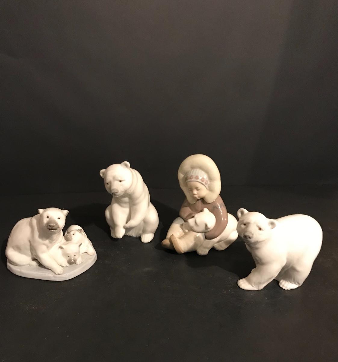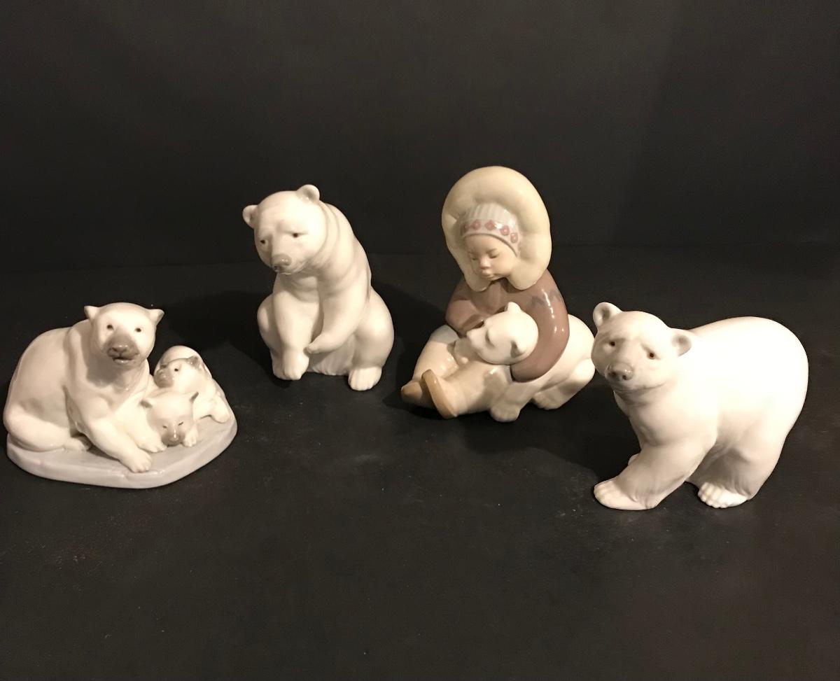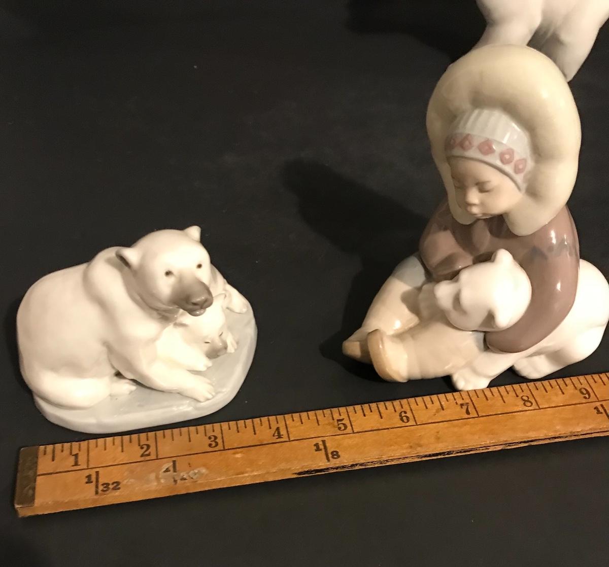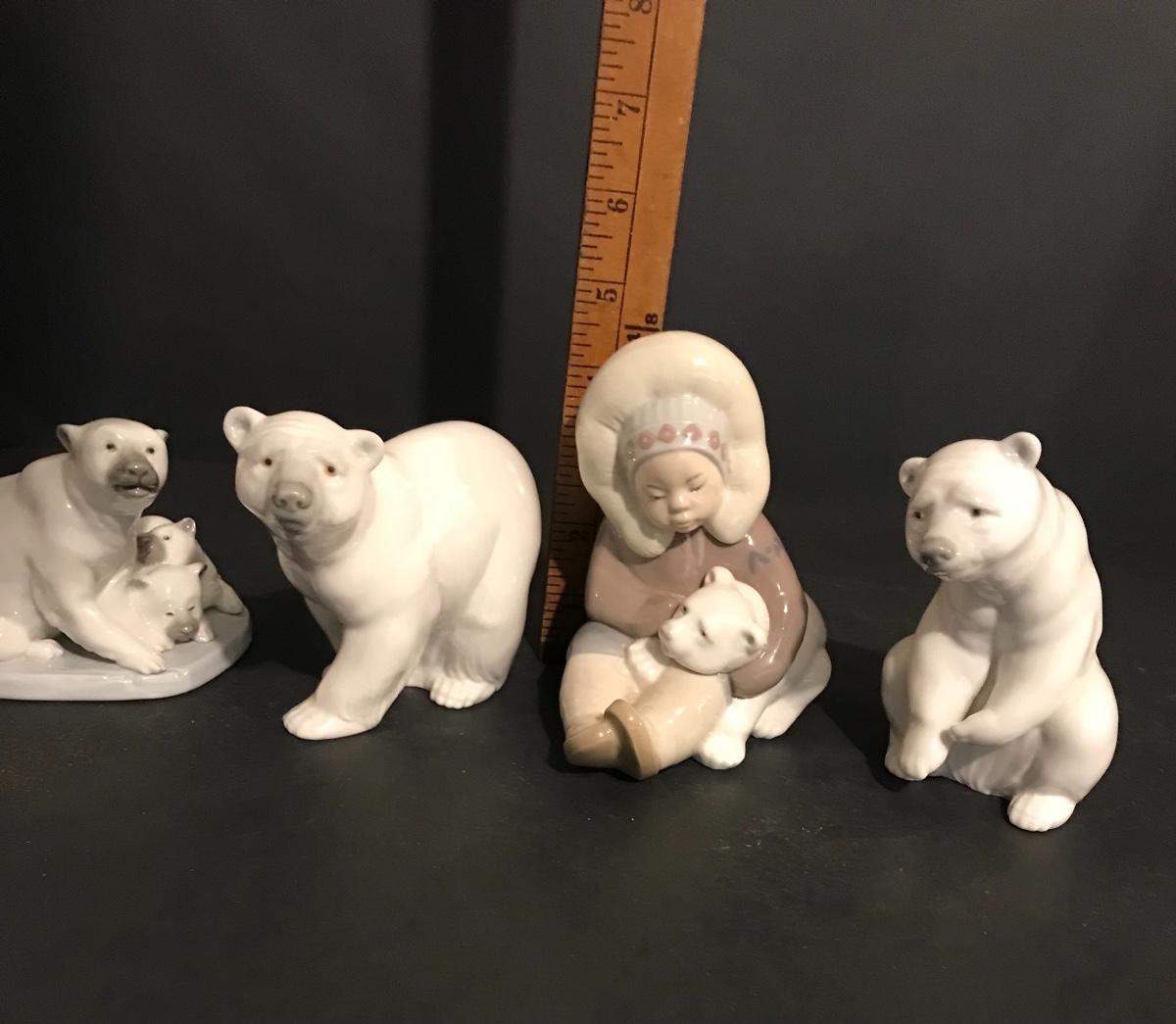 Seated Polar Bear #2209, Eskimo Child With Polar Bear #1195, Attentive Polar Bear #1207 And Mini Polar Bear #5434. All Lladros are in excellent vintage condition without original boxes, except where noted. All items have been inspected and any damages or imperfections have been photographed and noted to the best of our knowledge and ability. It is the responsibility of the buyer to inspect all pictures, as they are the best representation of the items. The pictures show condition, measurements if taken, and what is included in the lot. Upon pickup, it is the responsibility of the buyer to inspect their items prior to leaving the premises. Once the items leave the premises, there will be no refunds or returns. Buyers are also responsible for bringing their own boxes and packing materials for their items. Thank you.