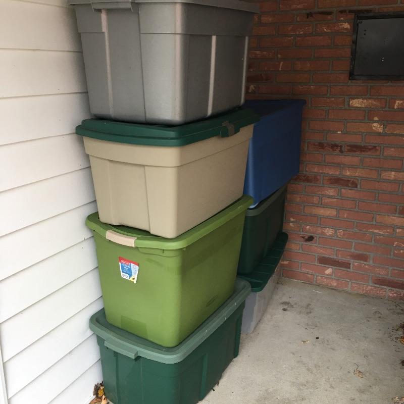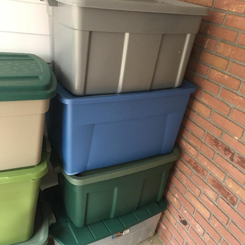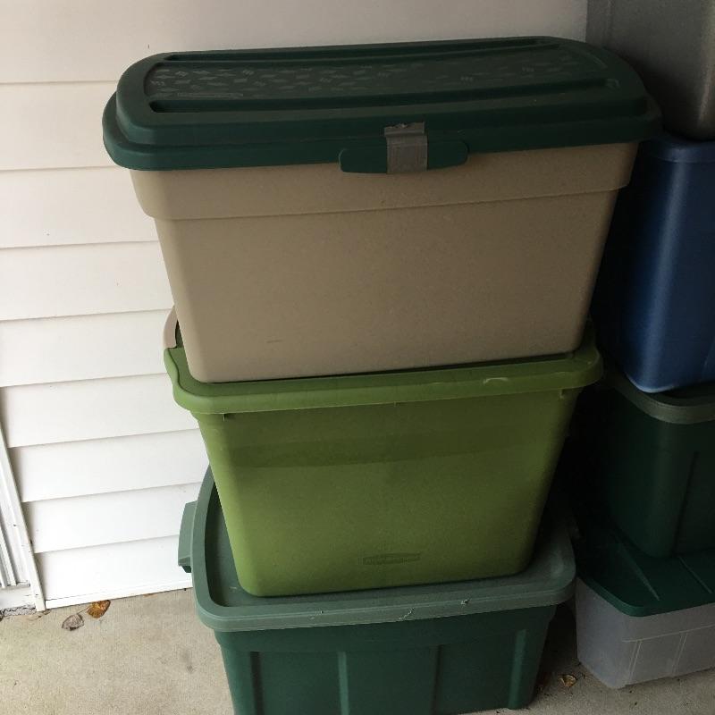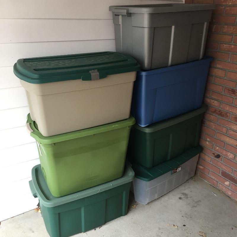 Seven plastic storage boxes with lids. You can never have too many storage boxes. Largest box measures 19” x 31” x 18”.