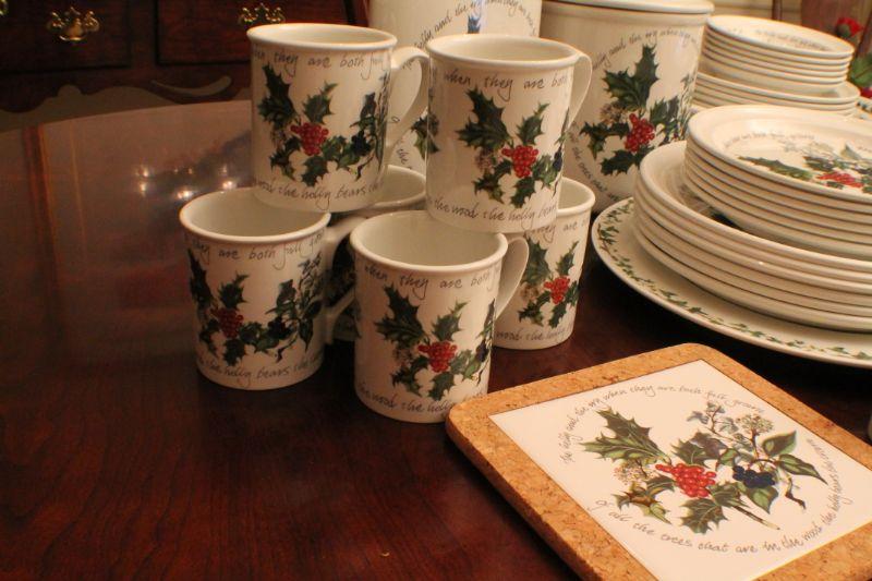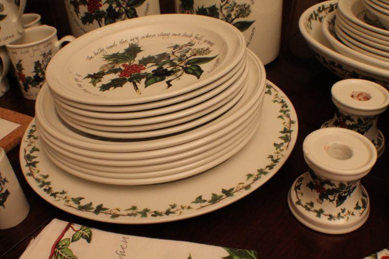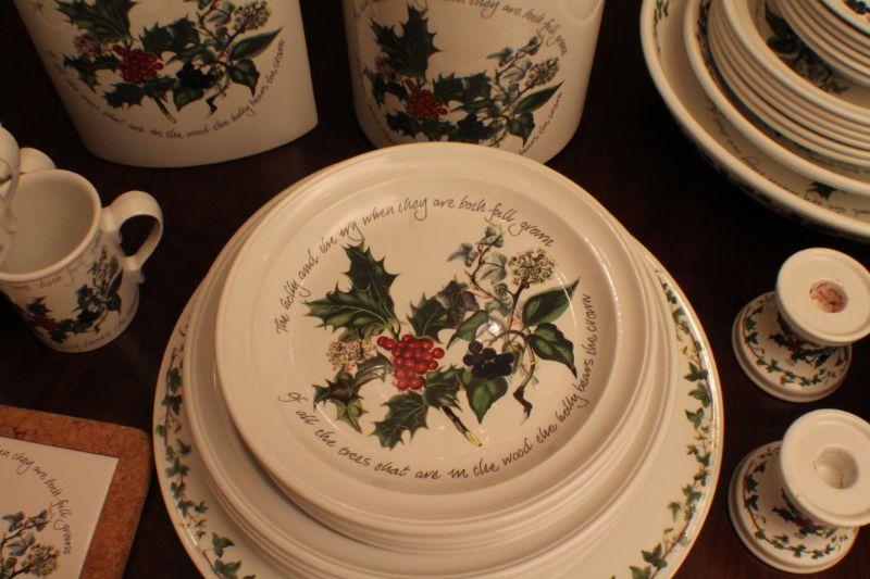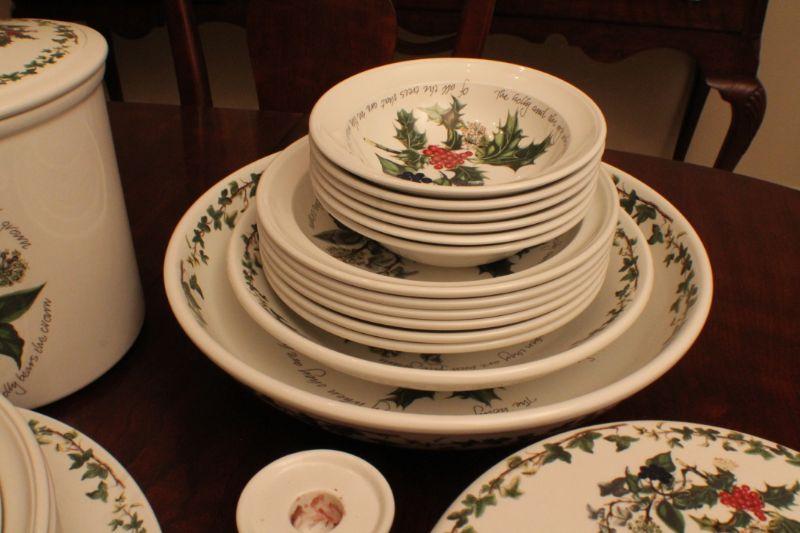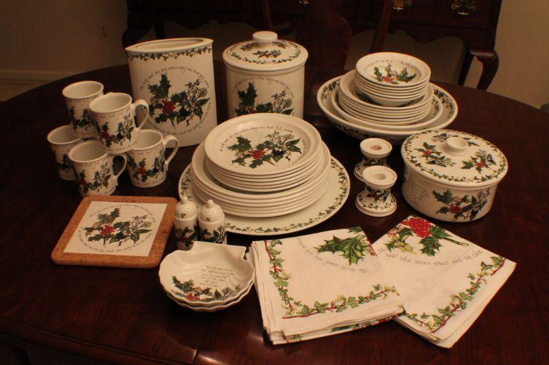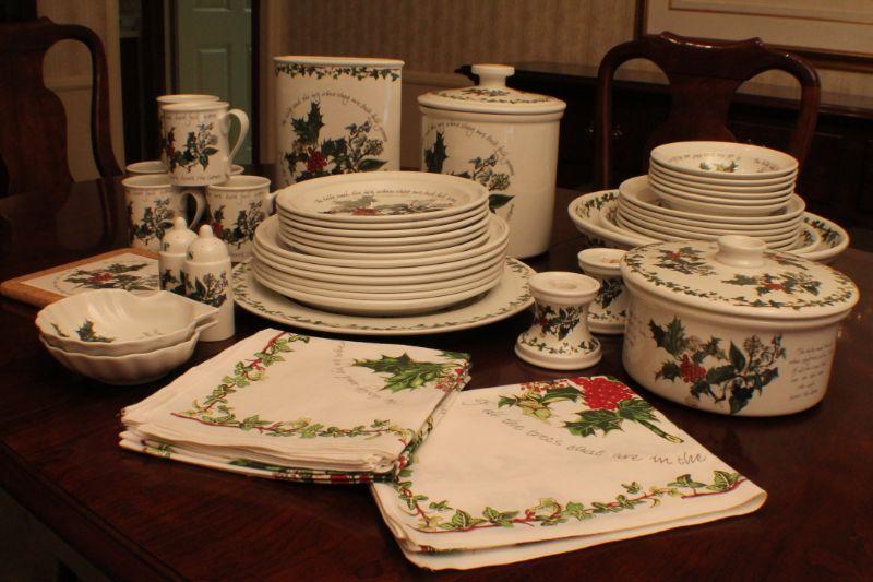 LOT #233: The Holly & The Ivy by AMy Cooper Willis Portmeirion Made in Britain 1995 (52 pcs. including lids, napkins and dish towels)