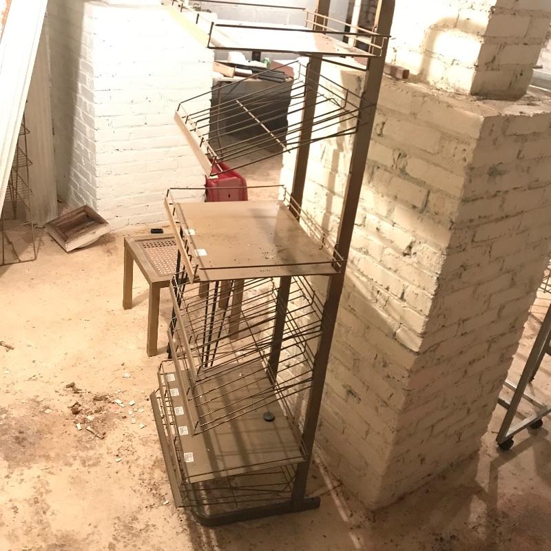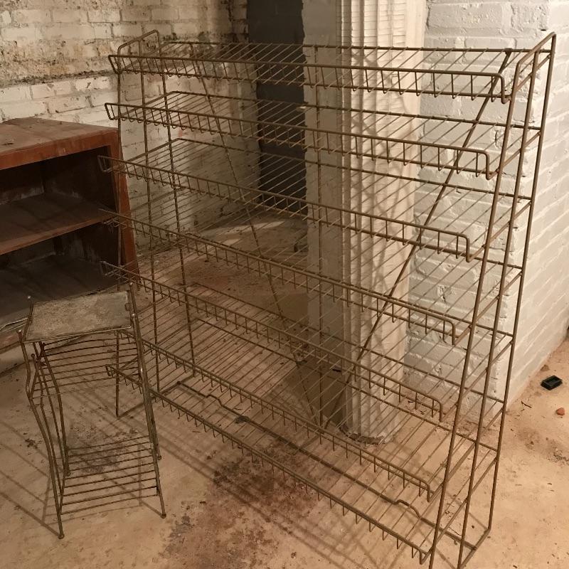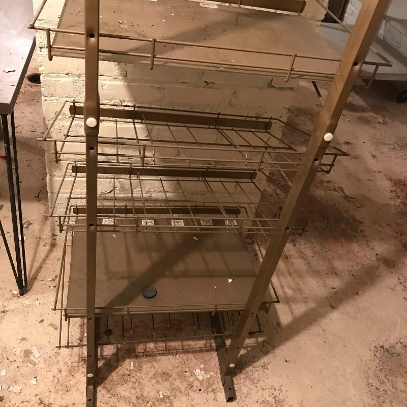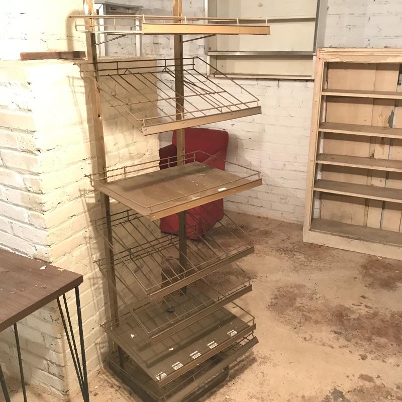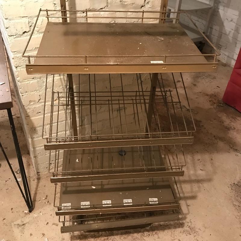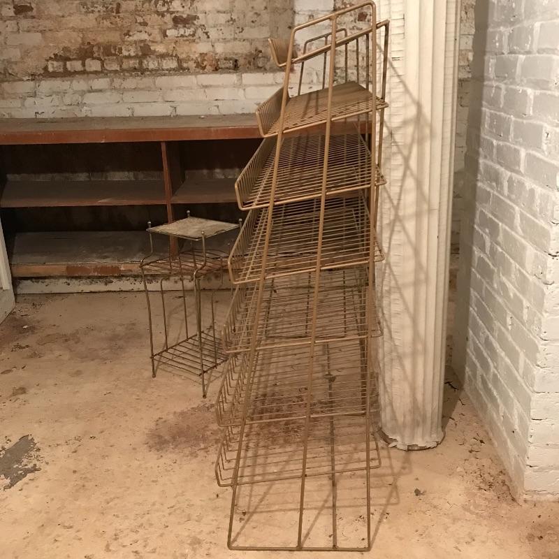 One small vintage magazine rack with three tiers perfect for a home collection or distribution. Rack has rusting throughly, but it is stable. The are also two large gold colored racks with angled shelves for easy displays. The first shelf photographed measures 47”l x 49”h, the top shelf is 9” wide with each shelf increasing in size and maxes out at 16” on the bottom shelf. The final shelf unit required a space at least 22.5” x 23” x 68”. It has spaces for labels or prices on each shelf and shelves are removable, height also appears adjustable. Some shelves are solid metal and others are wire-based. See photos. No shipping.