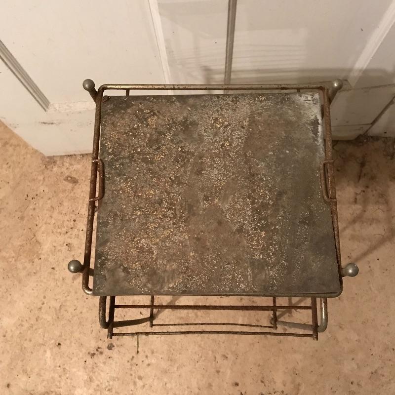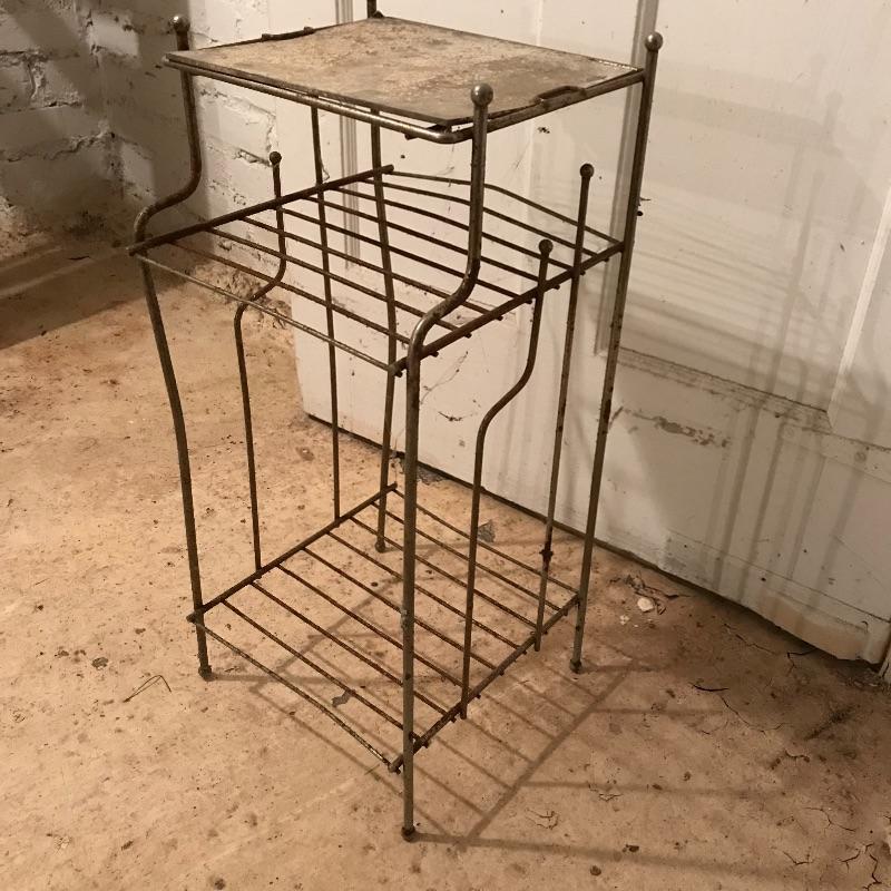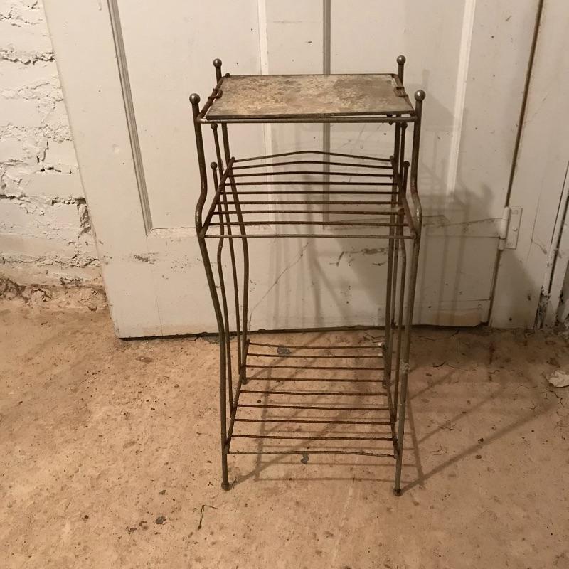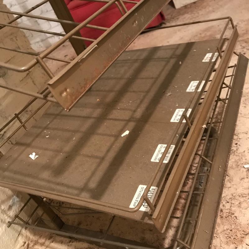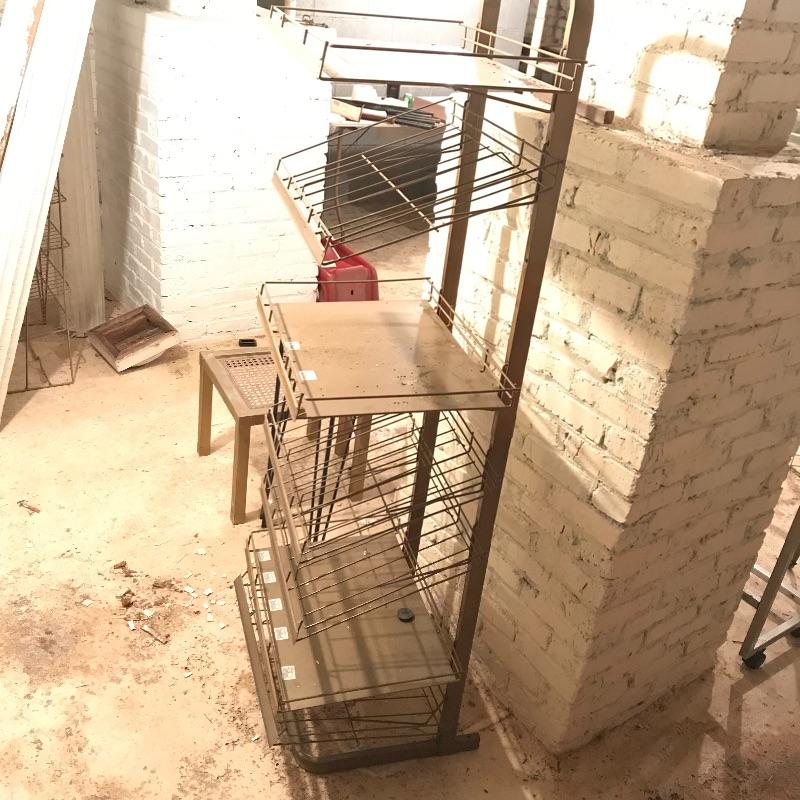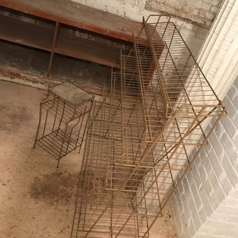 One small vintage magazine rack with three tiers perfect for a home collection or distribution. Rack has rusting throughly, but it is stable. The are also two large gold colored racks with angled shelves for easy displays. The first shelf photographed measures 47”l x 49”h, the top shelf is 9” wide with each shelf increasing in size and maxes out at 16” on the bottom shelf. The final shelf unit required a space at least 22.5” x 23” x 68”. It has spaces for labels or prices on each shelf and shelves are removable, height also appears adjustable. Some shelves are solid metal and others are wire-based. See photos. No shipping.