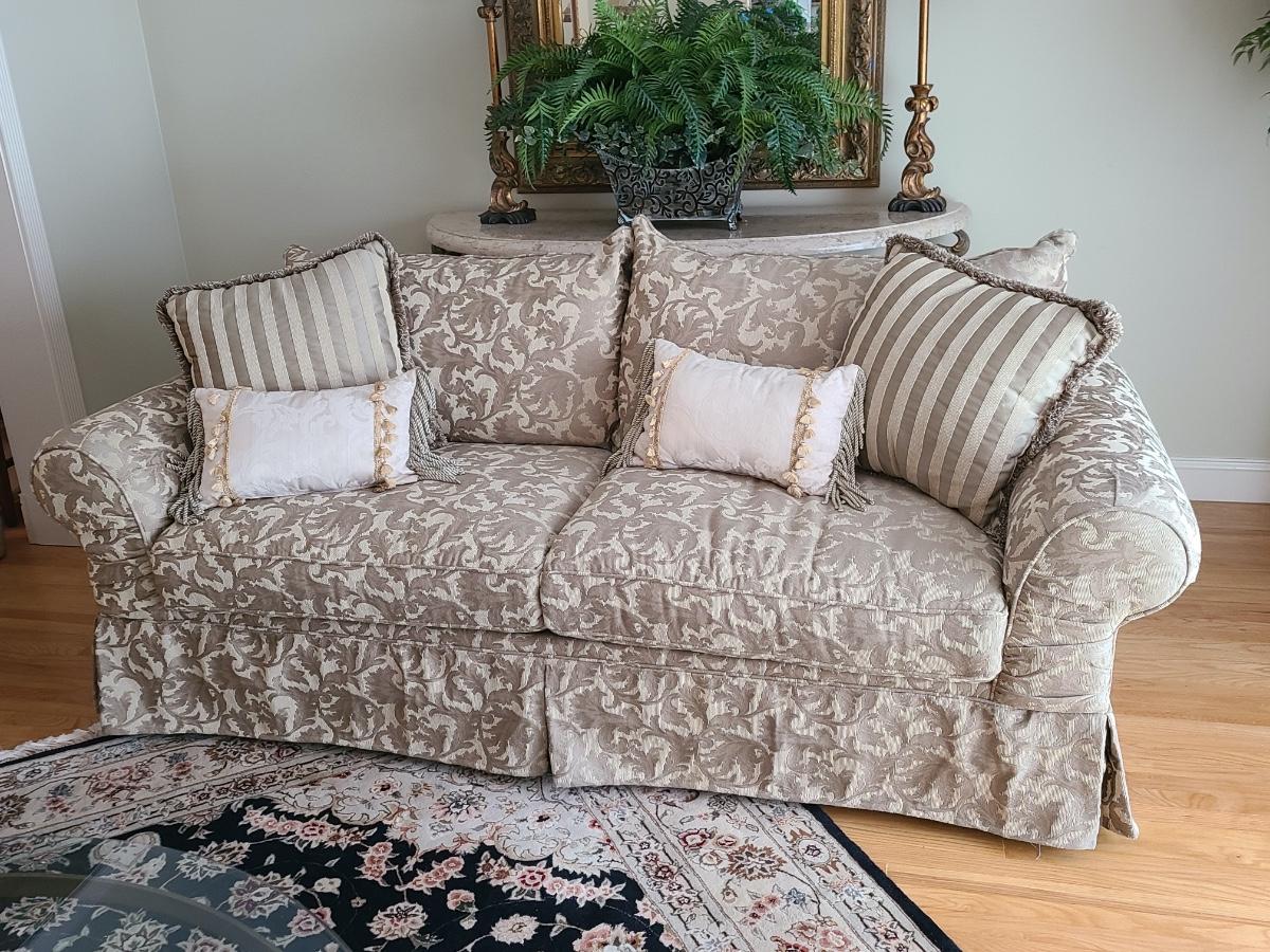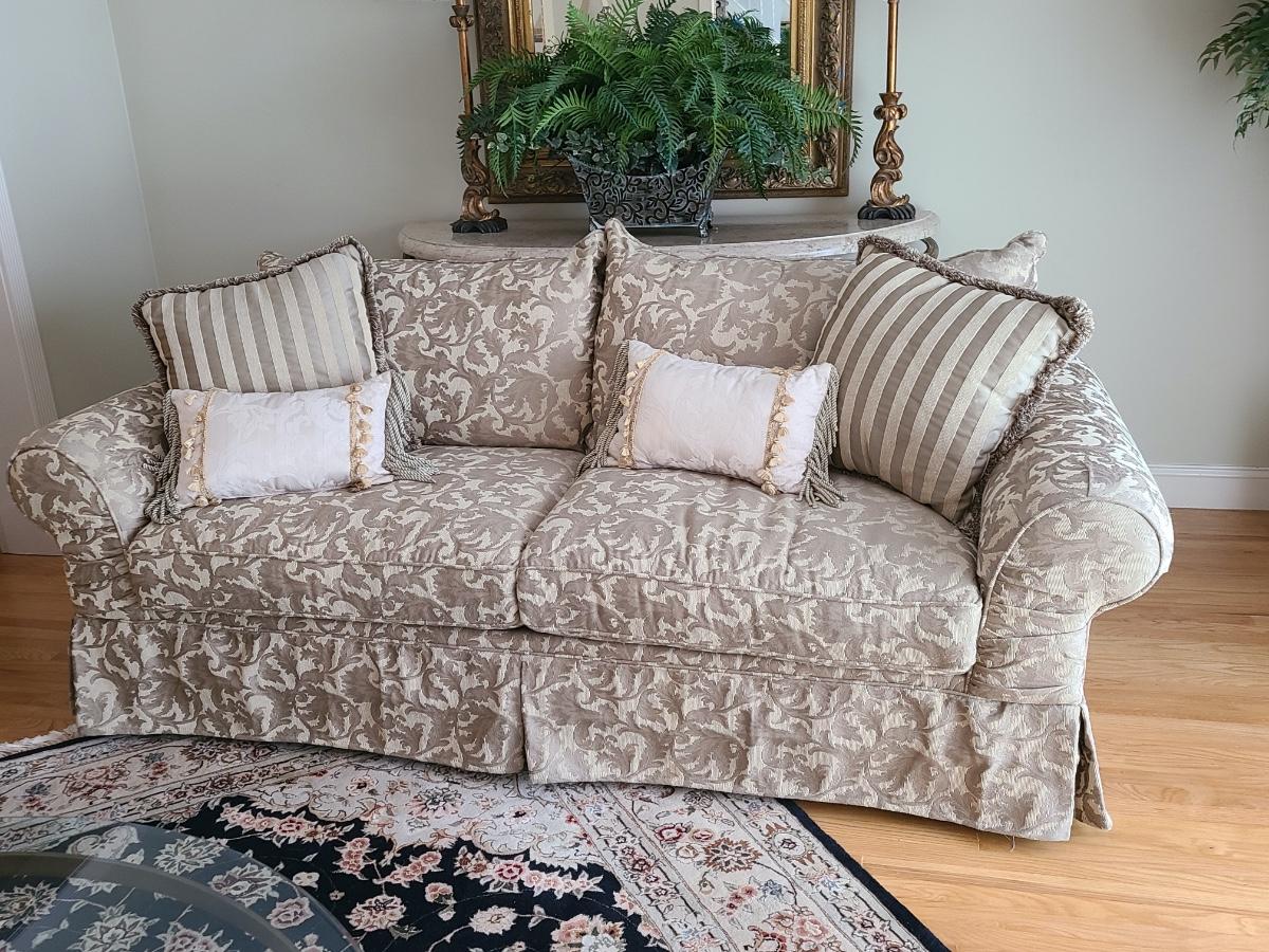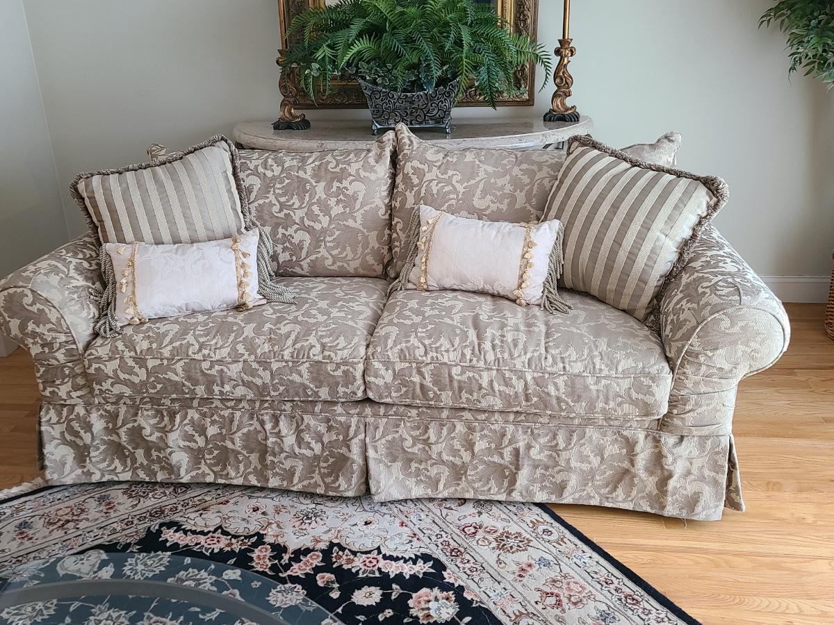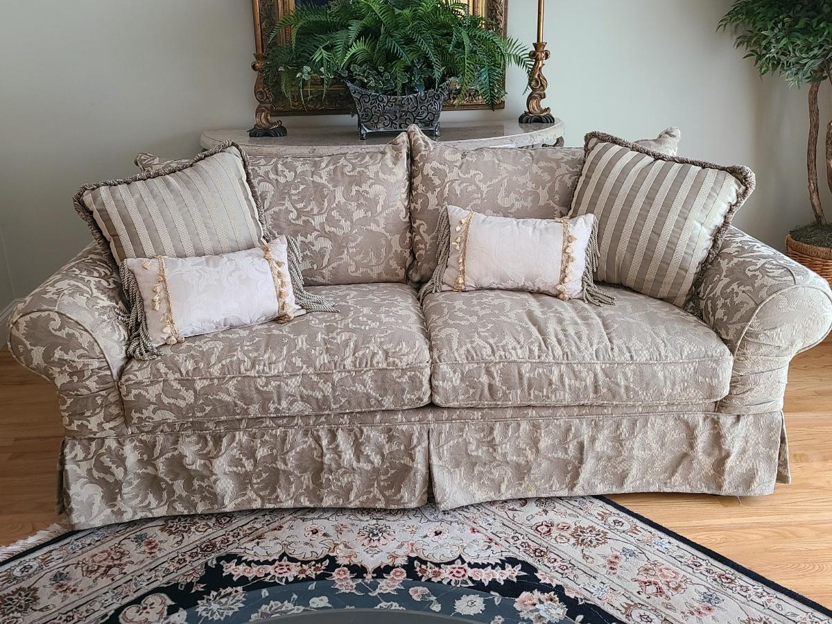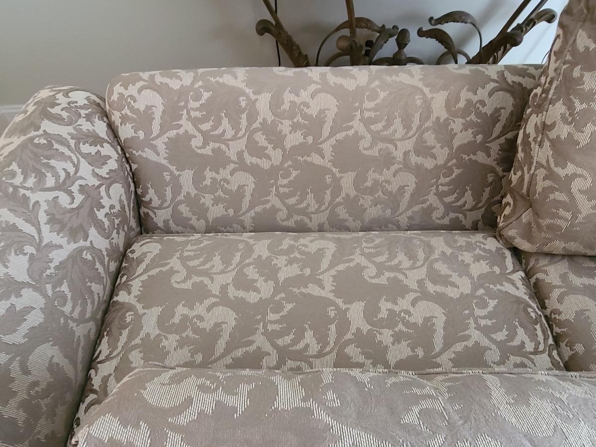 88x38x27 inches. This lovely sofa is in excellent condition. This is one owner, no pet home. This looks gold in some lights and beige in others. Comfortable and very soft! Perfect in any room. It is very clean. Please see all pictures as they are the best representation of the items. The pictures show condition, measurements if taken, and what is included in the lot. Due to the large amount that we photograph and the time frame, we are not always able to take measurements. All items unless noted, are pre-owned and have been used. If you purchased furniture, you must bring help. We do not allow one person to carry large furniture out on their own. Bring help, tools and a truck for the safety of our client’s homes, and your personal safety. Company policy. Thank you.