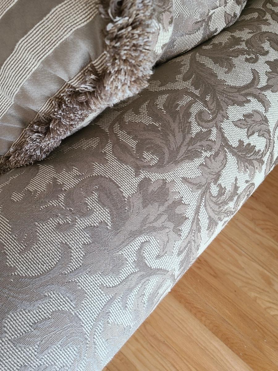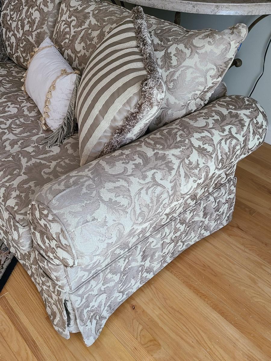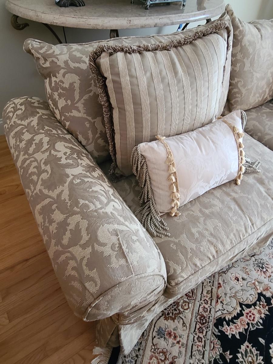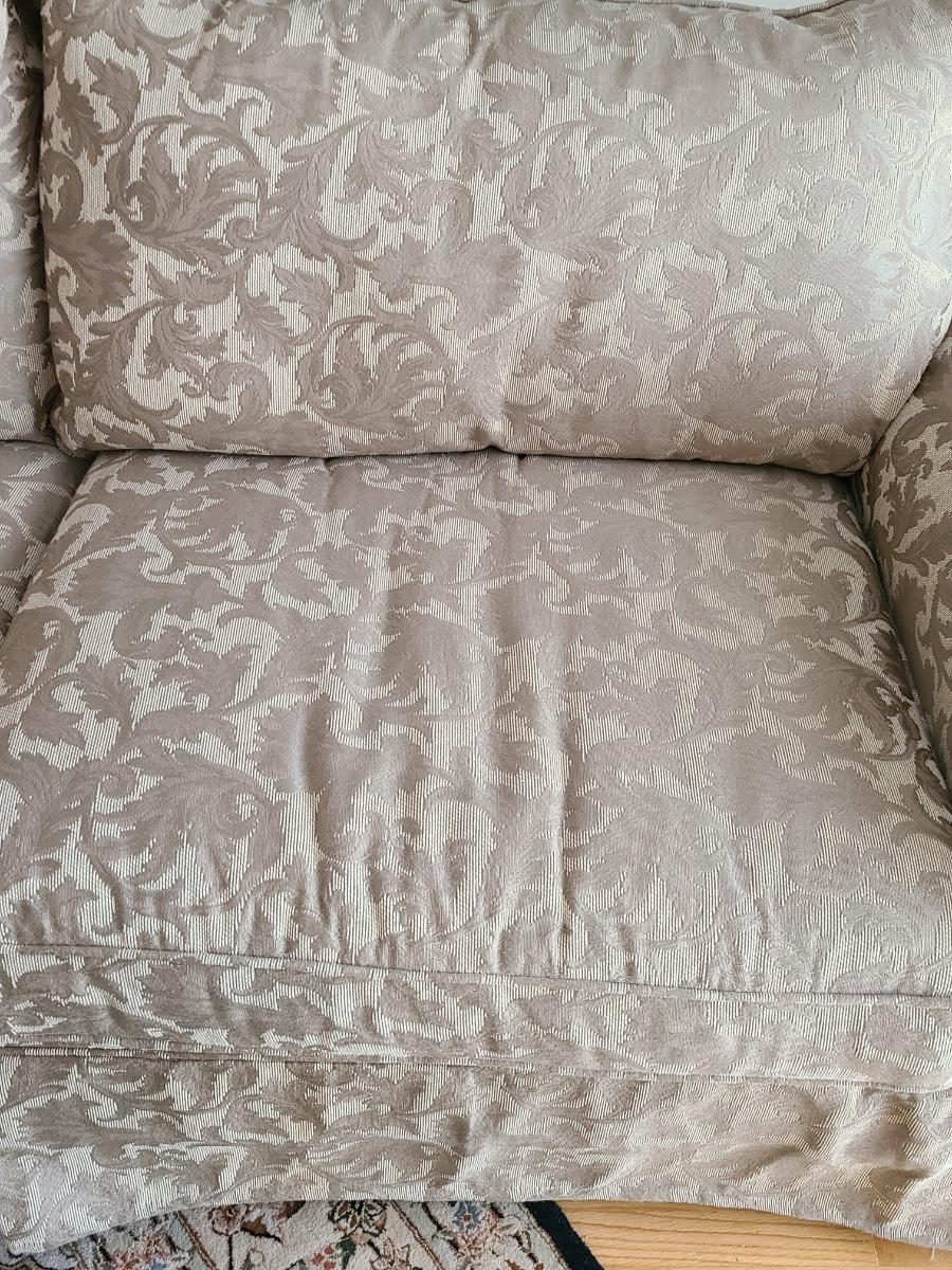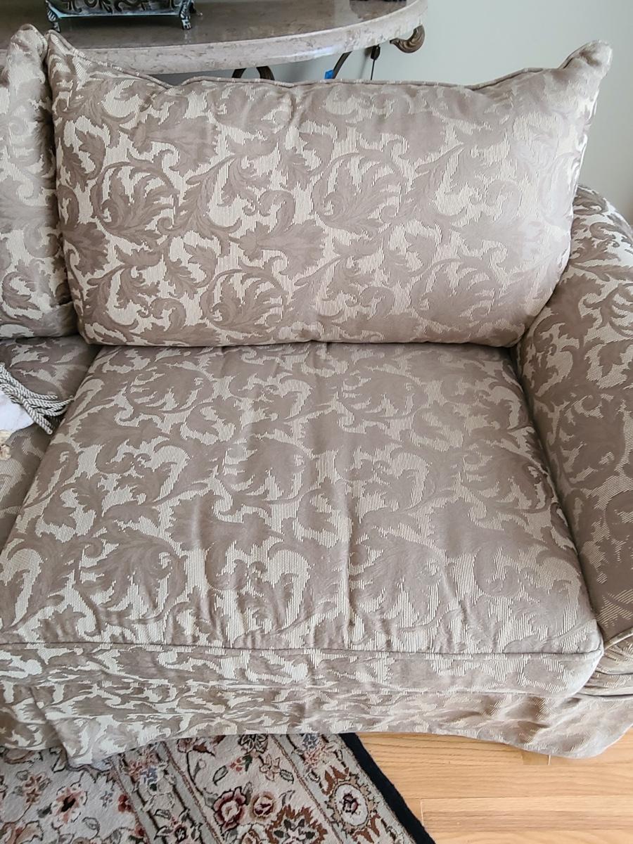 88x38x27 inches. This lovely sofa is in excellent condition. This is one owner, no pet home. This looks gold in some lights and beige in others. Comfortable and very soft! Perfect in any room. It is very clean. Please see all pictures as they are the best representation of the items. The pictures show condition, measurements if taken, and what is included in the lot. Due to the large amount that we photograph and the time frame, we are not always able to take measurements. All items unless noted, are pre-owned and have been used. If you purchased furniture, you must bring help. We do not allow one person to carry large furniture out on their own. Bring help, tools and a truck for the safety of our client’s homes, and your personal safety. Company policy. Thank you.