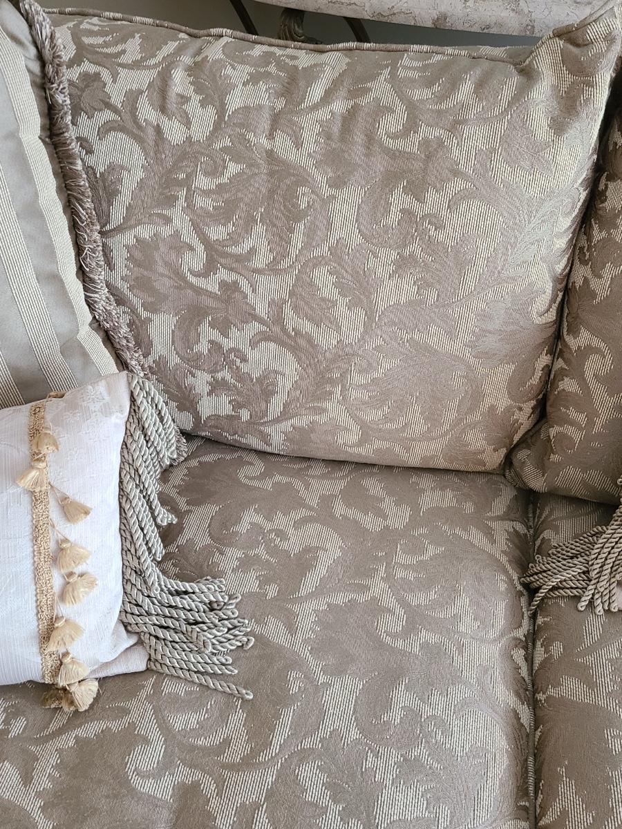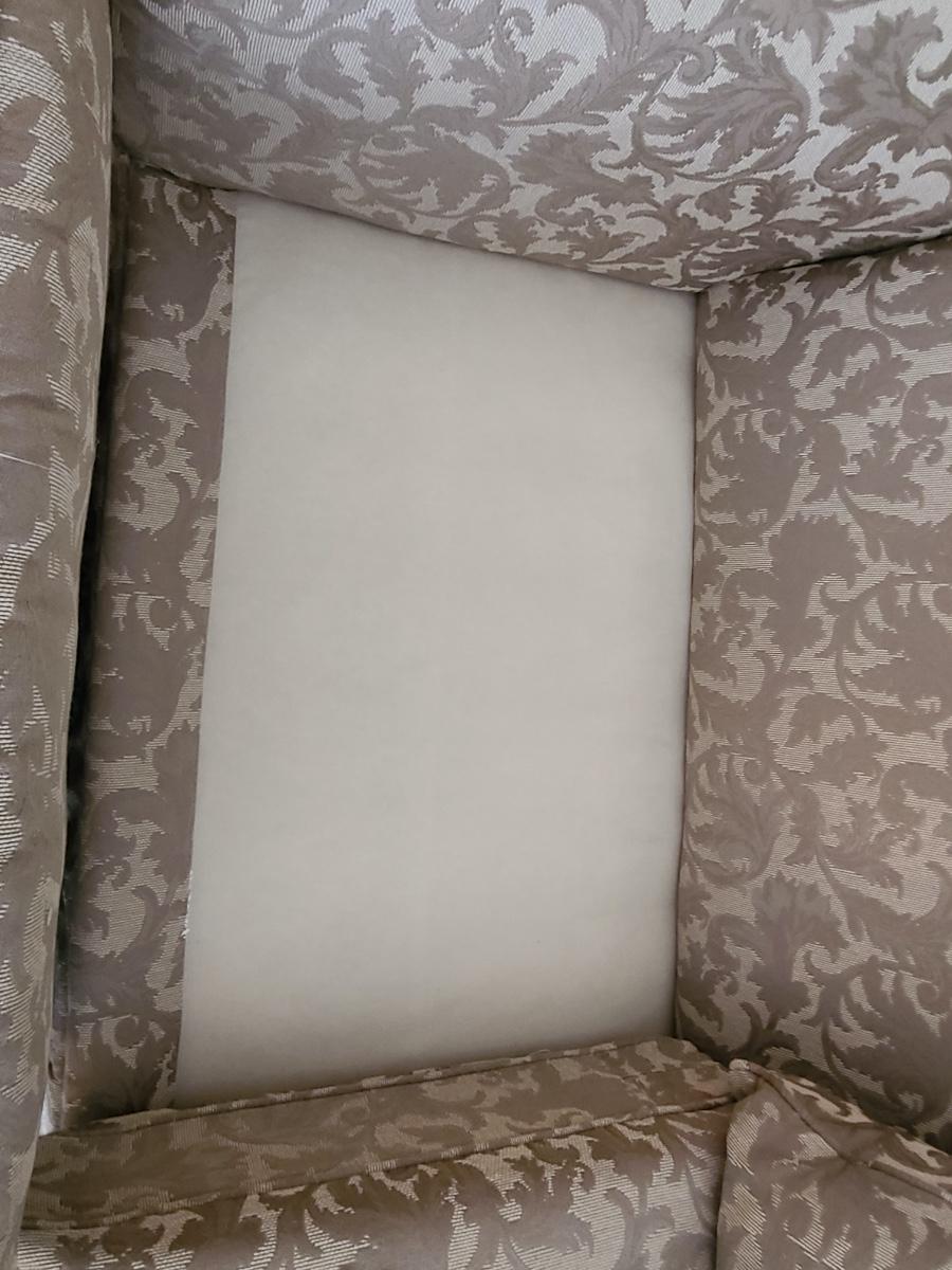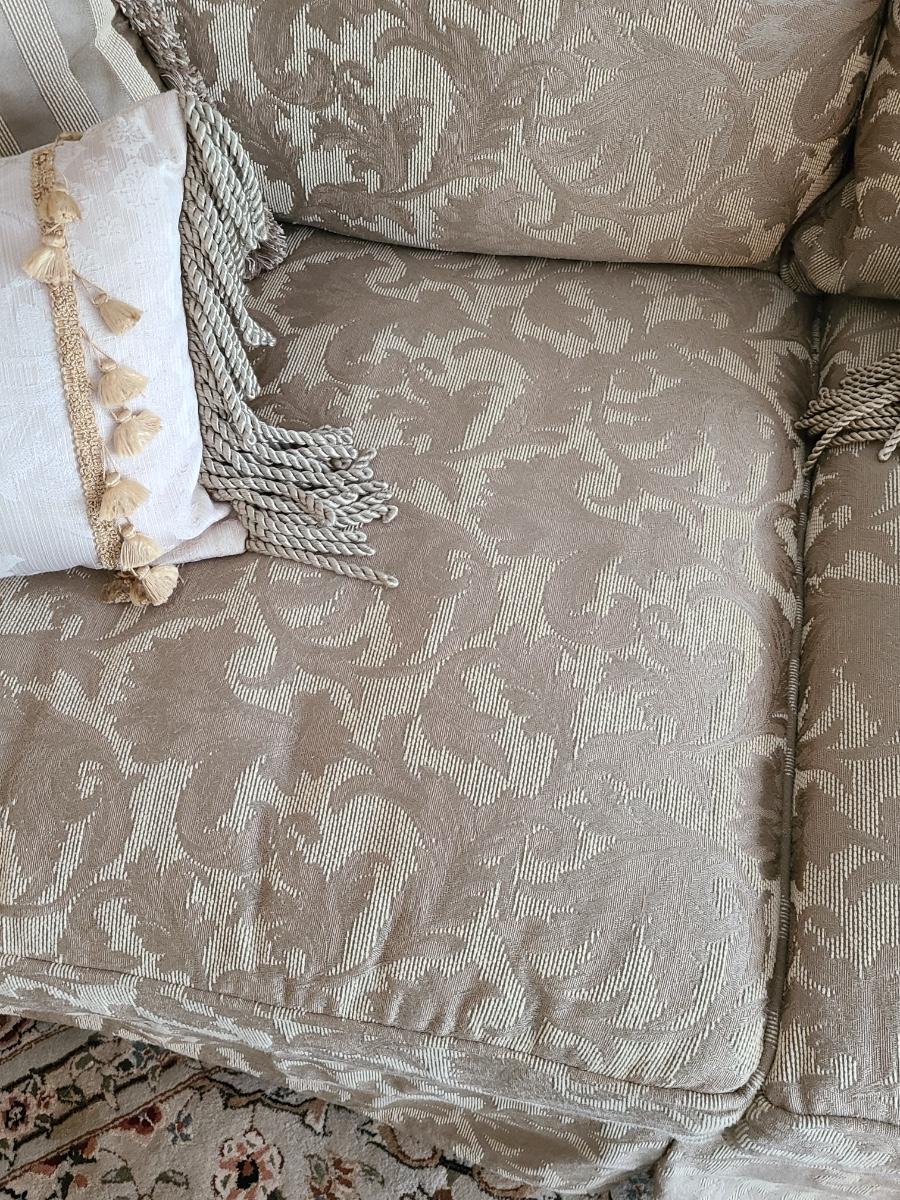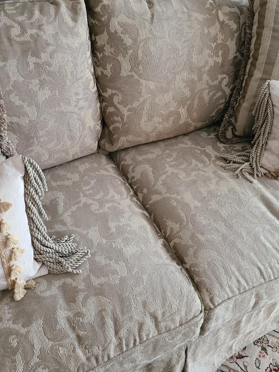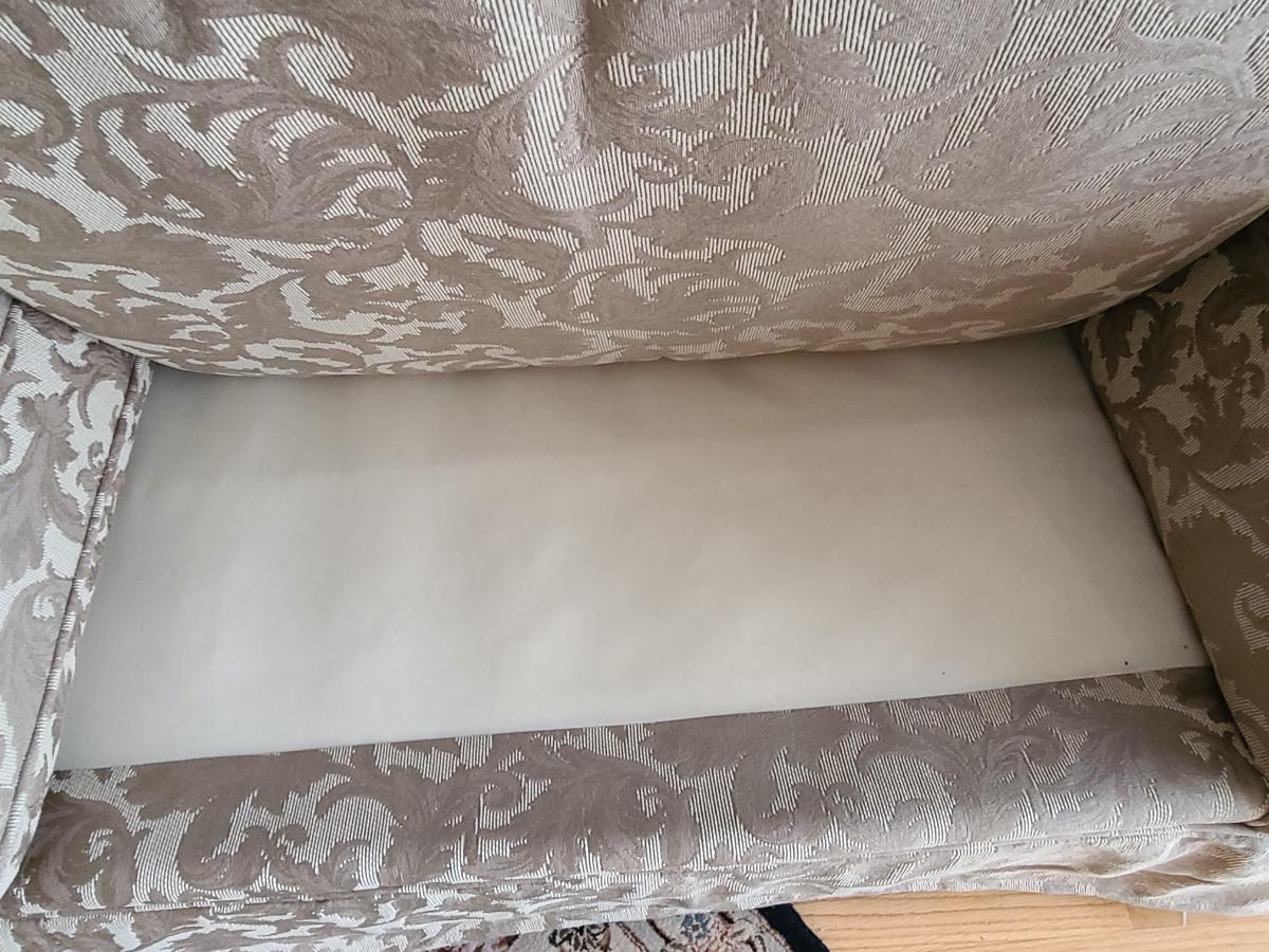 88x38x27 inches. This lovely sofa is in excellent condition. This is one owner, no pet home. This looks gold in some lights and beige in others. Comfortable and very soft! Perfect in any room. It is very clean. Please see all pictures as they are the best representation of the items. The pictures show condition, measurements if taken, and what is included in the lot. Due to the large amount that we photograph and the time frame, we are not always able to take measurements. All items unless noted, are pre-owned and have been used. If you purchased furniture, you must bring help. We do not allow one person to carry large furniture out on their own. Bring help, tools and a truck for the safety of our client’s homes, and your personal safety. Company policy. Thank you.