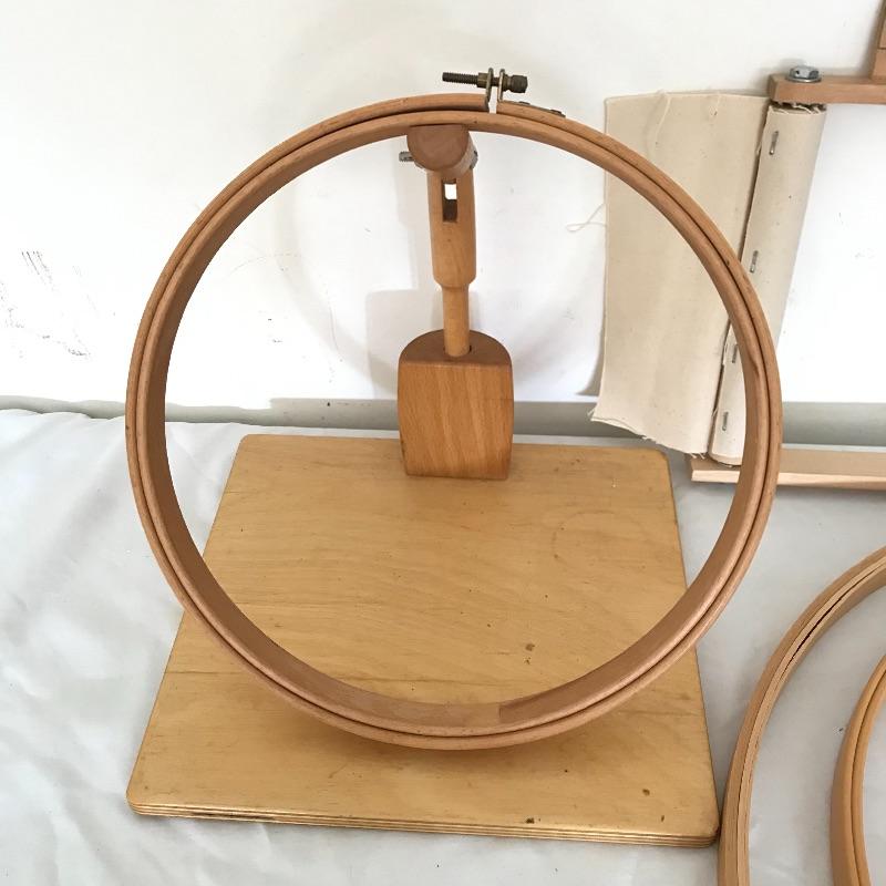 Three wooden and one heavy plastic embroidery hoops with diameters between 10.5” and 18.5”. One rectangle based wood hoop stand measures 9.75” x 9” x 3.75”. One 10.75” x 8.5” embroidery frame also included in collection to ensure you have the right tools for the any job! No shipping.