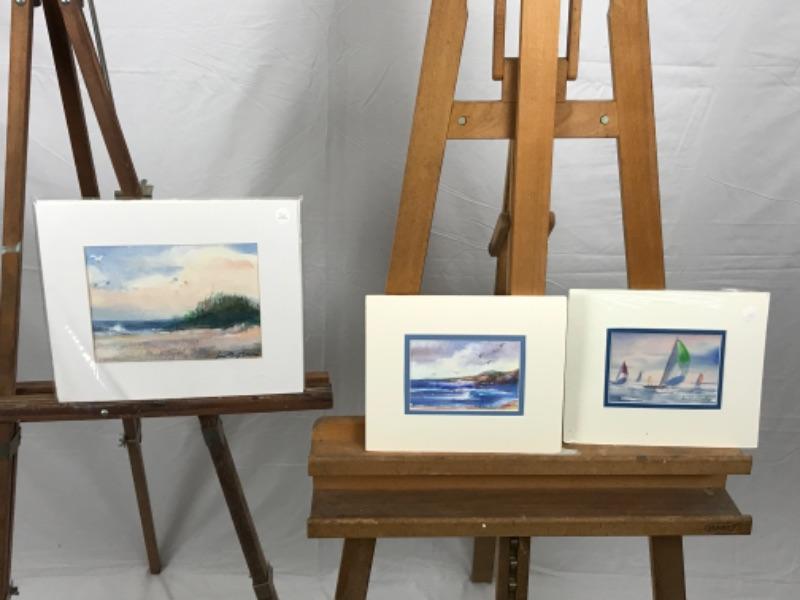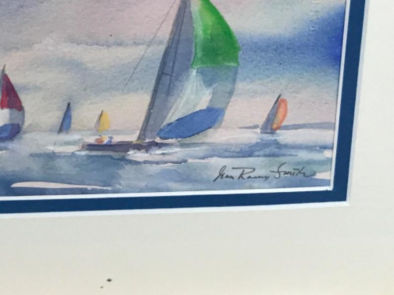 Three Jean Ranney Smith signed original watercolor paintings “Sailboats” measures 10”x8”, “Calm Seas” measures 10”x8” and “Beach Scenery” measures 12”x10”