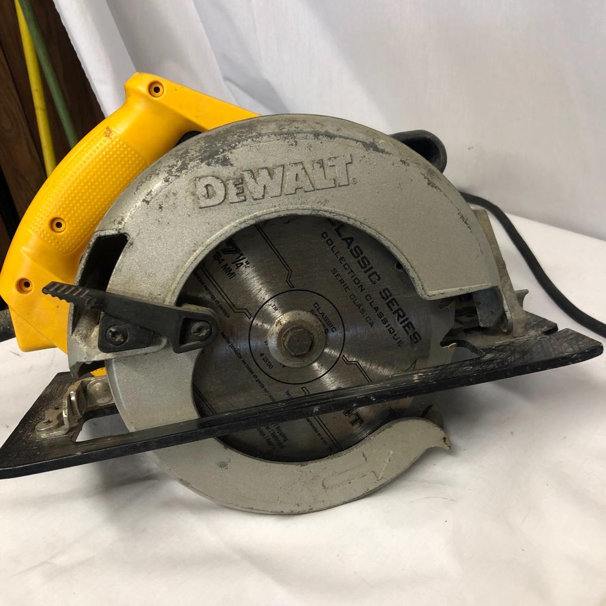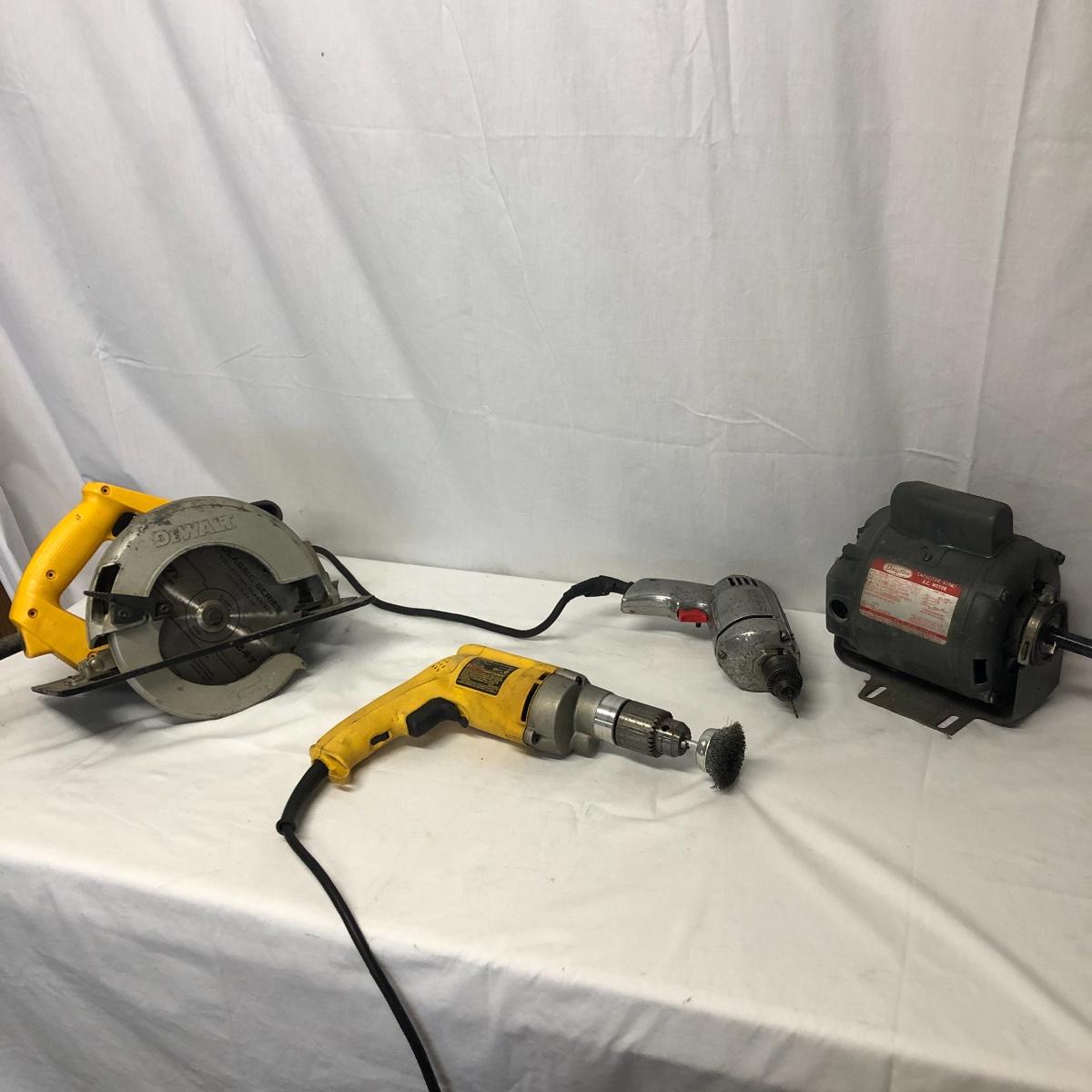 This lot consists of four items: one DeWalt 359 71/4 Circular Saw, one DeWlat 235G VSR drill, one Craftsman drill and one Dayton Capacitor Motor. All power tools operated when plugged in. Local pick up only.