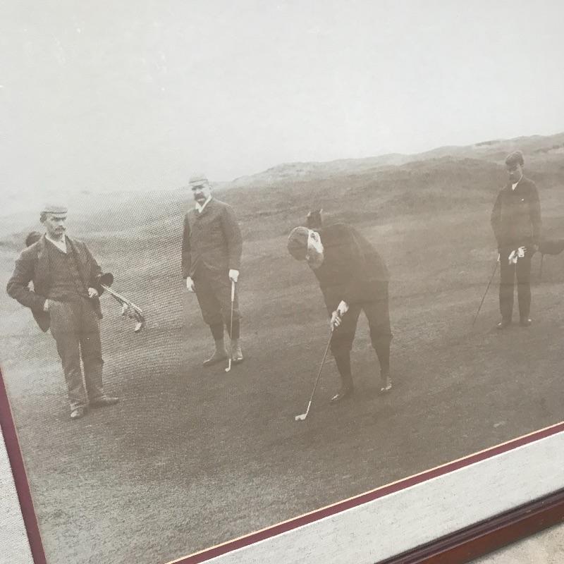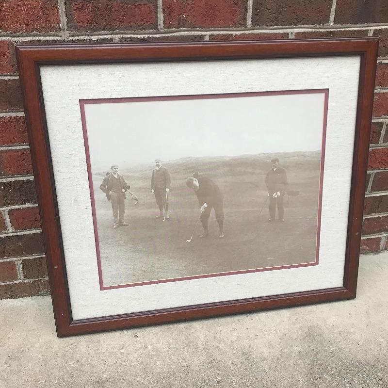 Beautifully framed and matted photo (or print?) of golfers from the early days of golf. This is a beautiful piece that is wonderful for a study or den. Artwork measures 33.5” x 28.5”. No artist name visible. Shipping available. Please call UPS at 828-252-6930 for a shipping quote prior to bidding.
