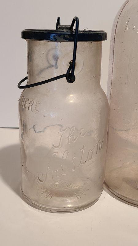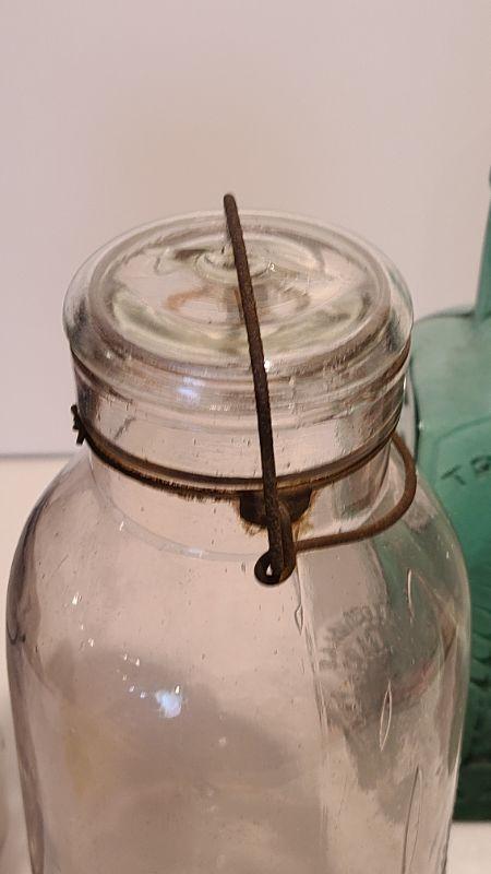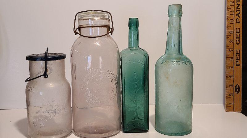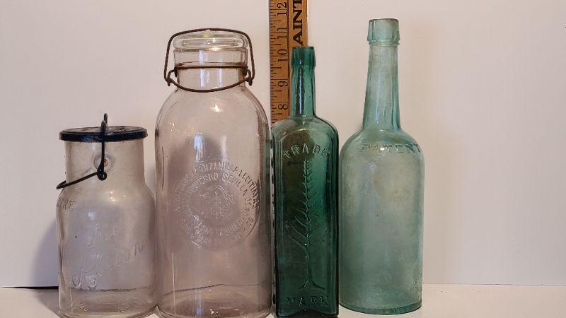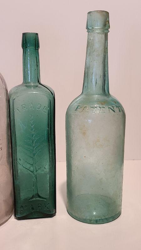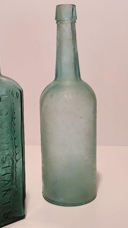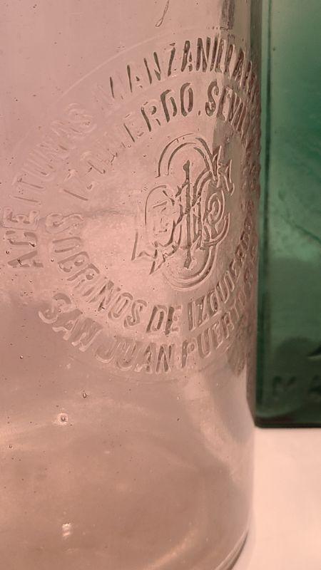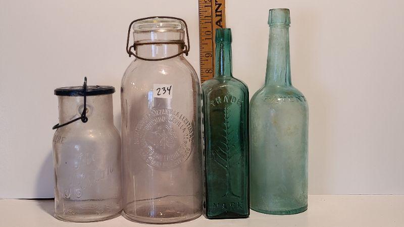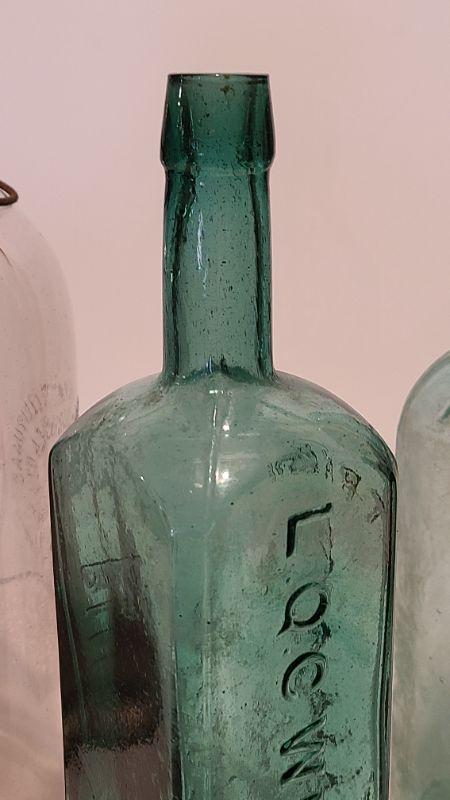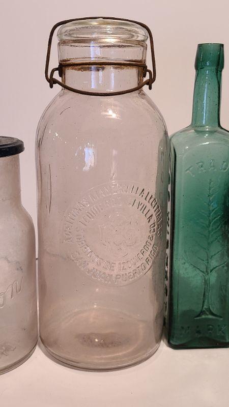 Rare green LQC Wisharts Pine Tree Cordial Bottle Philadelphia Blob Top bottle, and large Liquor Jar with spanish writing from Puerto Rico, The Alston unique shaped canning jar, and unidentified blob top aqua bottle. Each lot is unique and you will need to see all pictures. Pictures have been taken from all side to see condition and markings. What you see in the pictures is the actual content of the lot and the pictures are the best representation of the bottles. All bottles are sold-is according to the pictures. For further information please google the makers marks for age.
