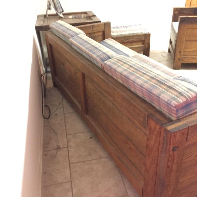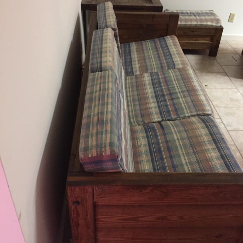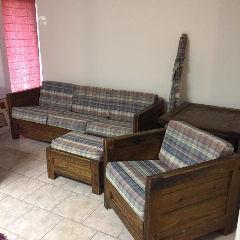 Couch,Chair,Table,Ottoman and Fabric. This furniture is well made and heavy duty. Couch measures 30” x 76.5” x 25.5” chair measures 28.5” x 30” 25.5” Table measures 30” x 30” x 25.5”. Ottoman measures 25.5” x 18.5” x 13.5.