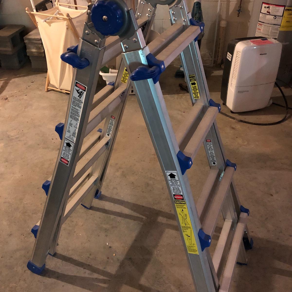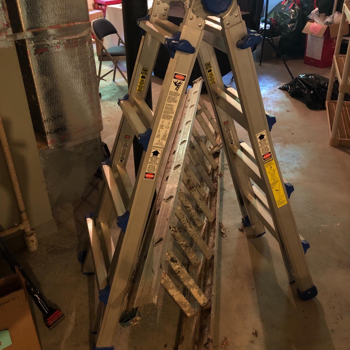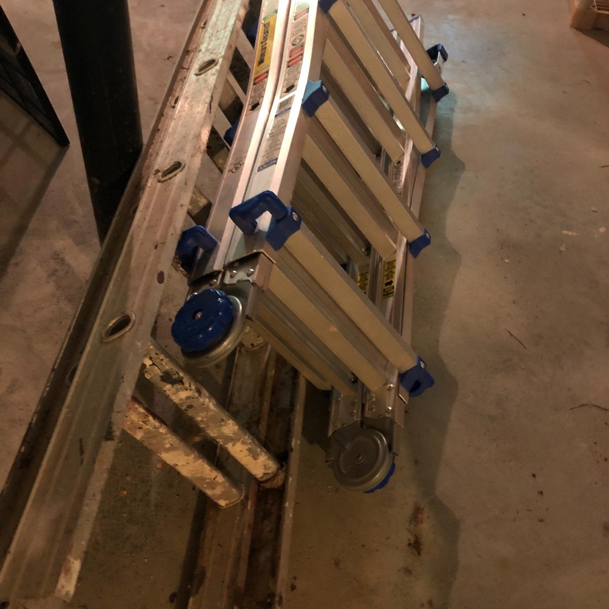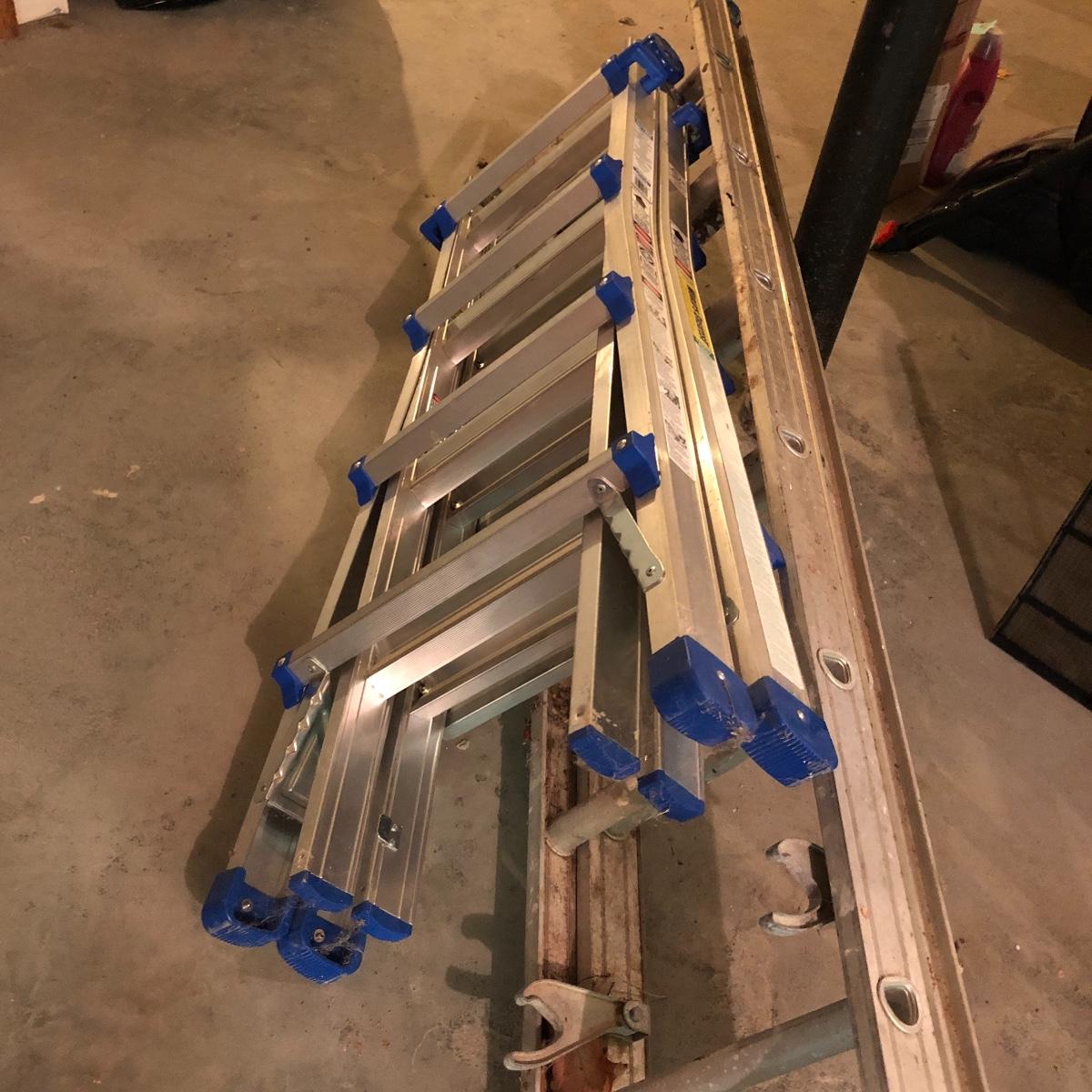 Get to what you need to with this extension ladder and multi-use ladder. The extension ladder needs a bit of cleaning as it was stored outside. It measures approximately 16’. The multi-use ladder can be used as an “A-Frame” ladder or extended straight as an extension ladder. Local pick up only.