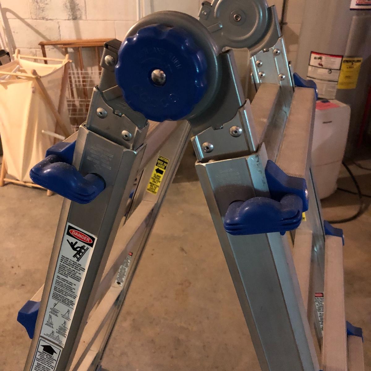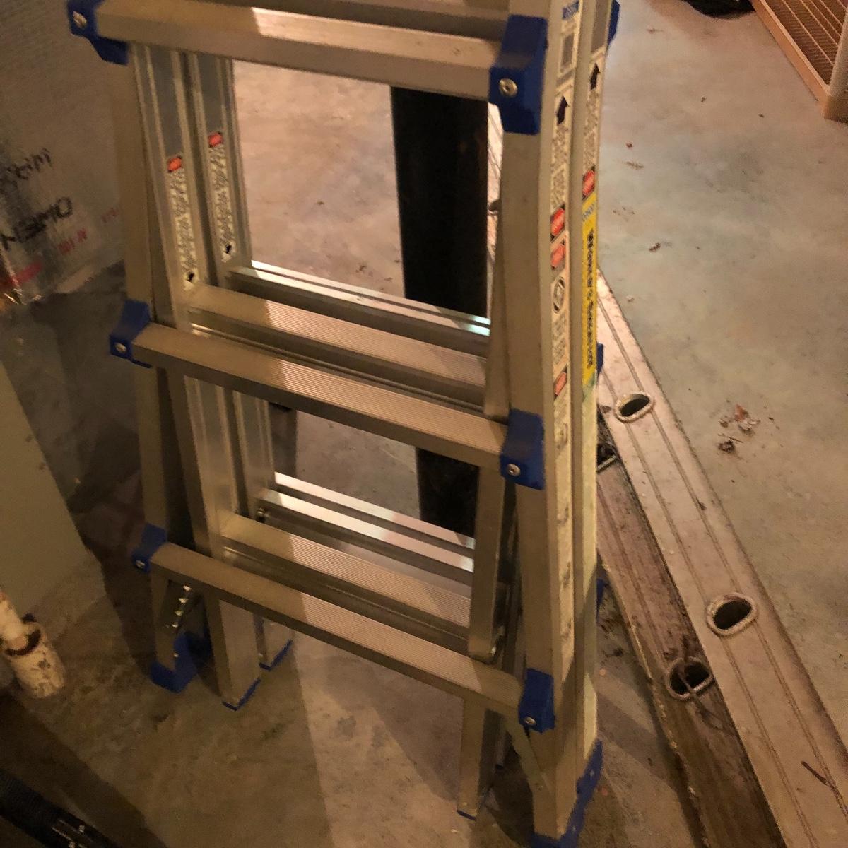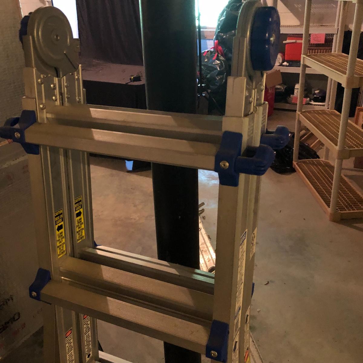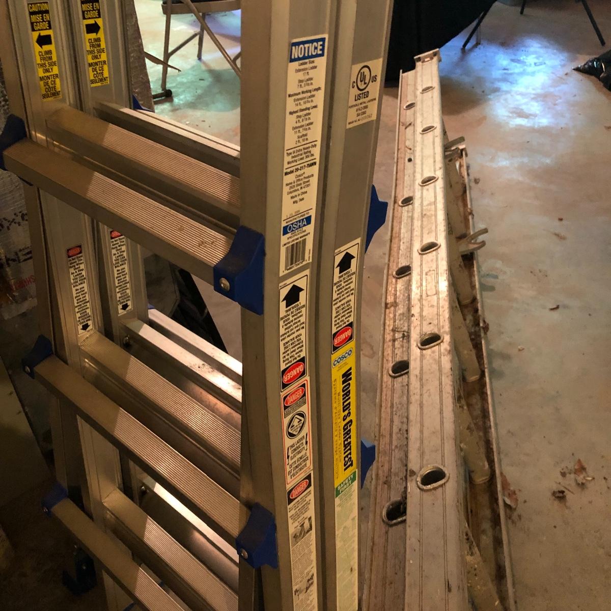 Get to what you need to with this extension ladder and multi-use ladder. The extension ladder needs a bit of cleaning as it was stored outside. It measures approximately 16’. The multi-use ladder can be used as an “A-Frame” ladder or extended straight as an extension ladder. Local pick up only.