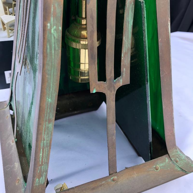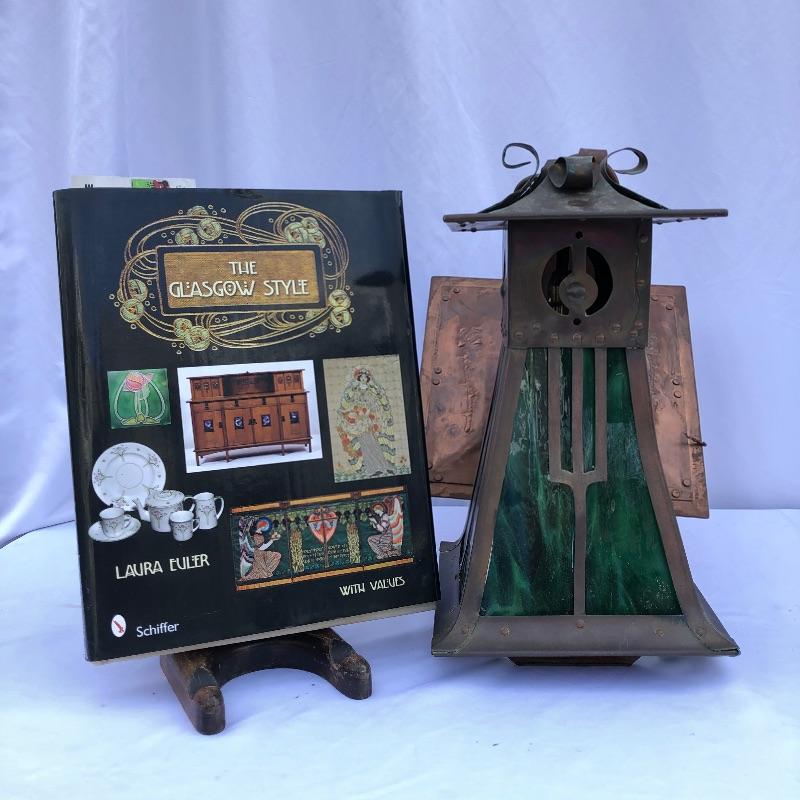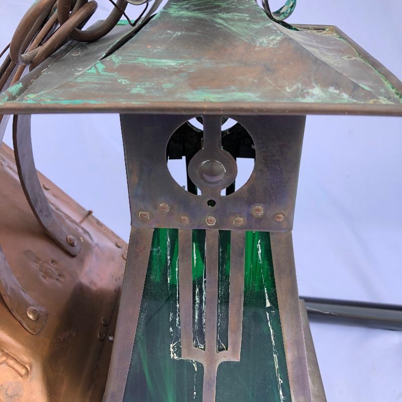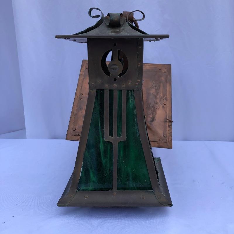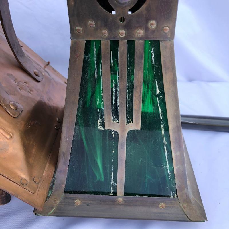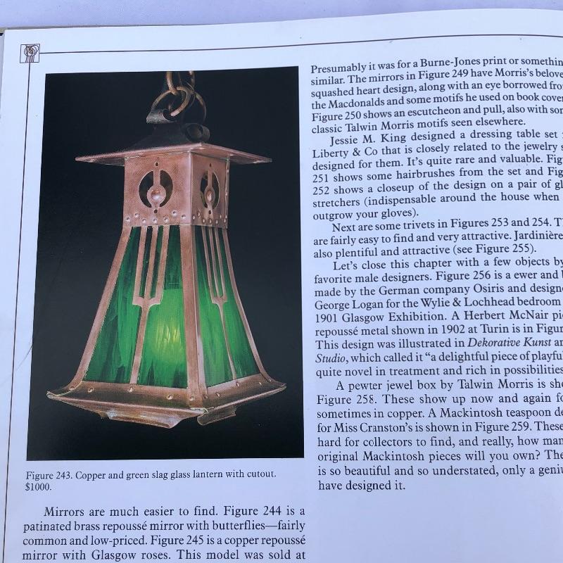 Copper and green slag glass lantern with cutout is made by Glasgow. An example is shown in the book that comes with the lantern on page 122.