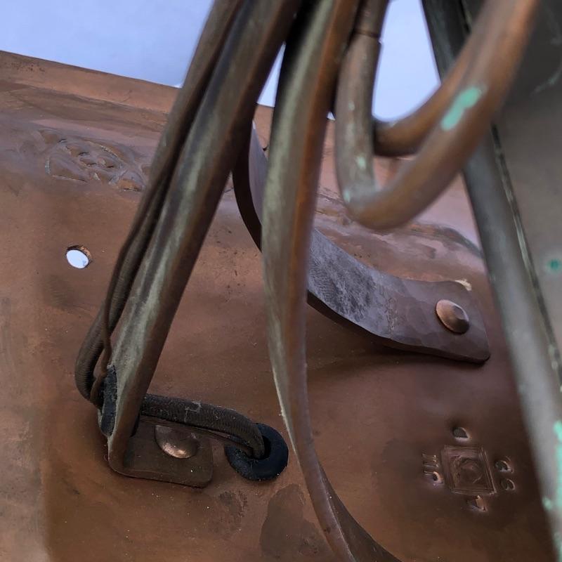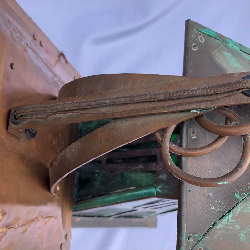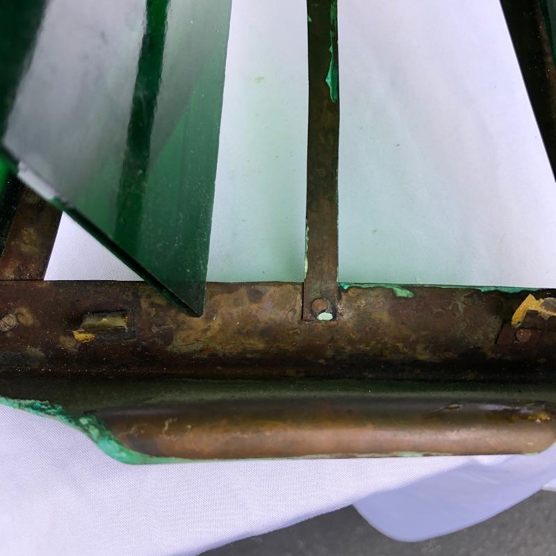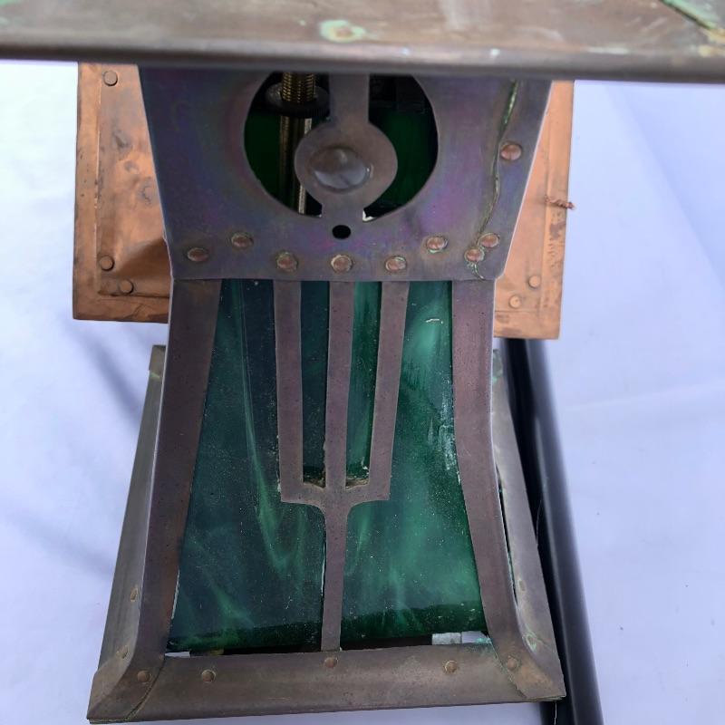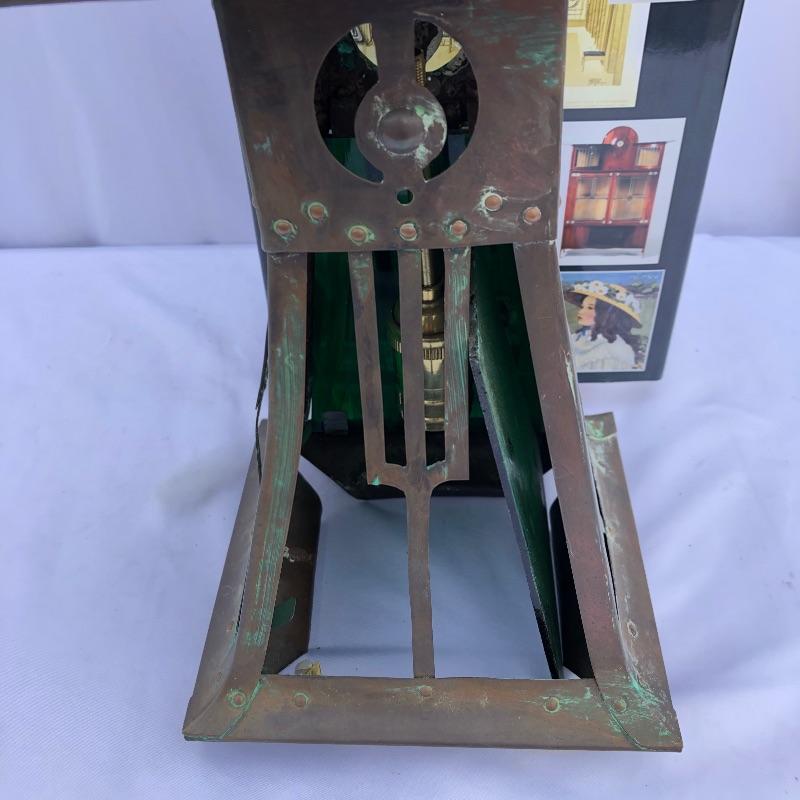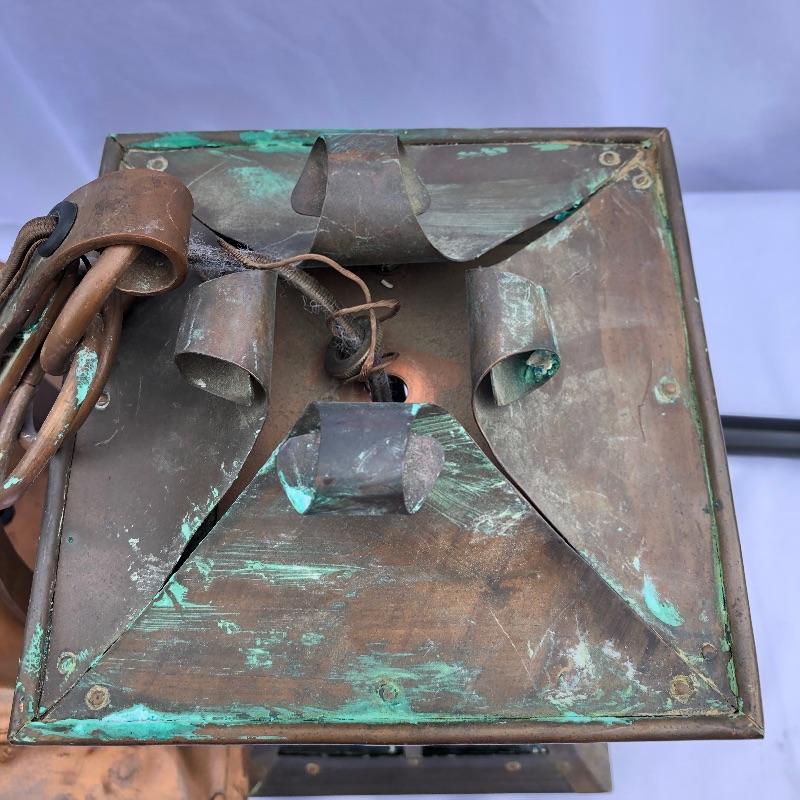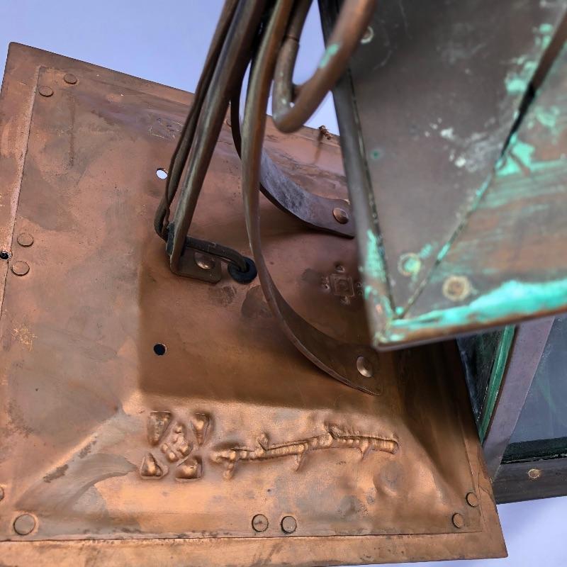 Copper and green slag glass lantern with cutout is made by Glasgow. An example is shown in the book that comes with the lantern on page 122.