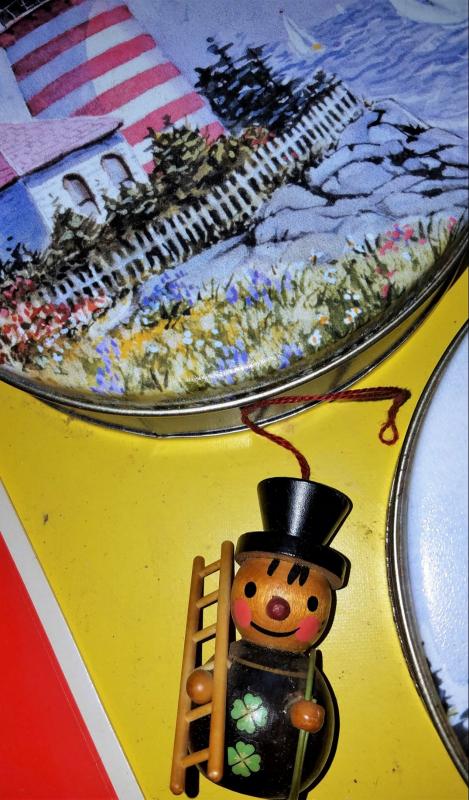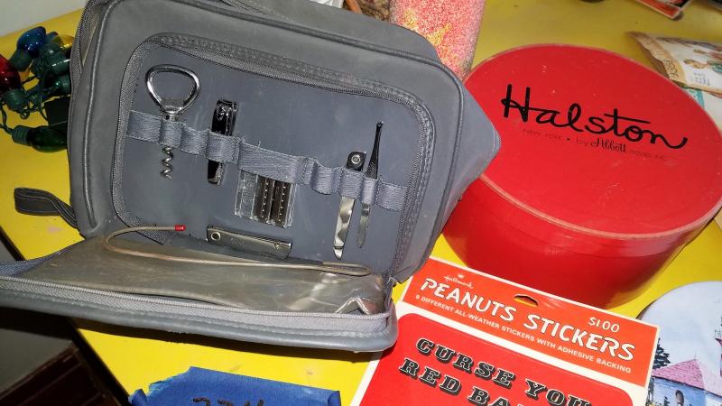 Metal tins small hat box red baron stickers and complete with Santa shoe and portable travel kit