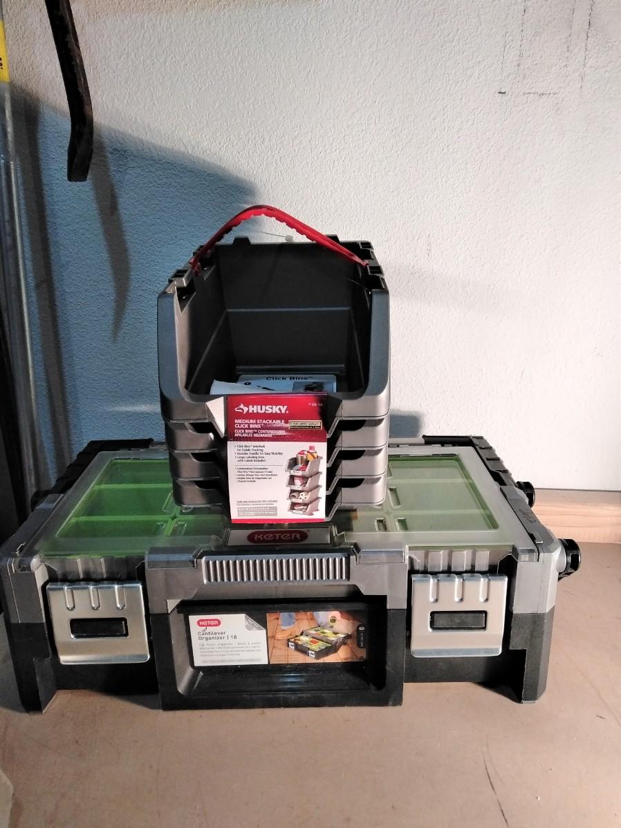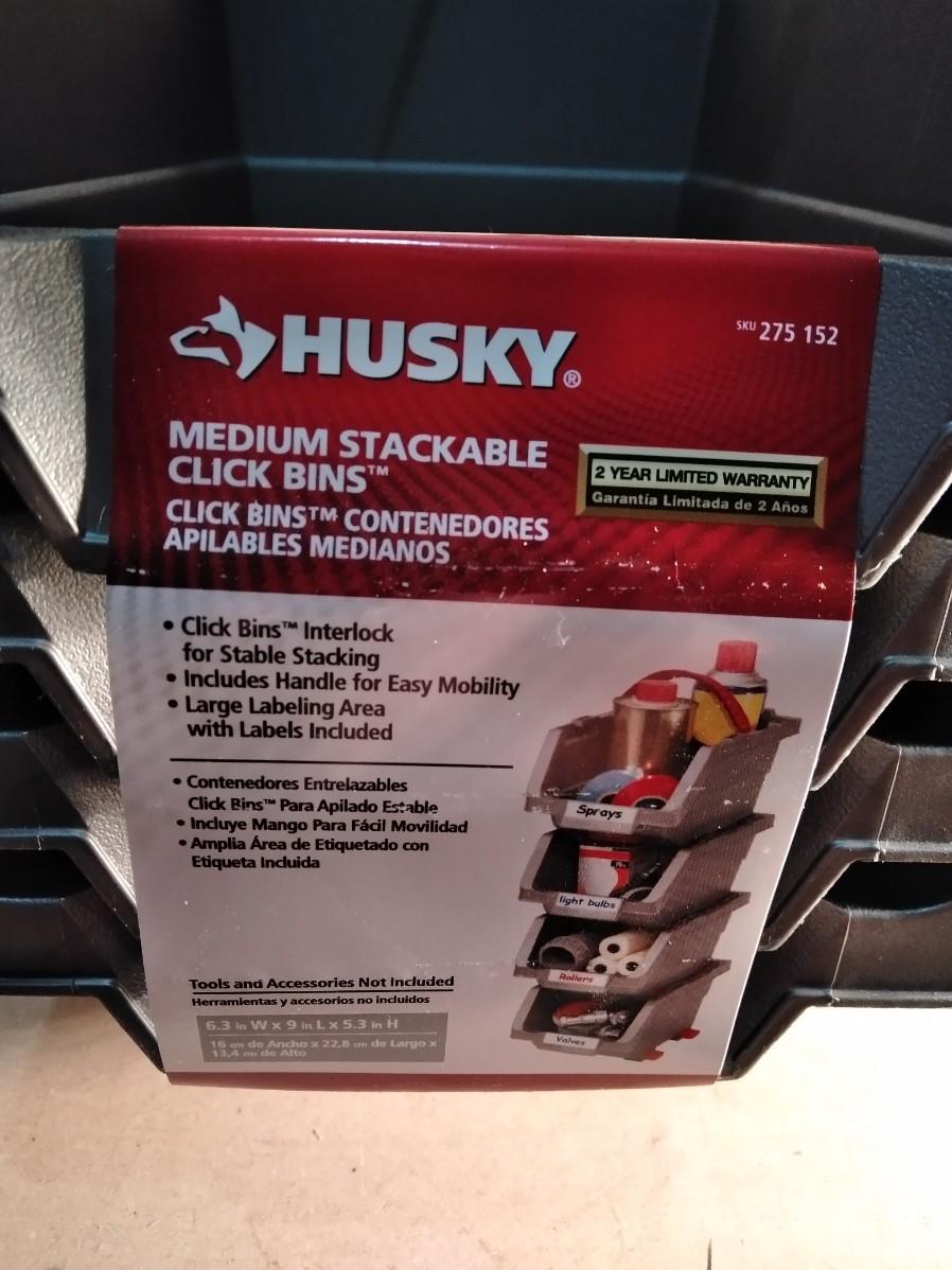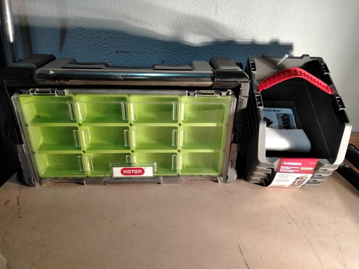 NEW HUSKY MEDIUM STACKABLE CLICK BIN STORAGE SYSTEM, AND A NEW KETER CANTILEVER ORGANIZER.