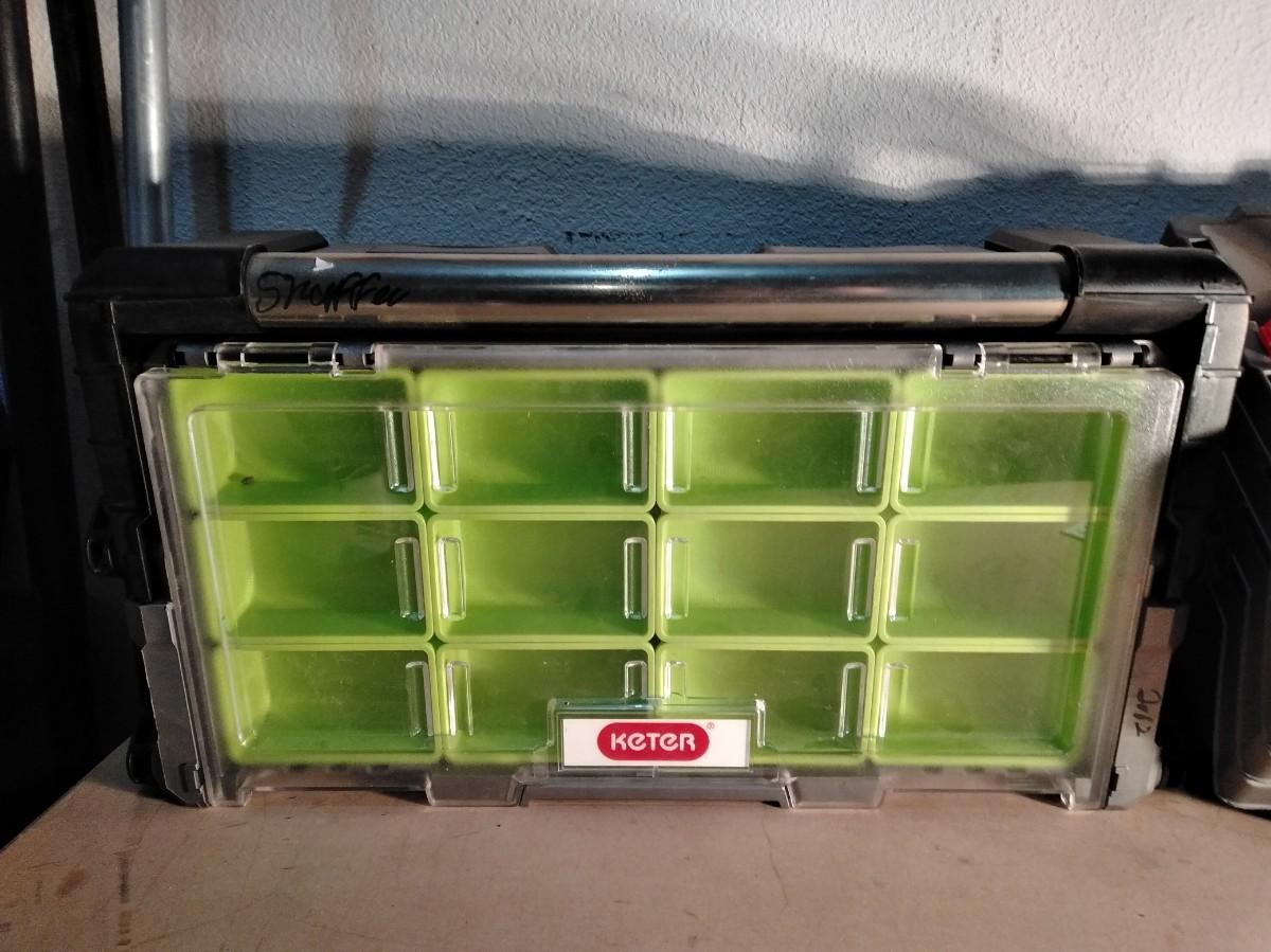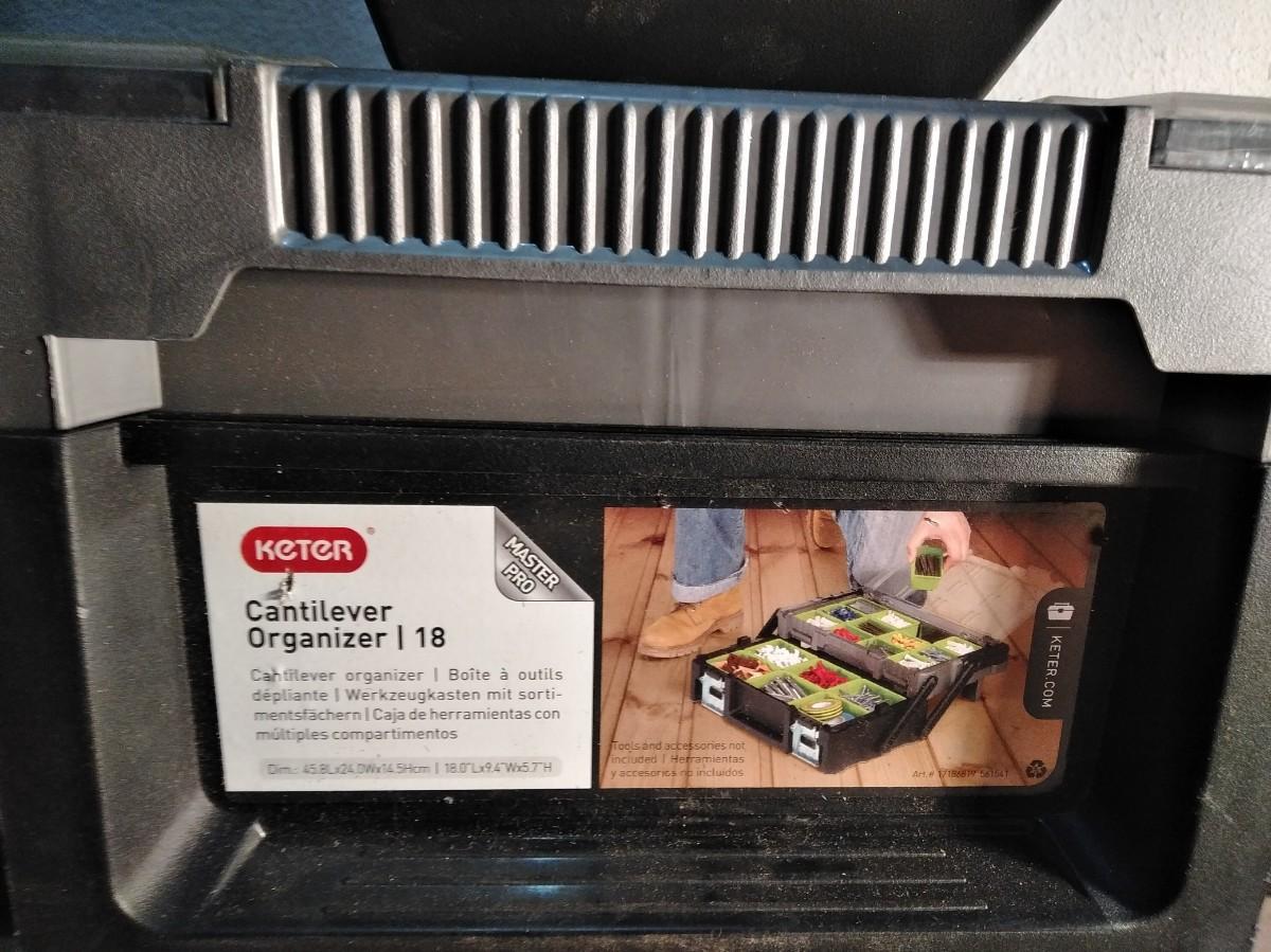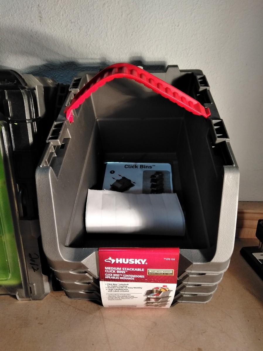 NEW HUSKY MEDIUM STACKABLE CLICK BIN STORAGE SYSTEM, AND A NEW KETER CANTILEVER ORGANIZER.