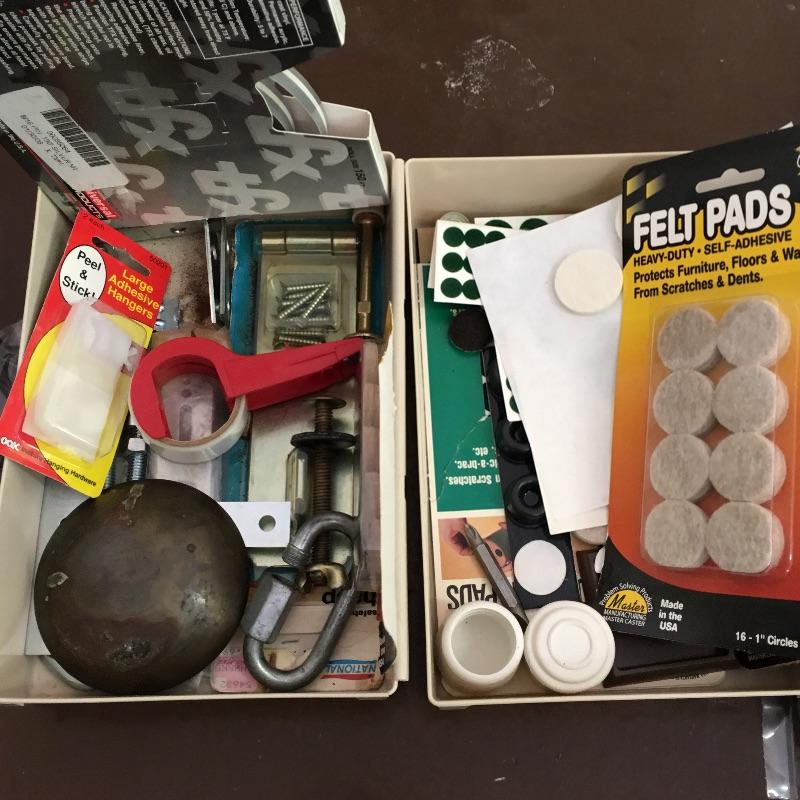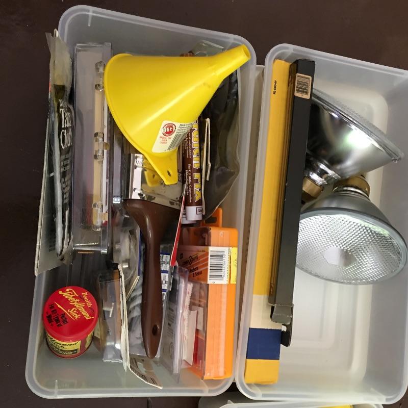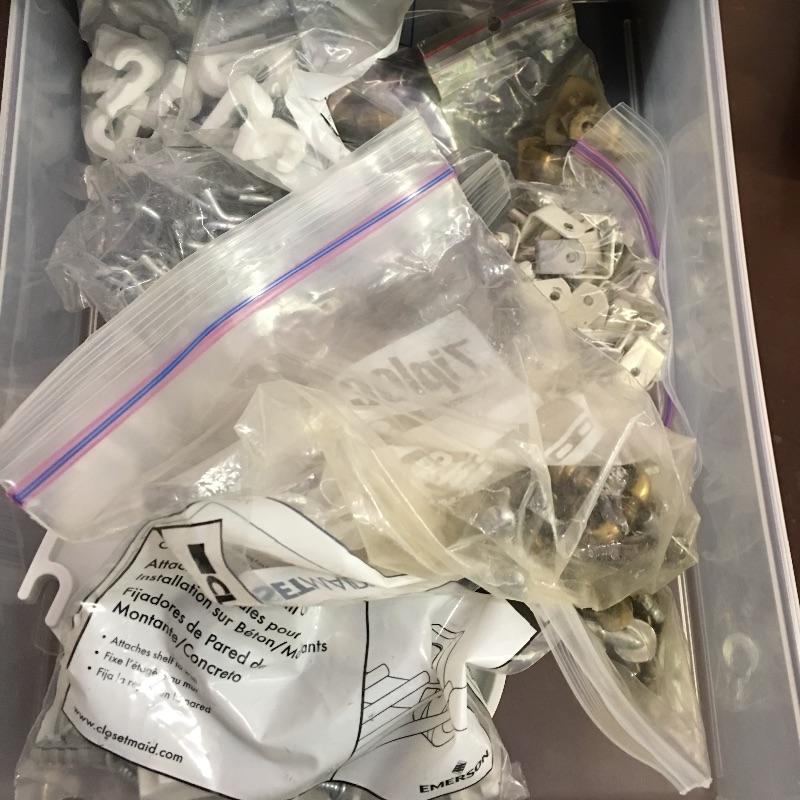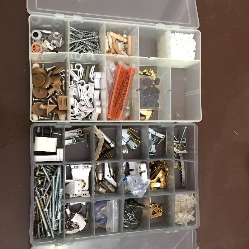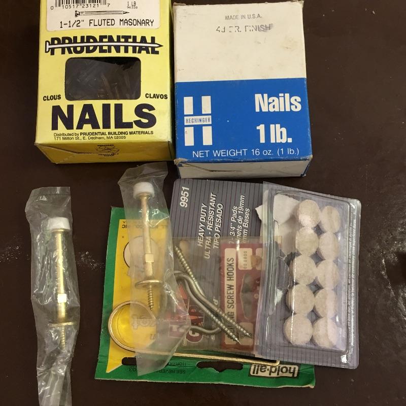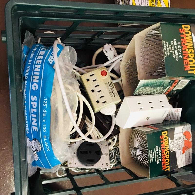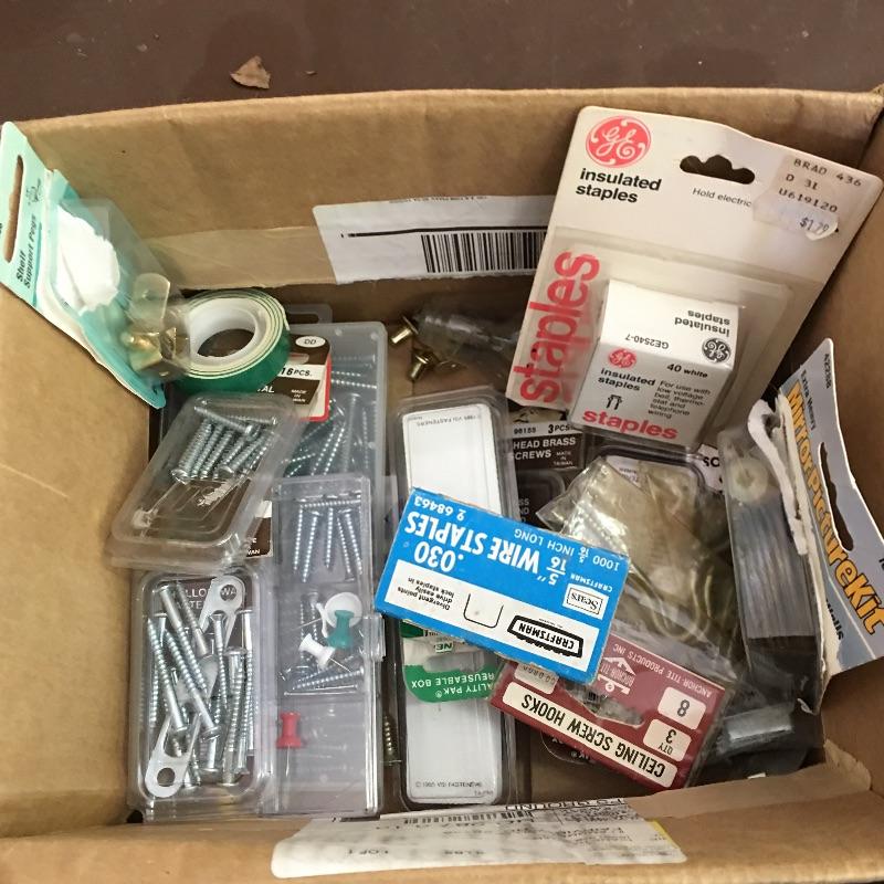 Large selection of household goods including hardware, nails, screws, variety of bulbs, extension cords, spice shelves, tools, step stool, blinds and more - see pictures. Shelves not included.