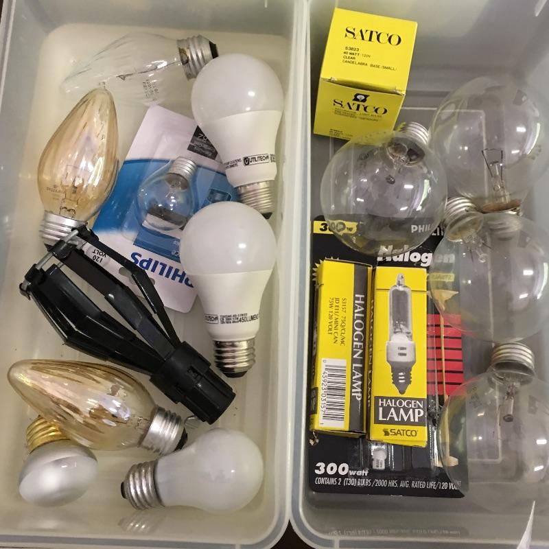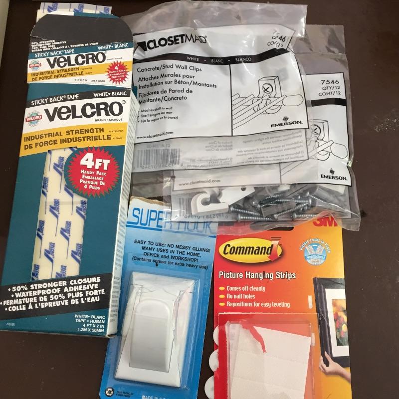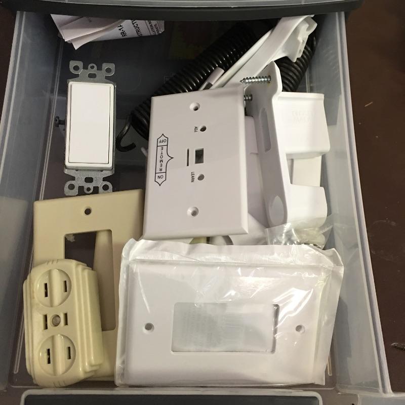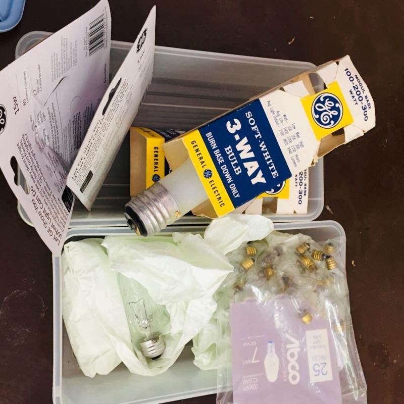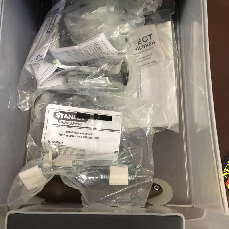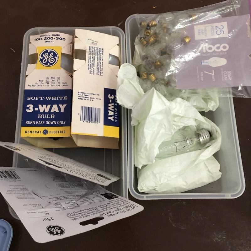 Large selection of household goods including hardware, nails, screws, variety of bulbs, extension cords, spice shelves, tools, step stool, blinds and more - see pictures. Shelves not included.