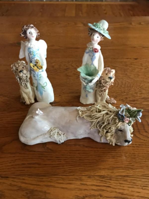 Three ceramic JSP signed figurines. Two ladies with lions figurines and a lion figurine. All are signed JSP