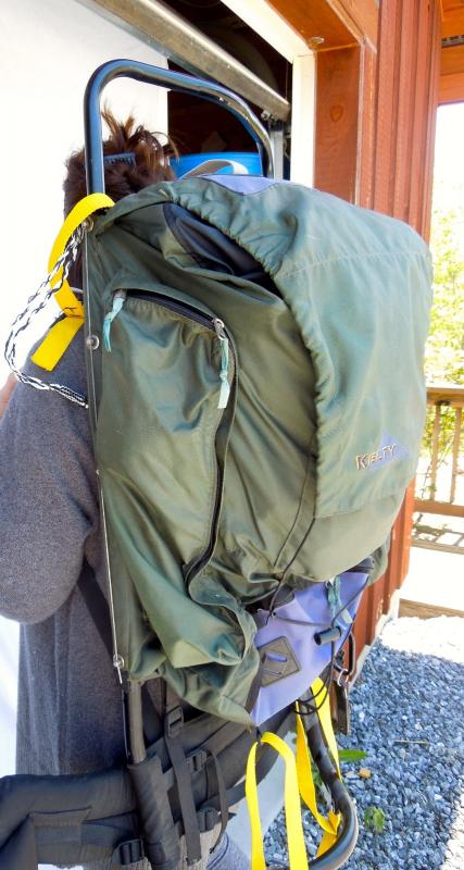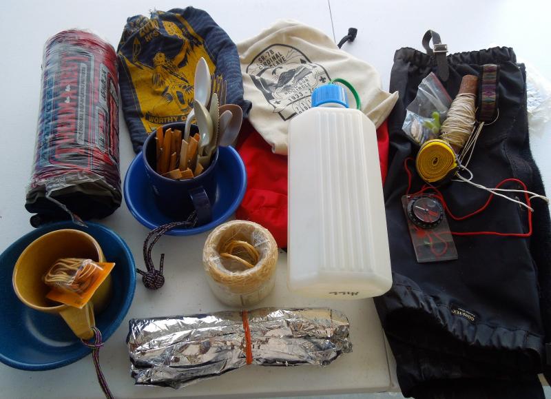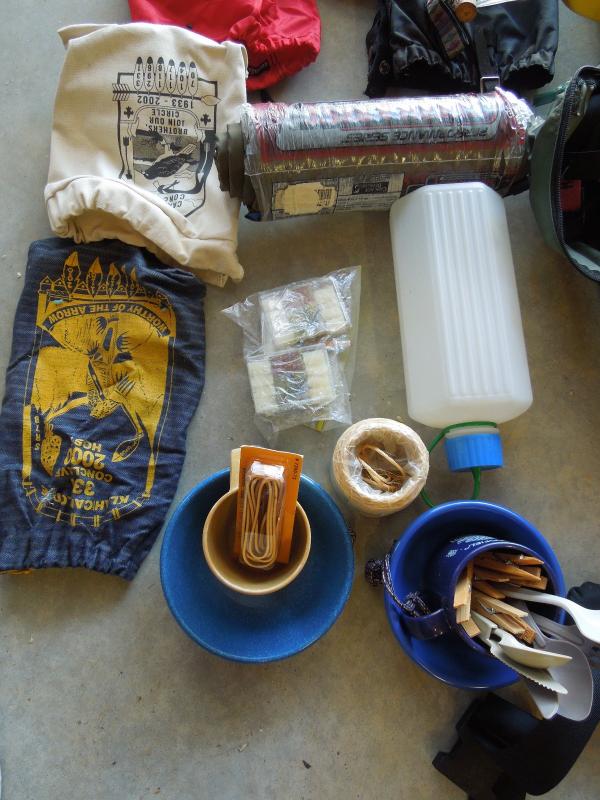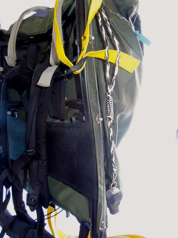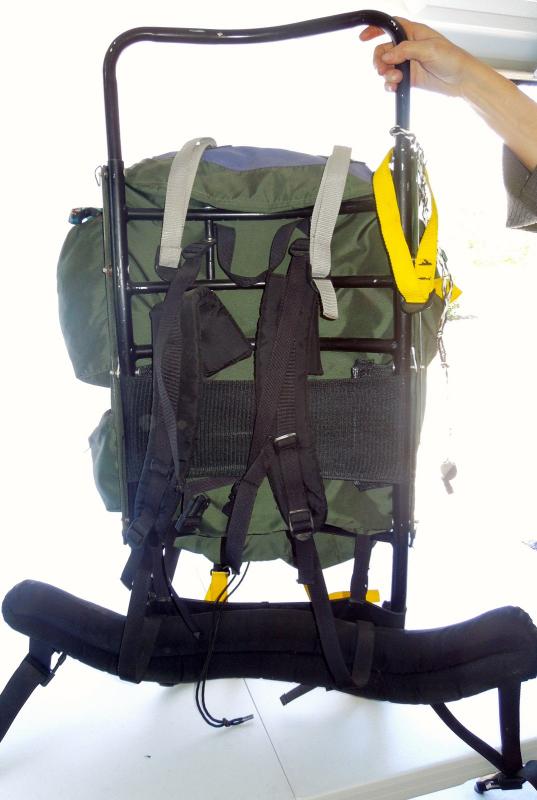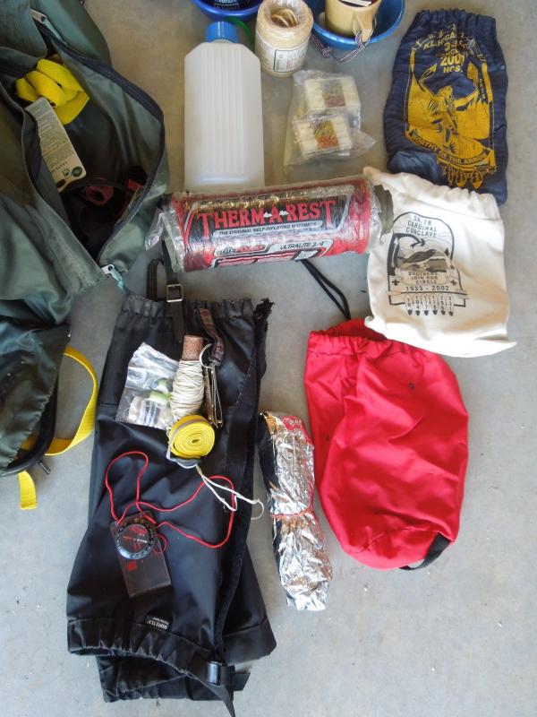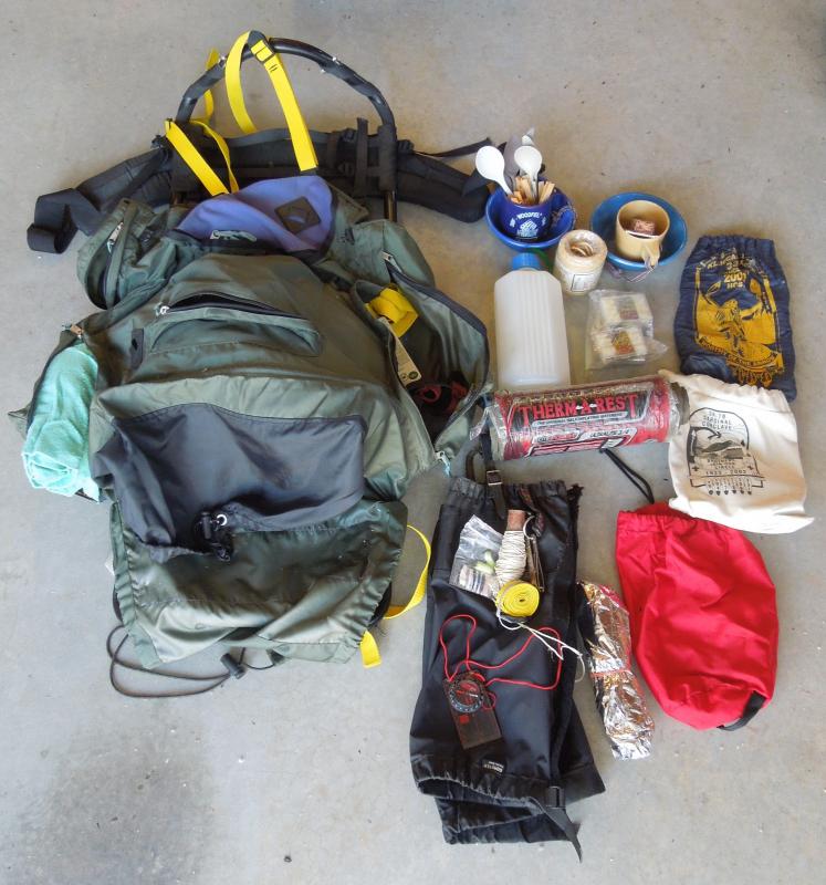 Nice frame with internal and external zippered pockets, cinch belt. Filled with single Thermarest cushion; cloth gear bags; water bottle; drinking cups; compass; wicking towel; twine and nylon straps