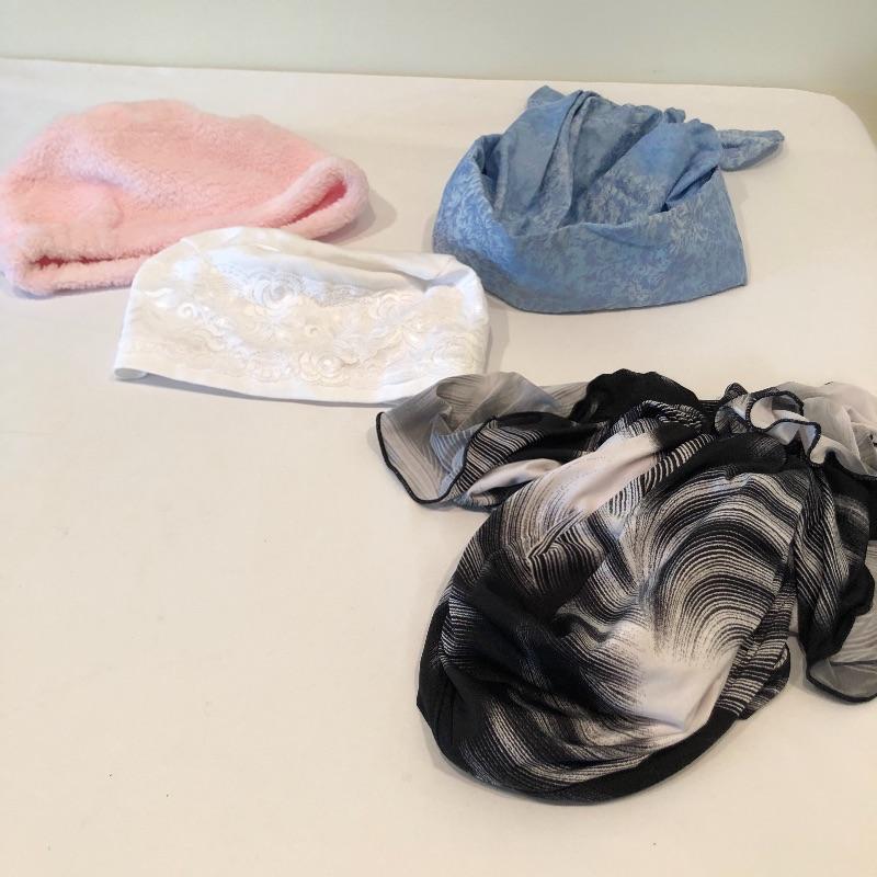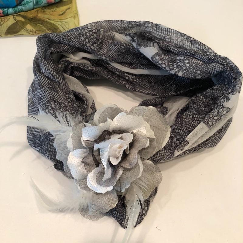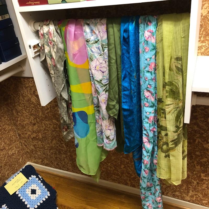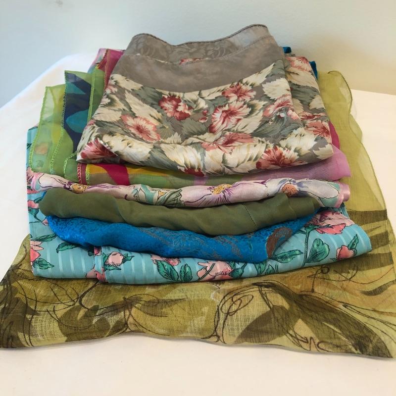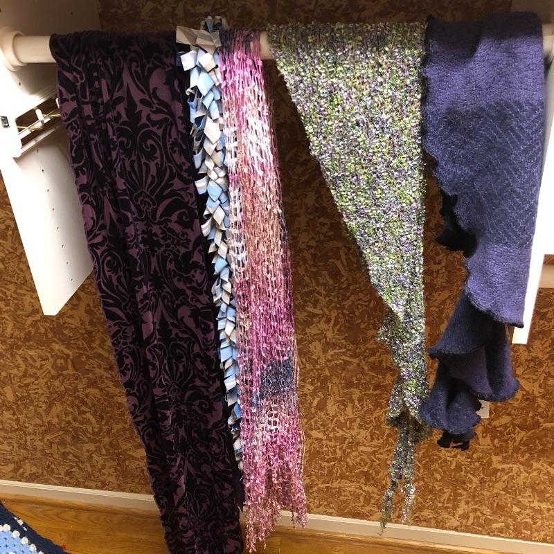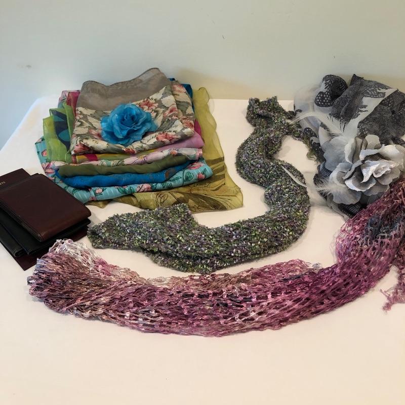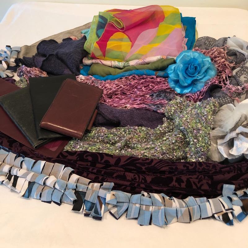 Over 12 scarves in this lot of ladies accessories that includes a stunning purple wrap-around scarf that has a safety clipped tag that says merino wool; it’s a lovely soft wool scarf. The other scarves come in a variety of colors and lengths. Also included are some wallets, head scarves and more.