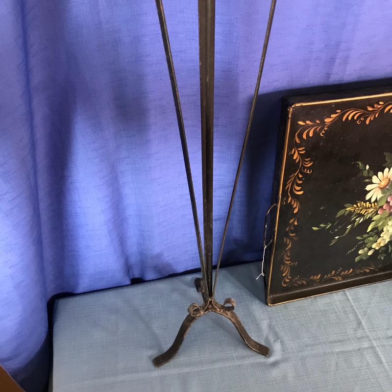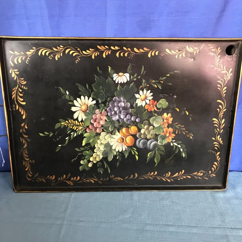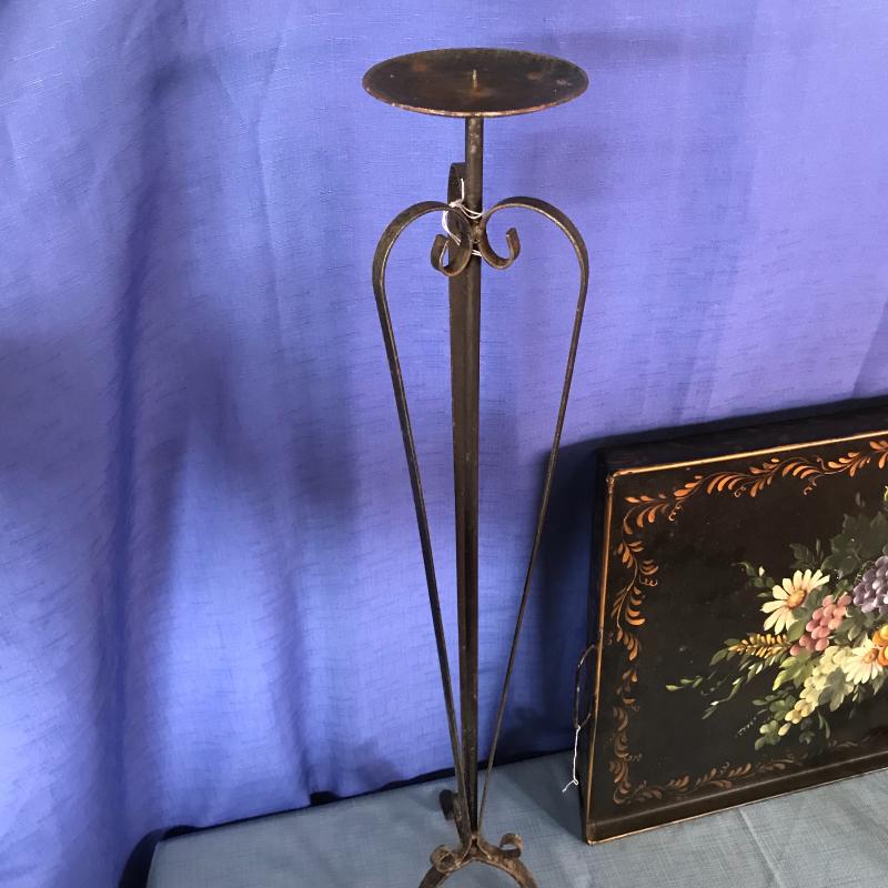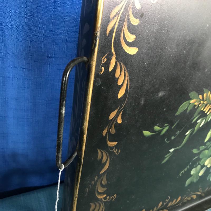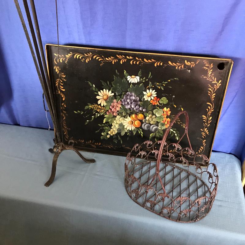 Lot includes hand painted metal tray (approx. 26” x 18” x 3.5”), metal basket, and tall candleholder (approx. 32” tall). Tray is about 2" thick, has one handle and hole on side. Must have other uses. No shipping available. Local pickup only in Maggie Valley, NC.