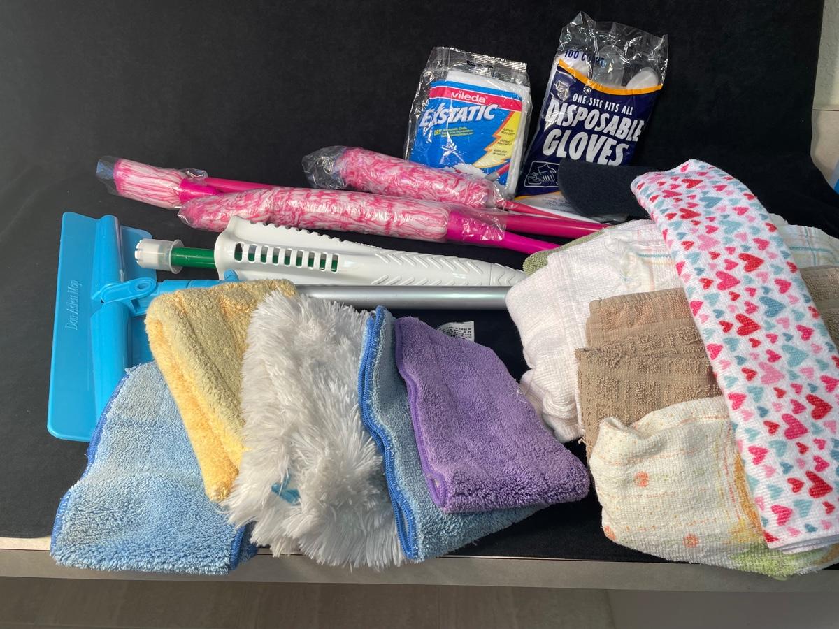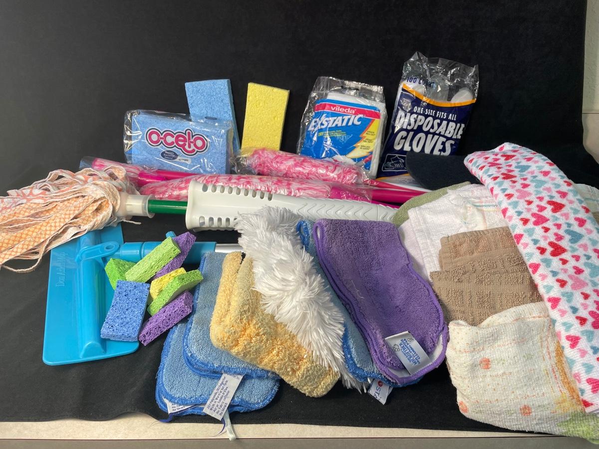 Pink brand dusting assortment, sponges, floor tool with assortment of cleaning interchangeable cleaning pads, twist mop, dusting cloths, plastic gloves and rags