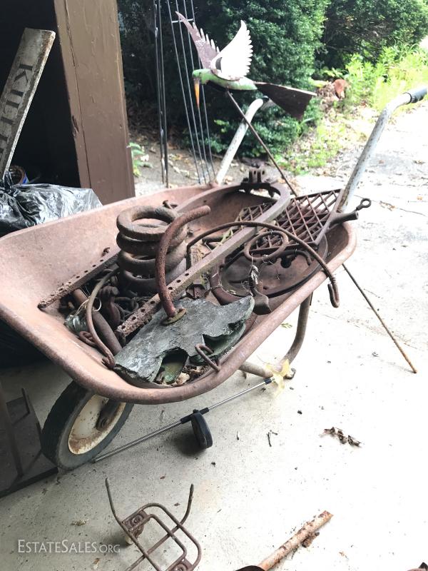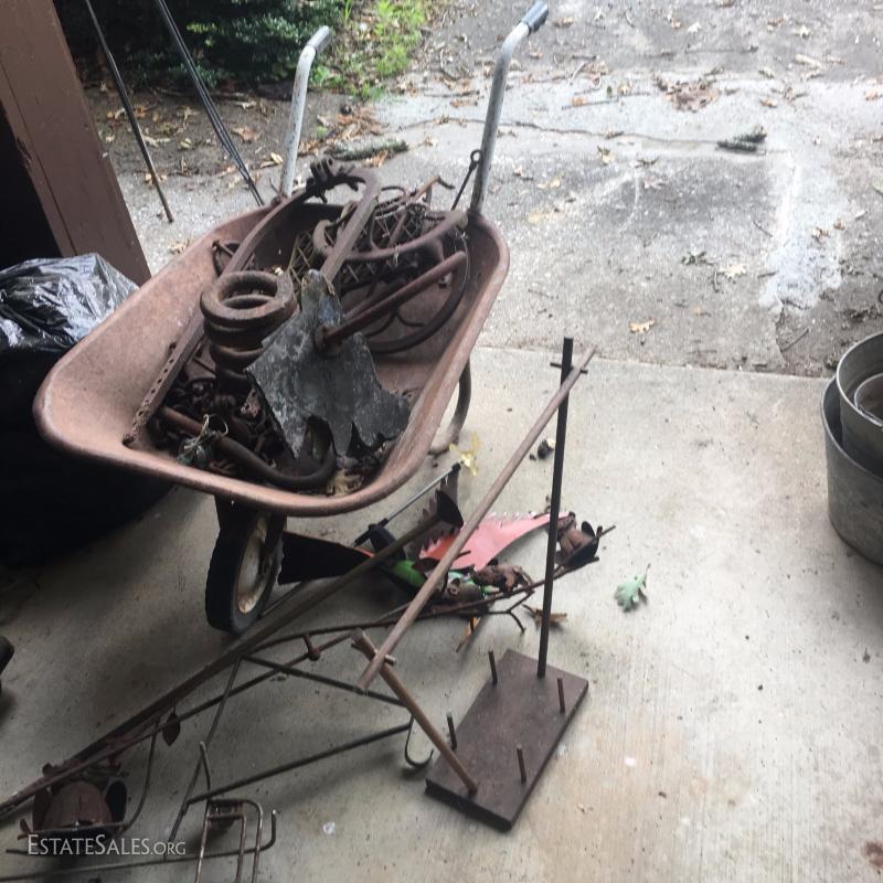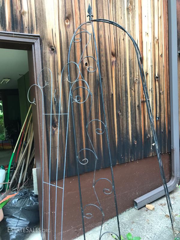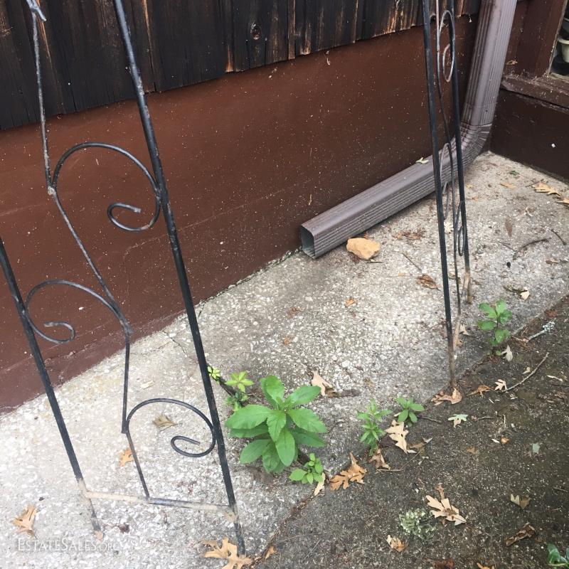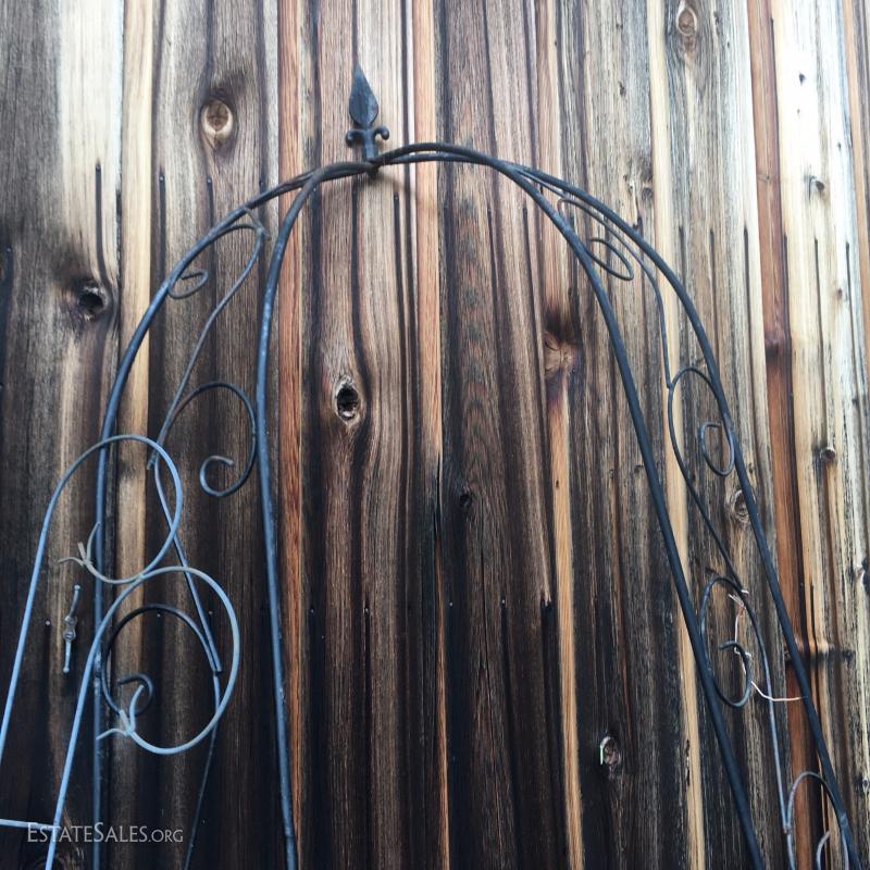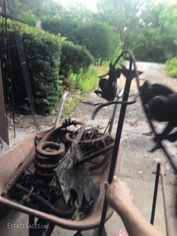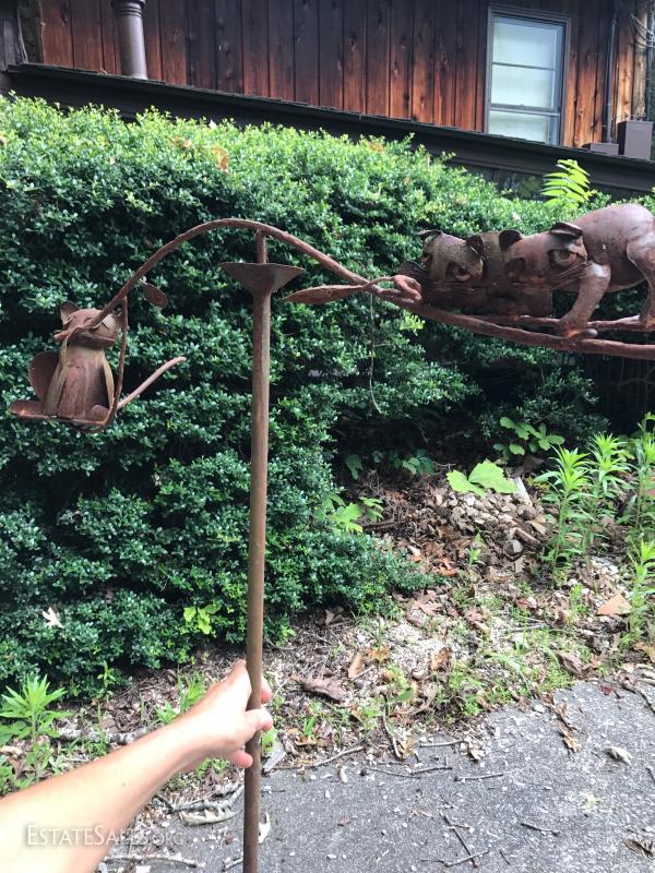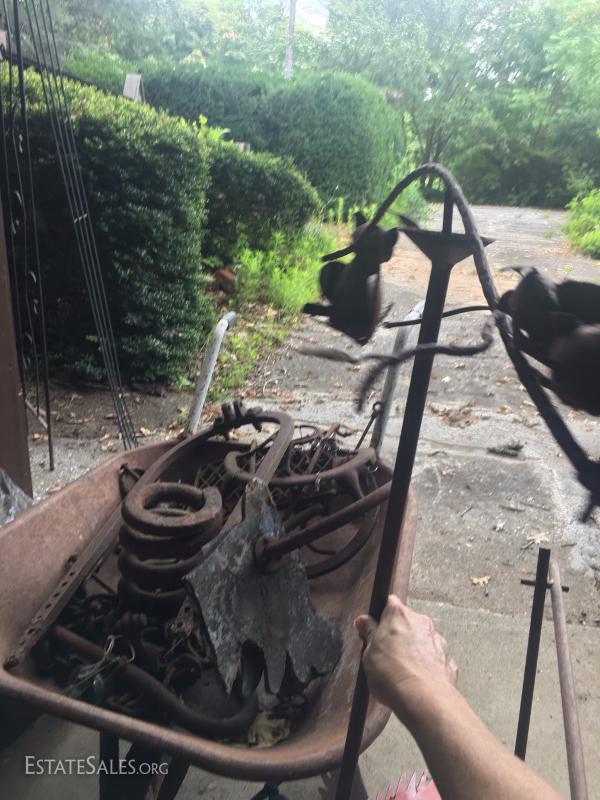 Various rusty pieces of metal art for garden or home. Perfectly weathered. Includes cart. Colorful metal bird on post. Cat art on post. Two metal Trellis. Small trellis is 6' tall. Large arch is 8' tall at center.