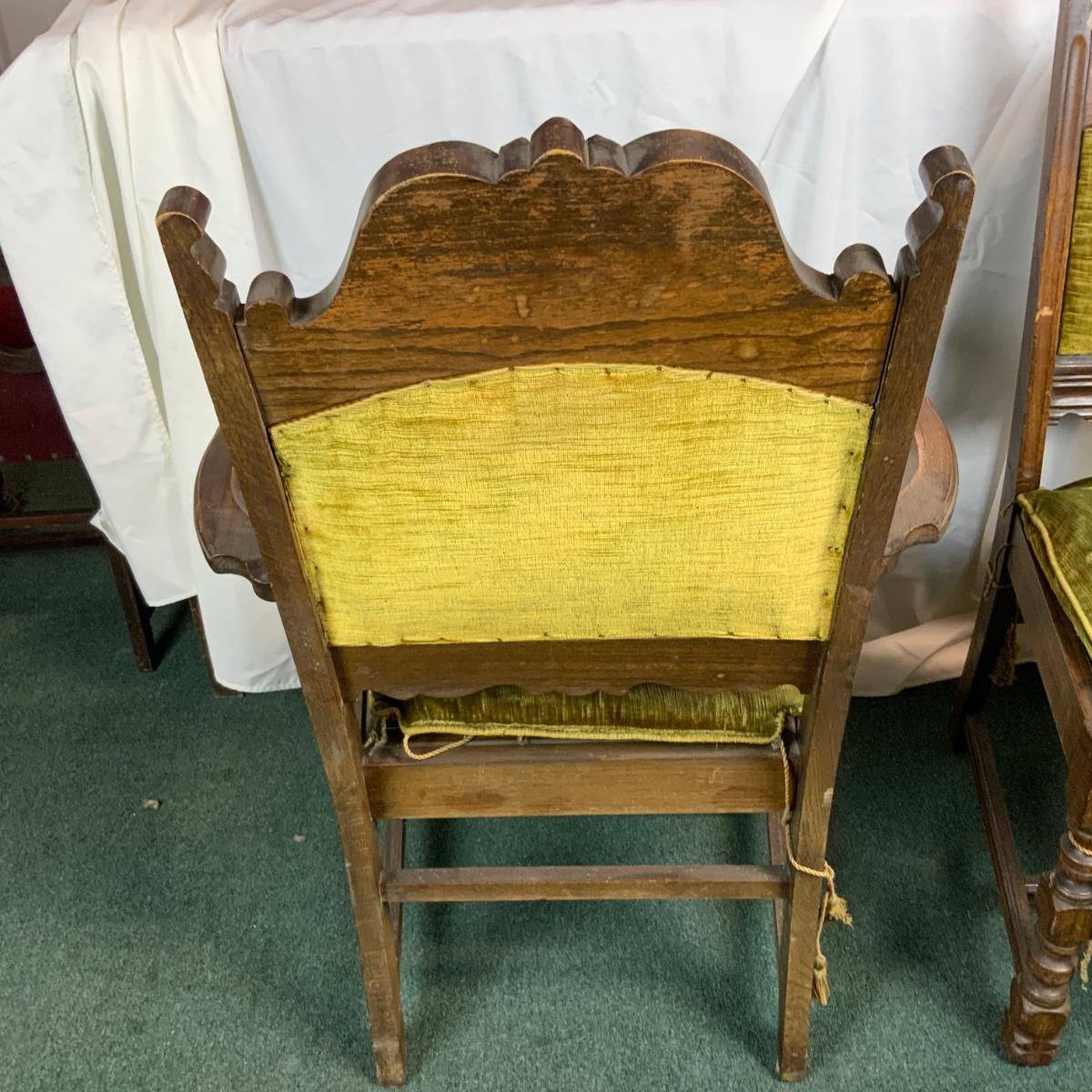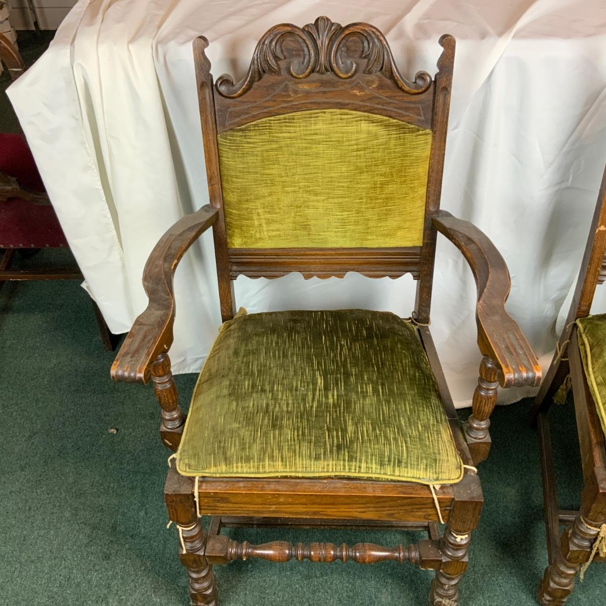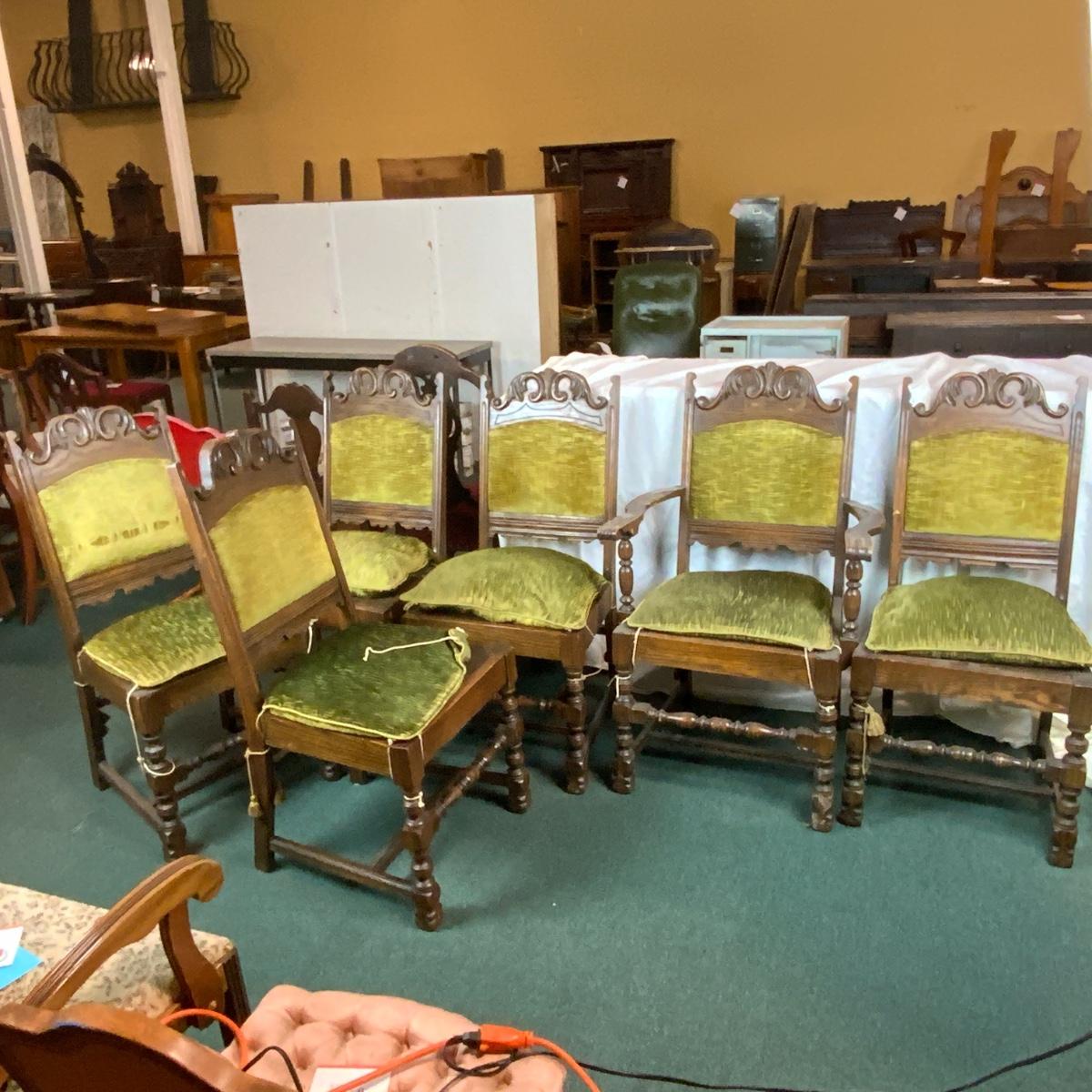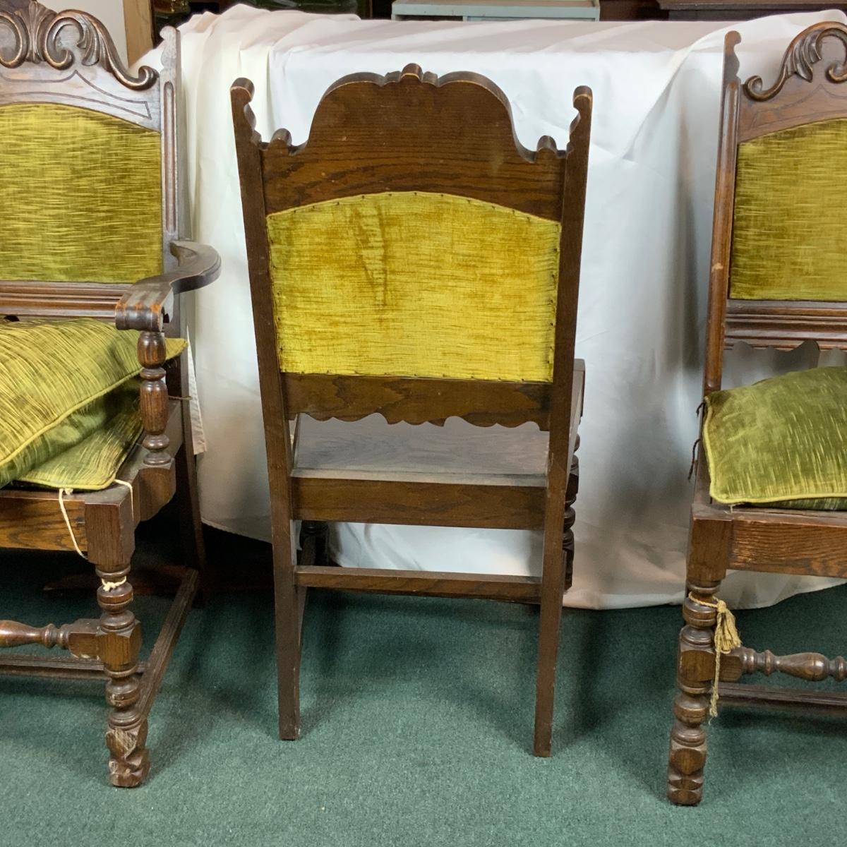 Six Tudor dining chairs. All are in incredible condition. You could very easily get new cushions made and have these be an impressive part of your dining room. Very sturdy very comfortable. One kings chair with arms. //::\\ Please see photos for details and condition. No attempt has been made to hide any imperfections. All items listed in this auction are warehouse items, and need to be cleaned. A majority of the items need restoration as well. All items are sold AS IS and WITHOUT GUARANTEE. If you are uncertain about an item, DO NOT BID. Due to the nature of this online auction in-person inspection is HIGHLY recommended. All Sales are FINAL. Pick Up Times are FIRM. Please confirm with your own schedule that you can pick up in the scheduled times listed in the Terms and Conditions. Any questions please message the auctioneer. DO NOT Contact The Harp Gallery.