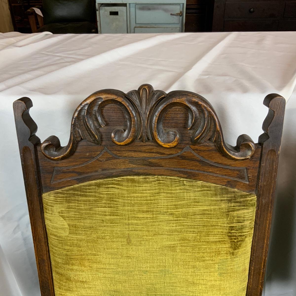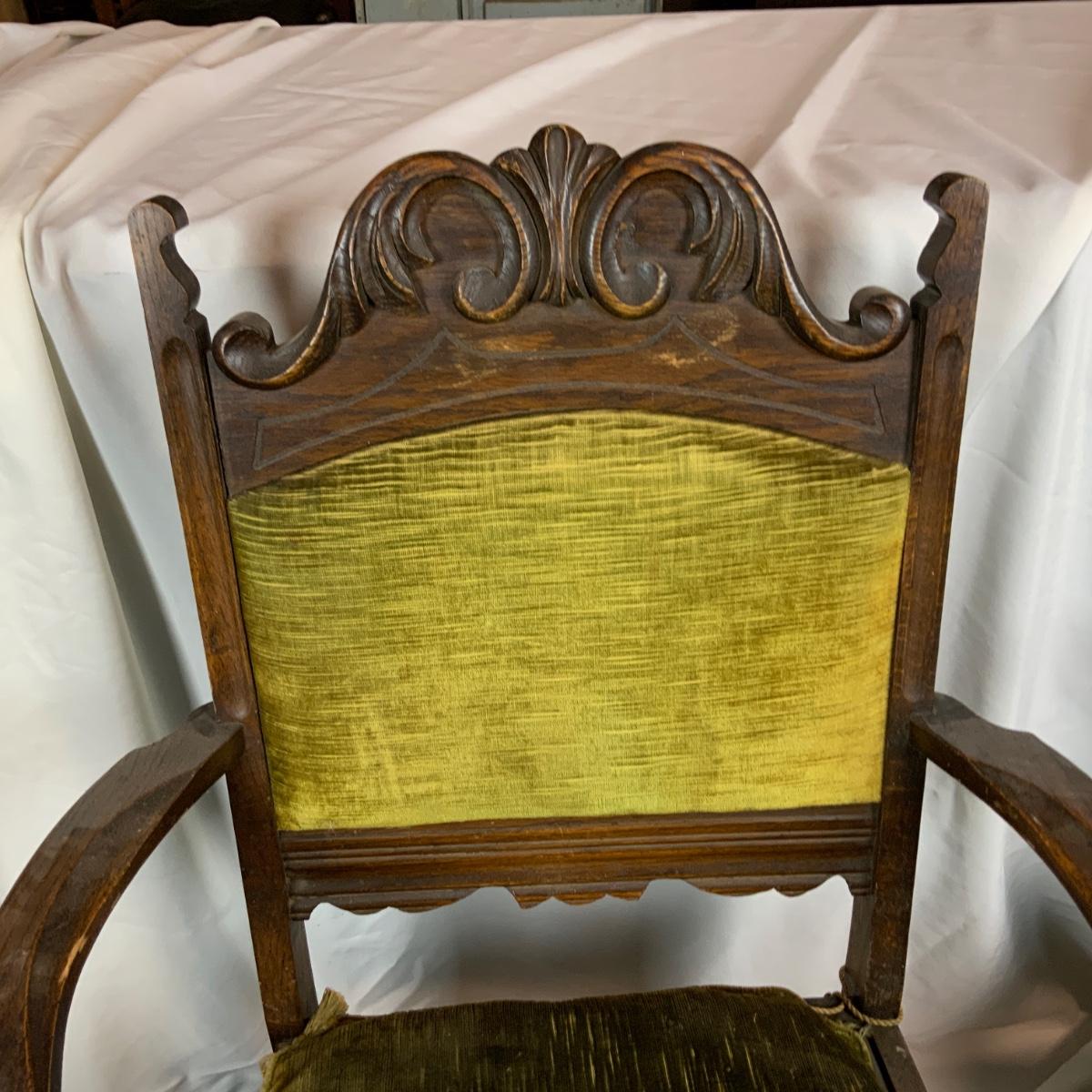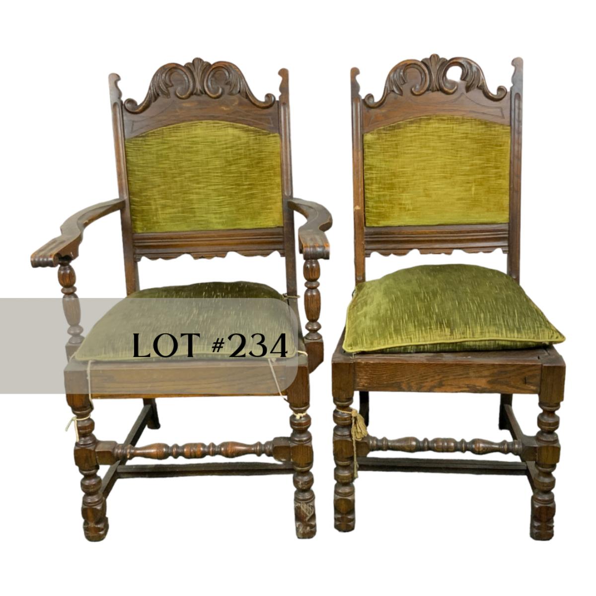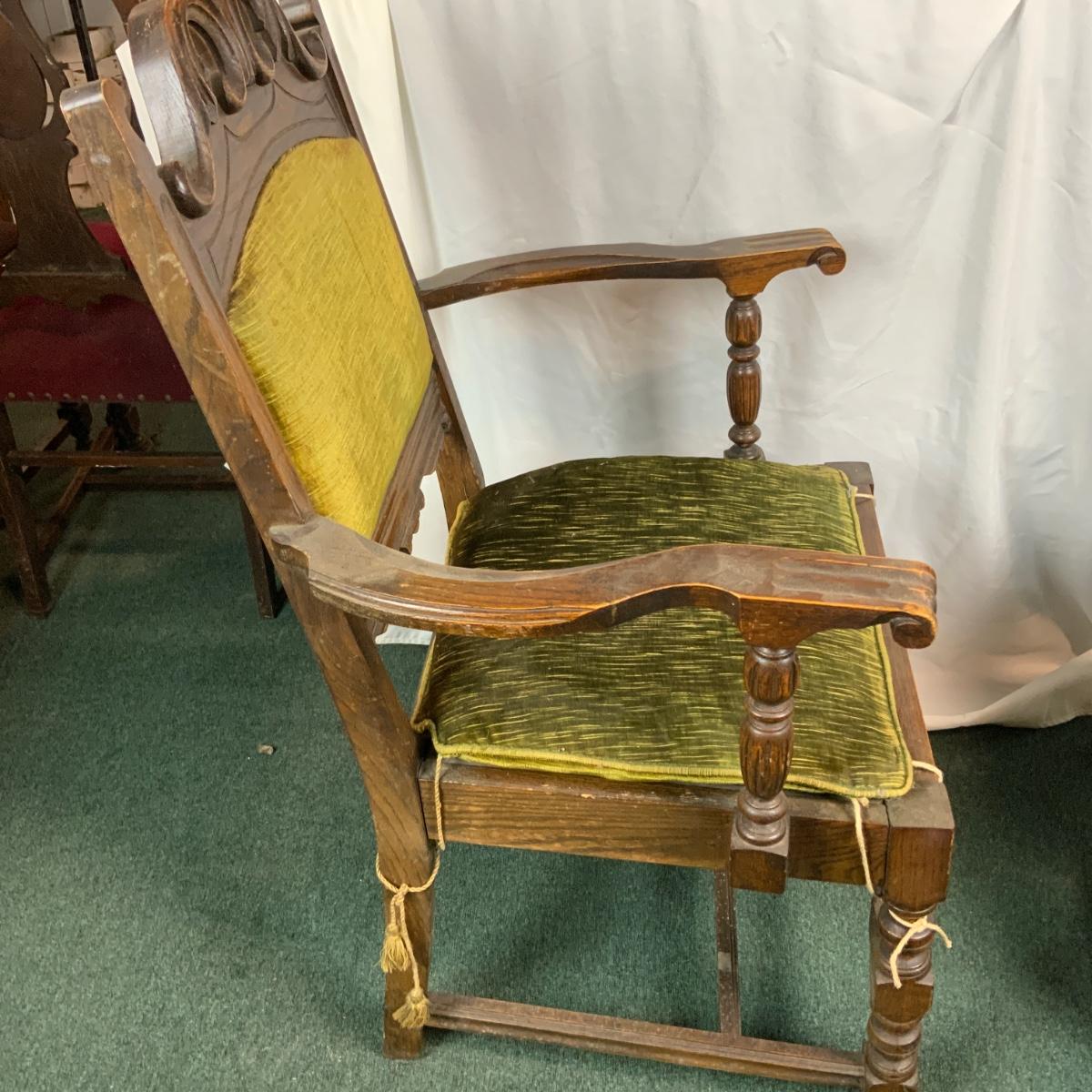 Six Tudor dining chairs. All are in incredible condition. You could very easily get new cushions made and have these be an impressive part of your dining room. Very sturdy very comfortable. One kings chair with arms. //::\\ Please see photos for details and condition. No attempt has been made to hide any imperfections. All items listed in this auction are warehouse items, and need to be cleaned. A majority of the items need restoration as well. All items are sold AS IS and WITHOUT GUARANTEE. If you are uncertain about an item, DO NOT BID. Due to the nature of this online auction in-person inspection is HIGHLY recommended. All Sales are FINAL. Pick Up Times are FIRM. Please confirm with your own schedule that you can pick up in the scheduled times listed in the Terms and Conditions. Any questions please message the auctioneer. DO NOT Contact The Harp Gallery.