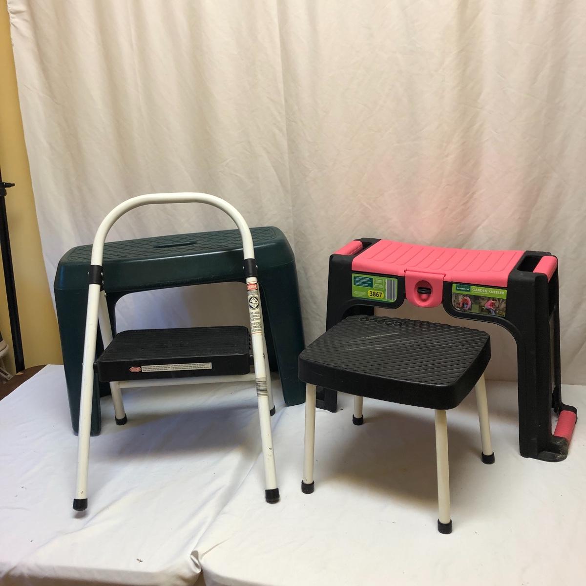 When you need a little more height, these stools will be perfect. This lot includes four stools: one folding and one solid Cosco stools with metal frames, and two plastic step stools (Step2 and Gardenline seat and kneelers). The largest stool measures 10.5” x 22” x 16”.