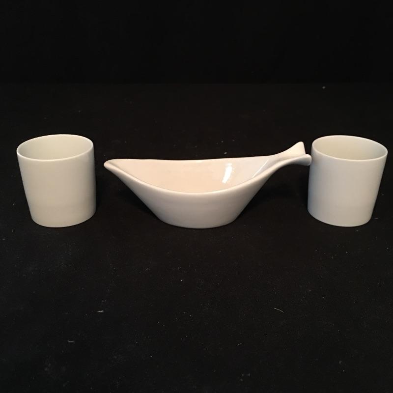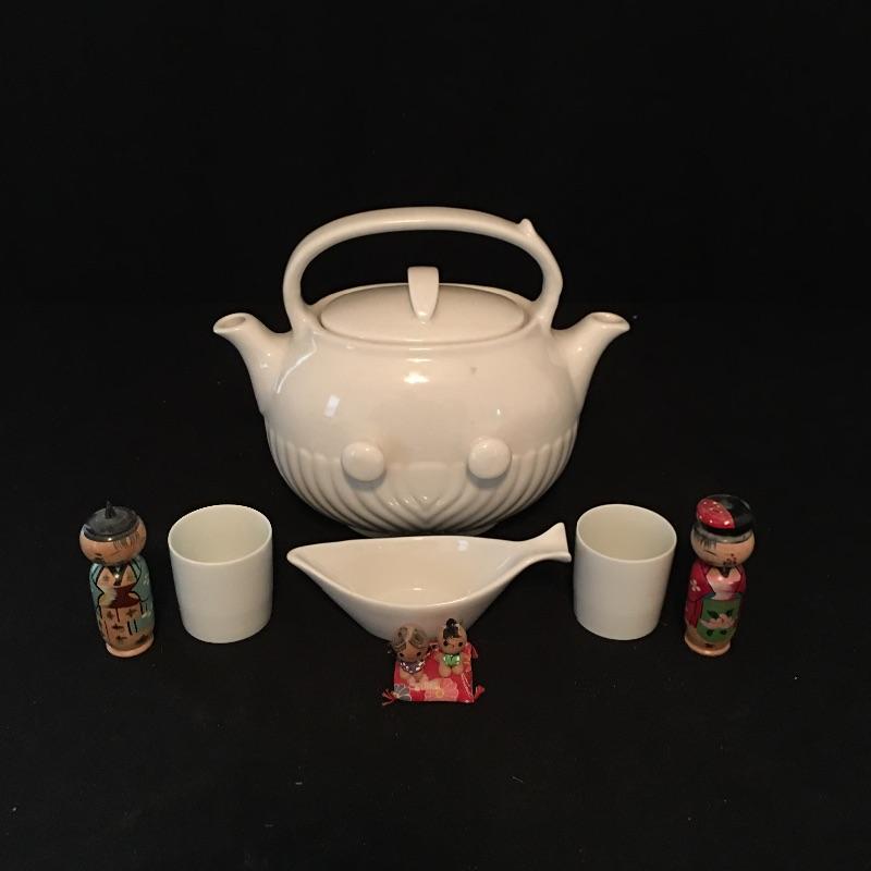 Taste of Asia includes Forman Tip Pot, two H&Co cups, small bowl by Form and two wooden figurines with two small figurines on a cloth.