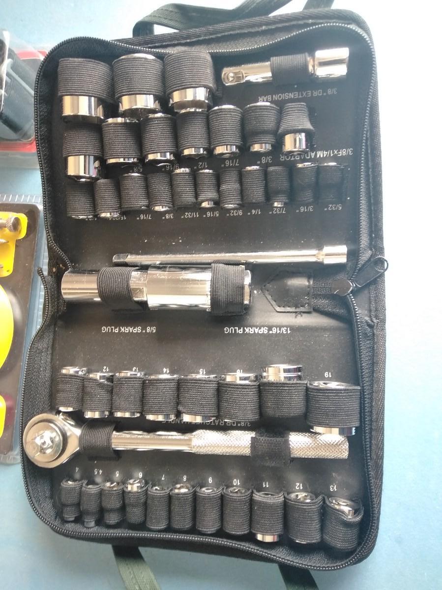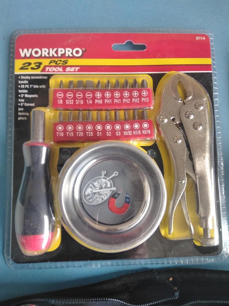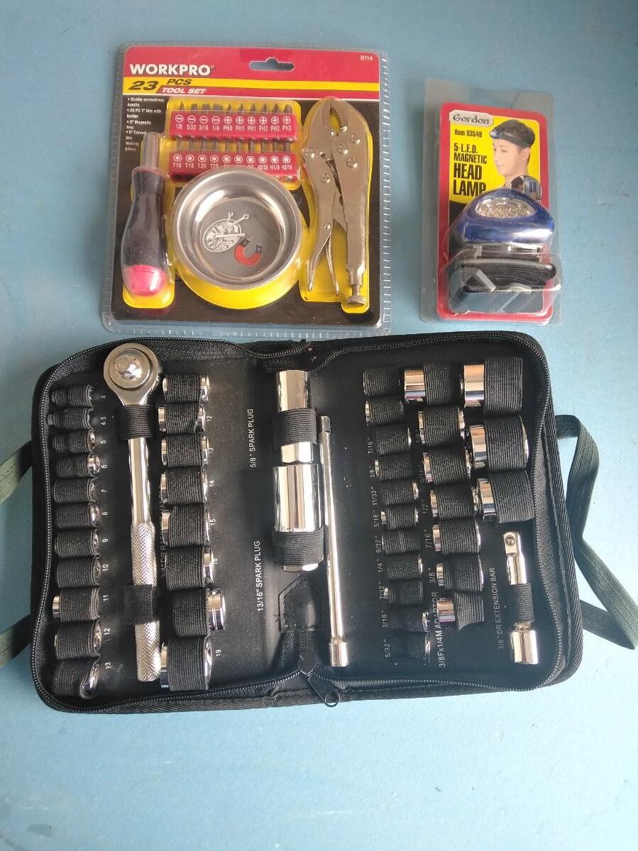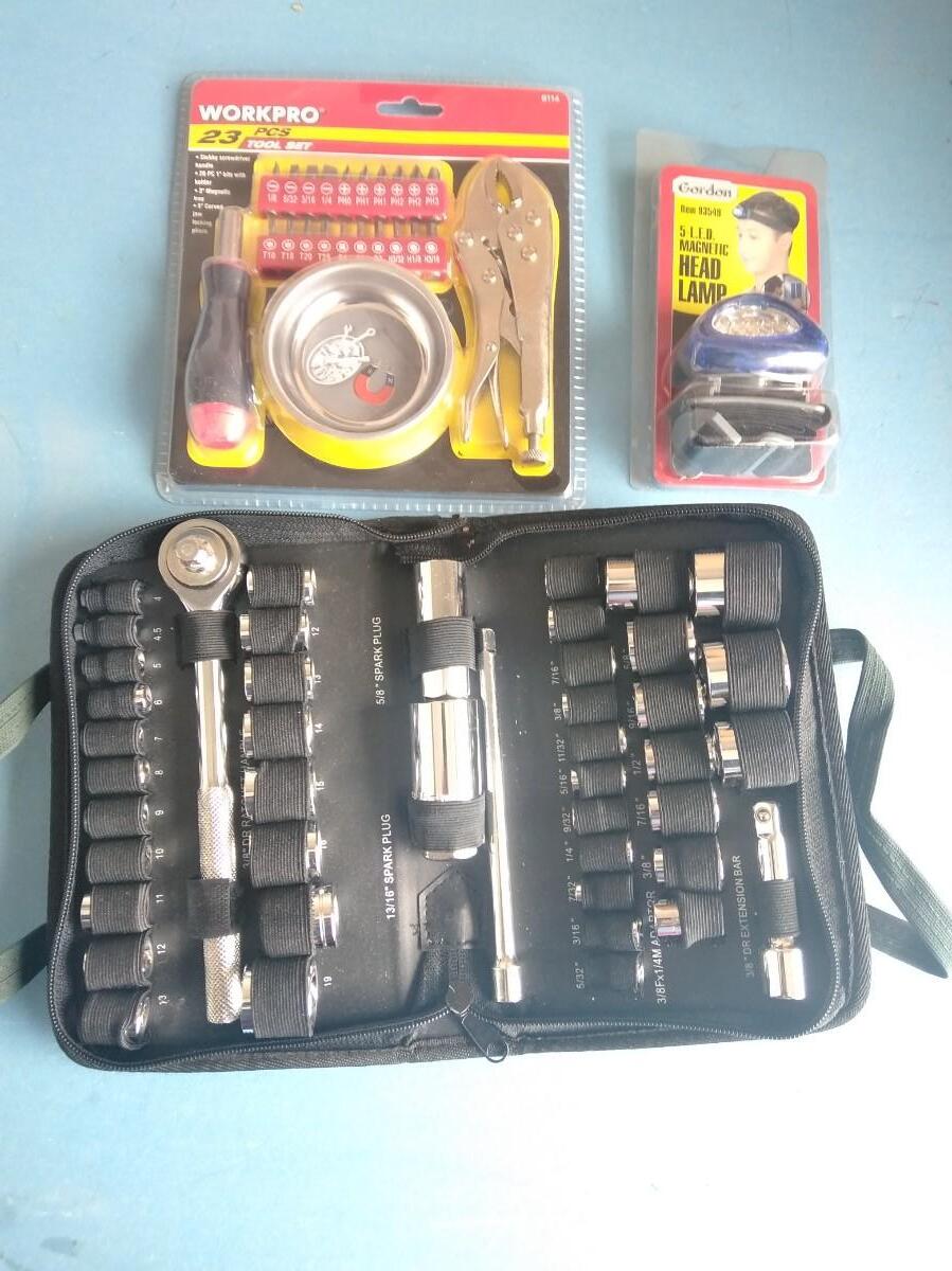 SOCKET SET FOR THE TRUCK IN A NICE CANVAS BAG, WORKPRO 23 PIECE TOOL SET WITH MAGNET TRAY, AND A GORDON 5 LED MAGNETIC HEAD LAMP.
