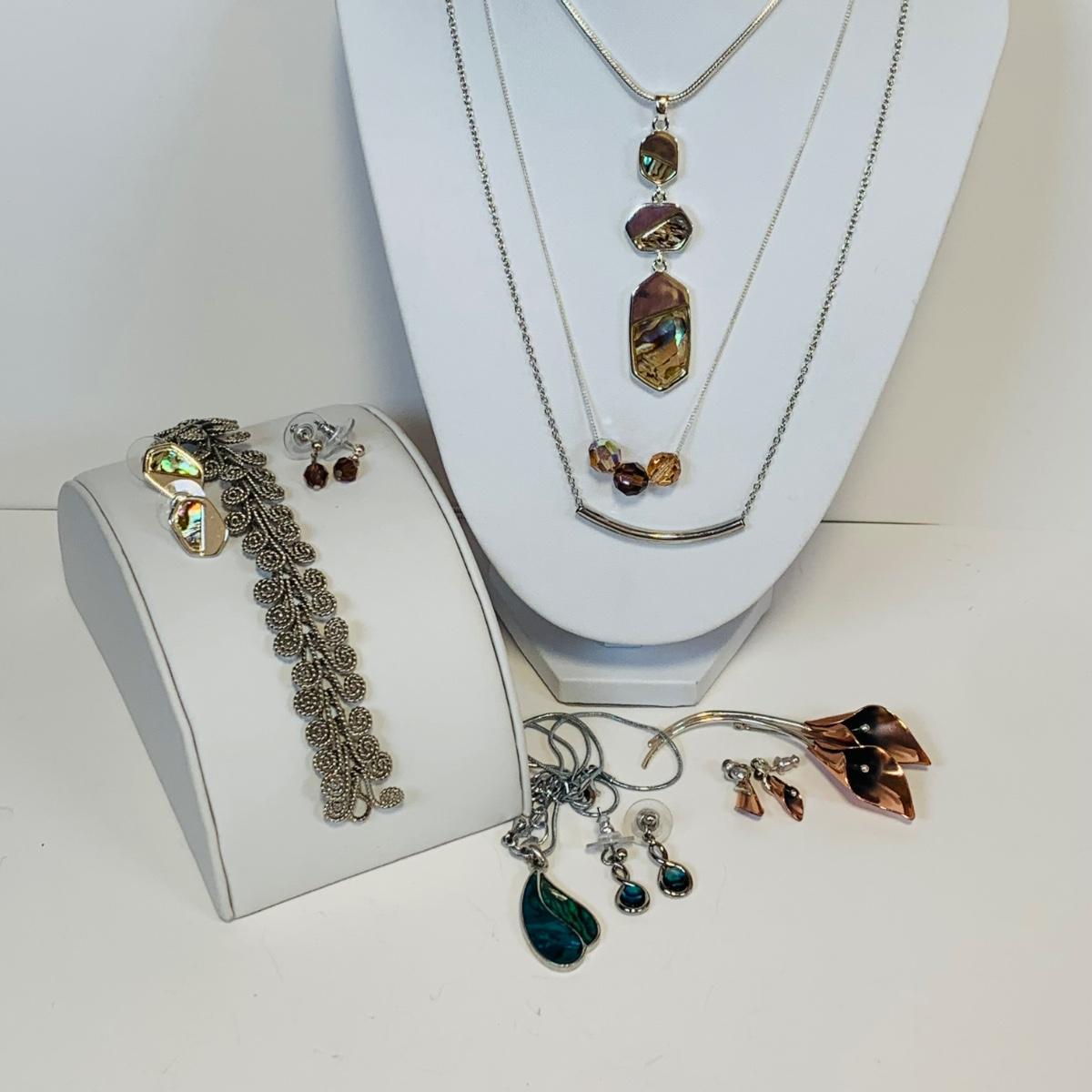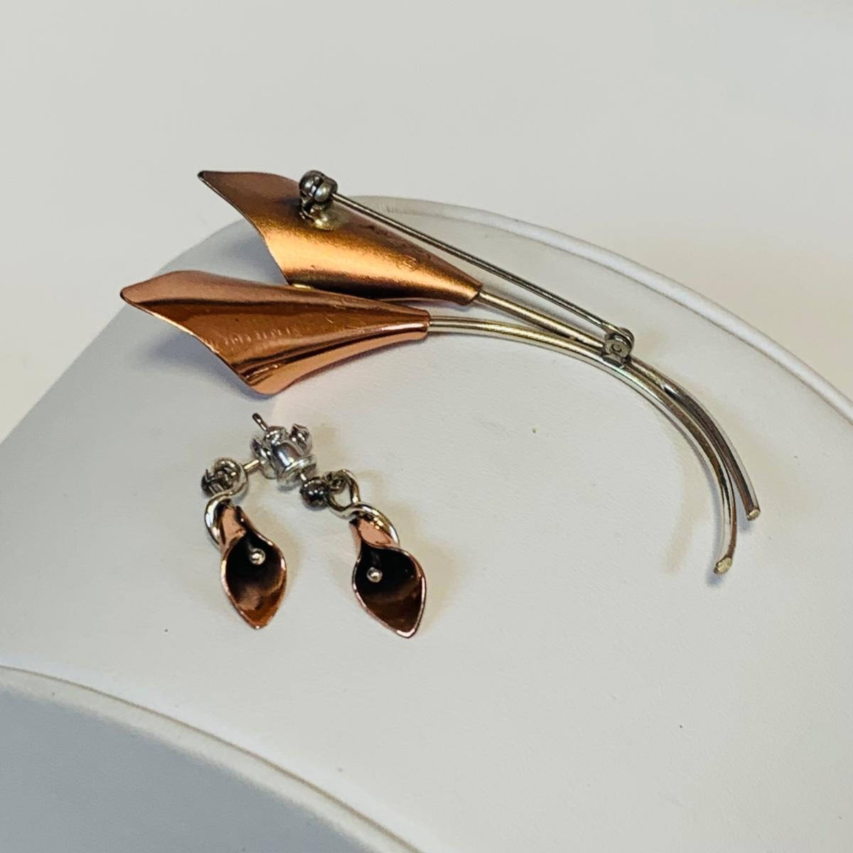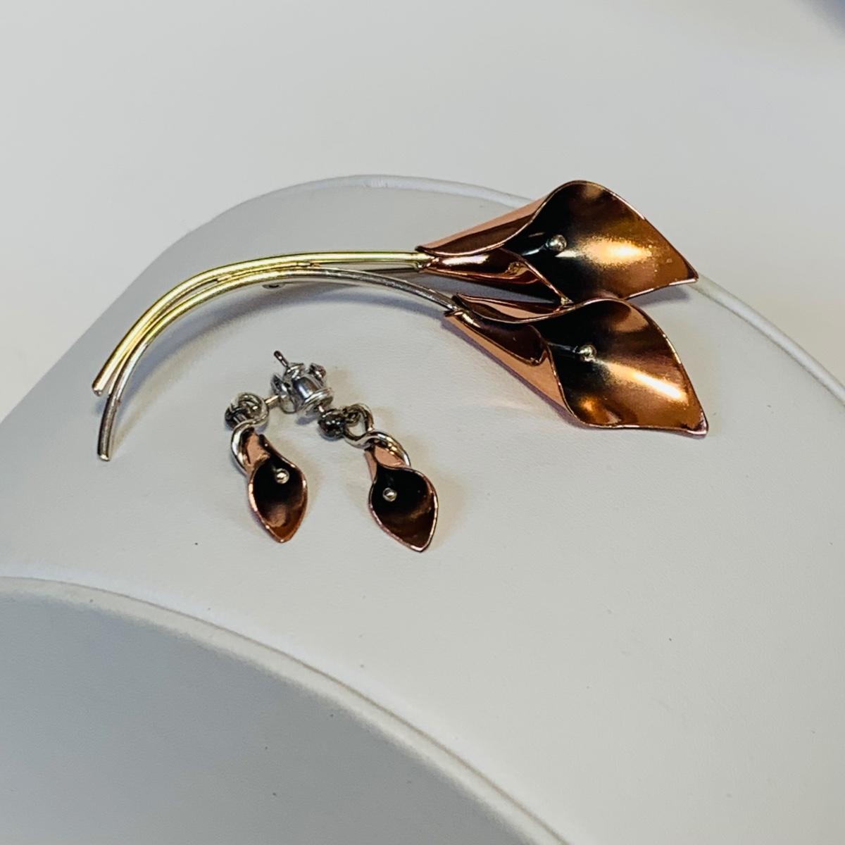 Lot 235: Stuart NYE Copper Brooch Calla Lily Silver Pin & Earring, Slide Necklace, Silver Tone Necklaces & More