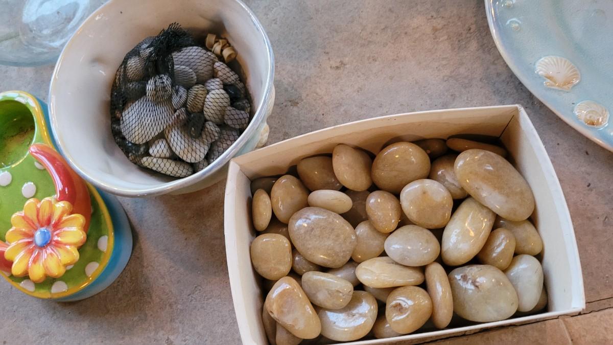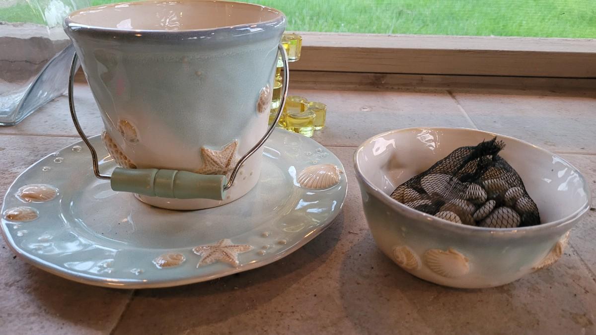 Lot 235: Beach Theme Deco- Pottery Barn Table Runner,  Matching Ceramic Plate/Bowl/Pail, Rocks Fish Bowls and Candleholder