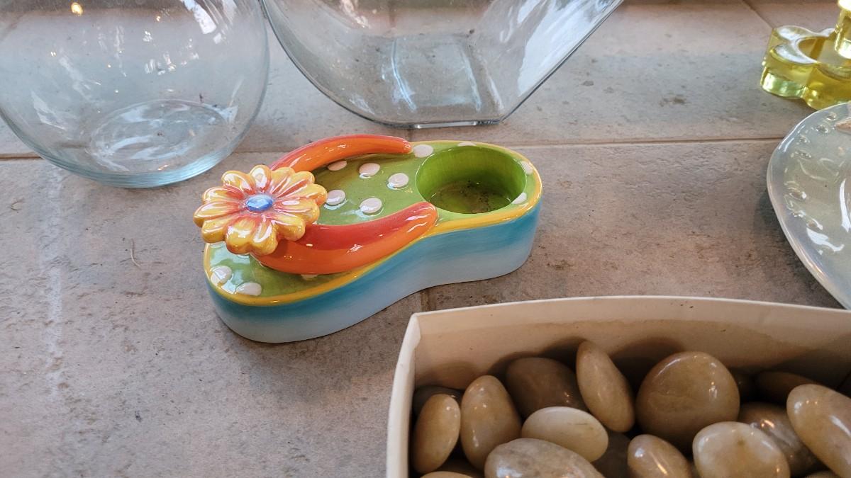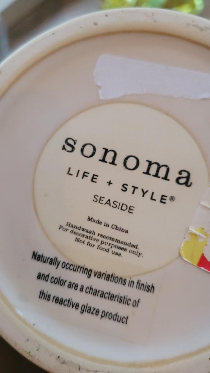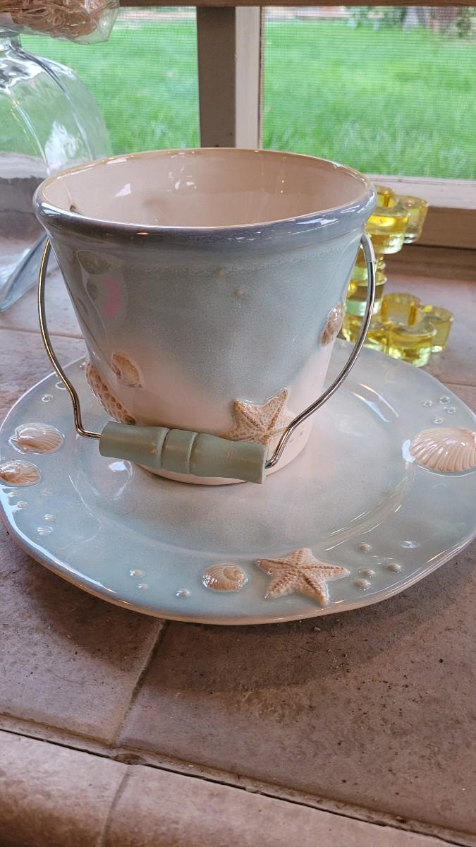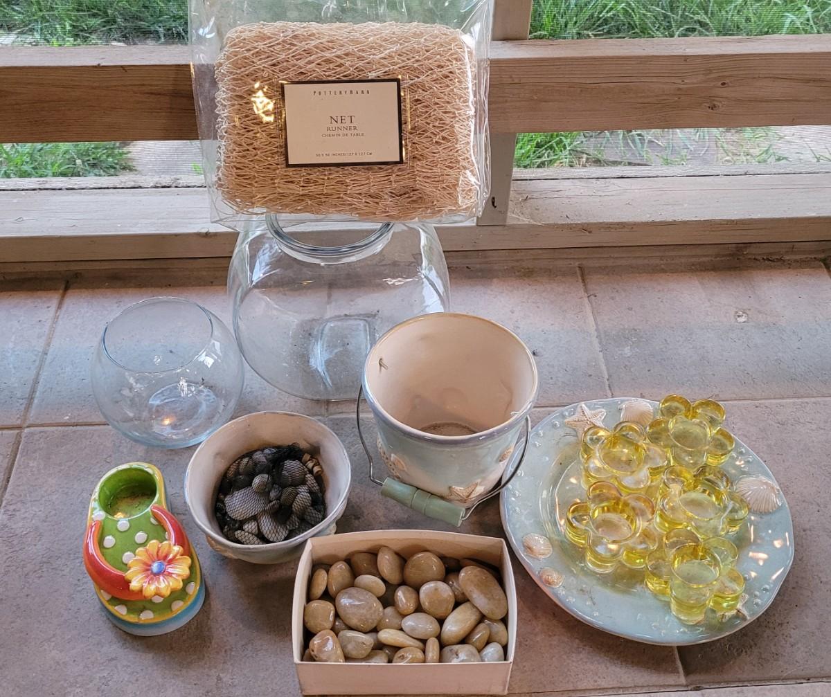 Lot 235: Beach Theme Deco- Pottery Barn Table Runner, Matching Ceramic Plate/Bowl/Pail, Rocks Fish Bowls and Candleholder