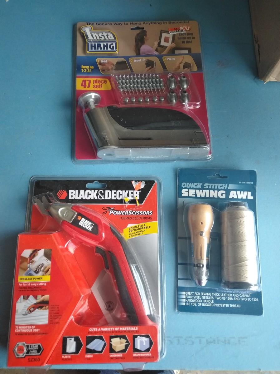 ALL NEW ITEMS! BLACK AND DECKER POWER SCISSORS, 47 PIECE INSTA HANG TOOL, AND A QUICK STITCH SEWING AWL.