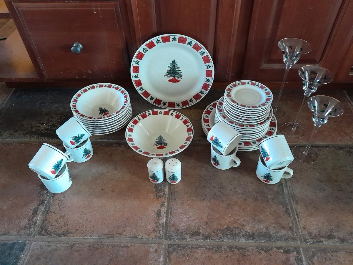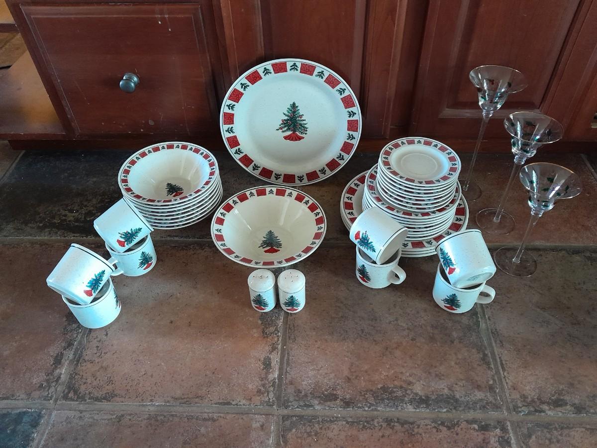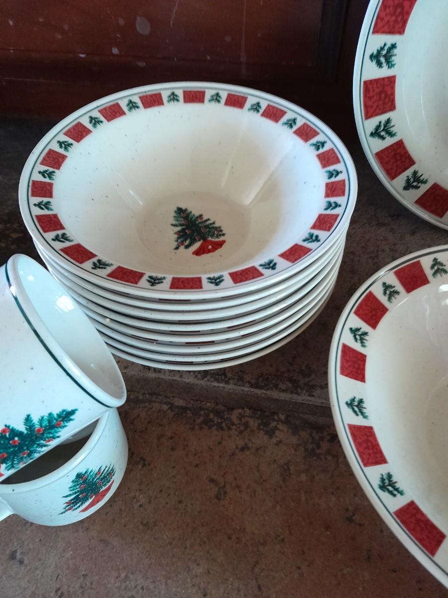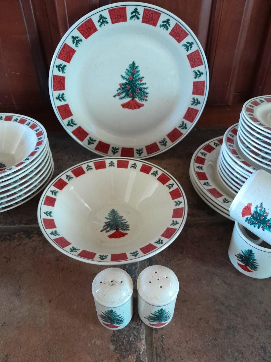 CHRISTMAS DISHWARE, NICE INCOMPLETE SET OF FOLK CRAFT HOLIDAY HOMECOMING STONEWARE.