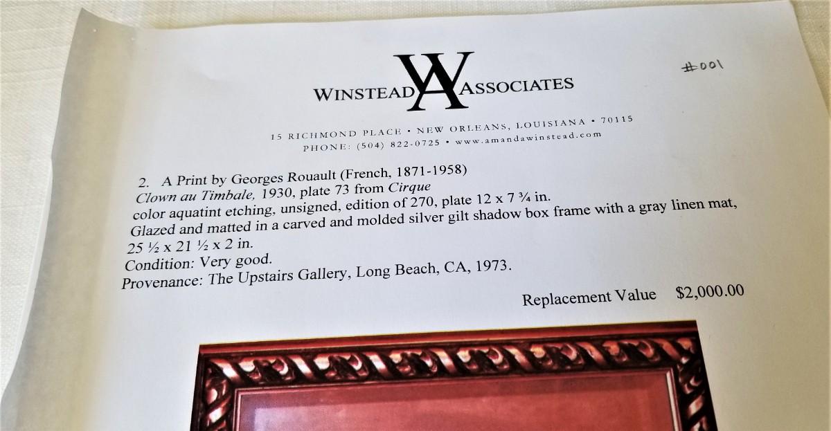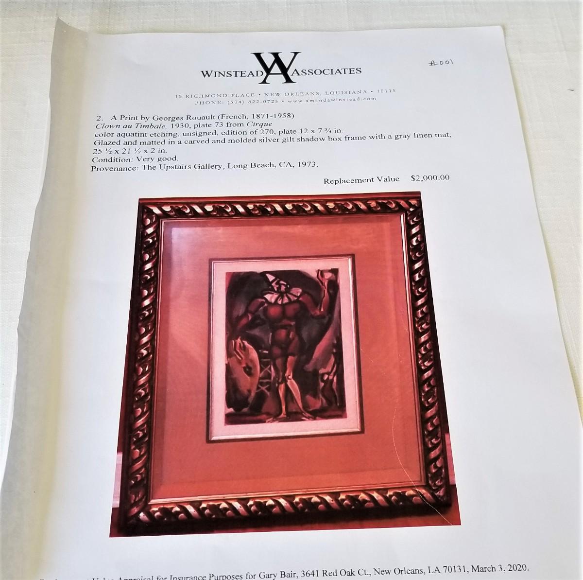 From his "Cirque" series - color aquatint etching from listed artist Georges Roualt (died 1958) entitled "Clown au Timable" - done in 1930. Rouault's work is most often associated with Impressionism. This is from an unsigned edition of 270 - plate measures 12" x 7.75", Carved and molded silver gilt shadow box frame - grey linen mat. Entire piece measures 25.5" x 21.5" x 2". This piece was recently appraised by a certified local appraiser. She stated that the insurance value is $2,000. A copy of her appraisal is included with the piece.