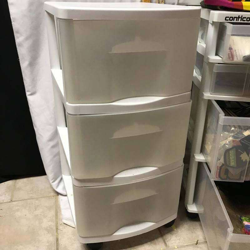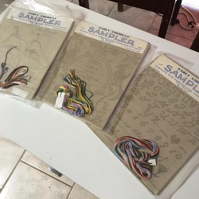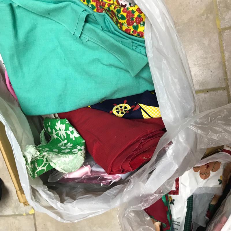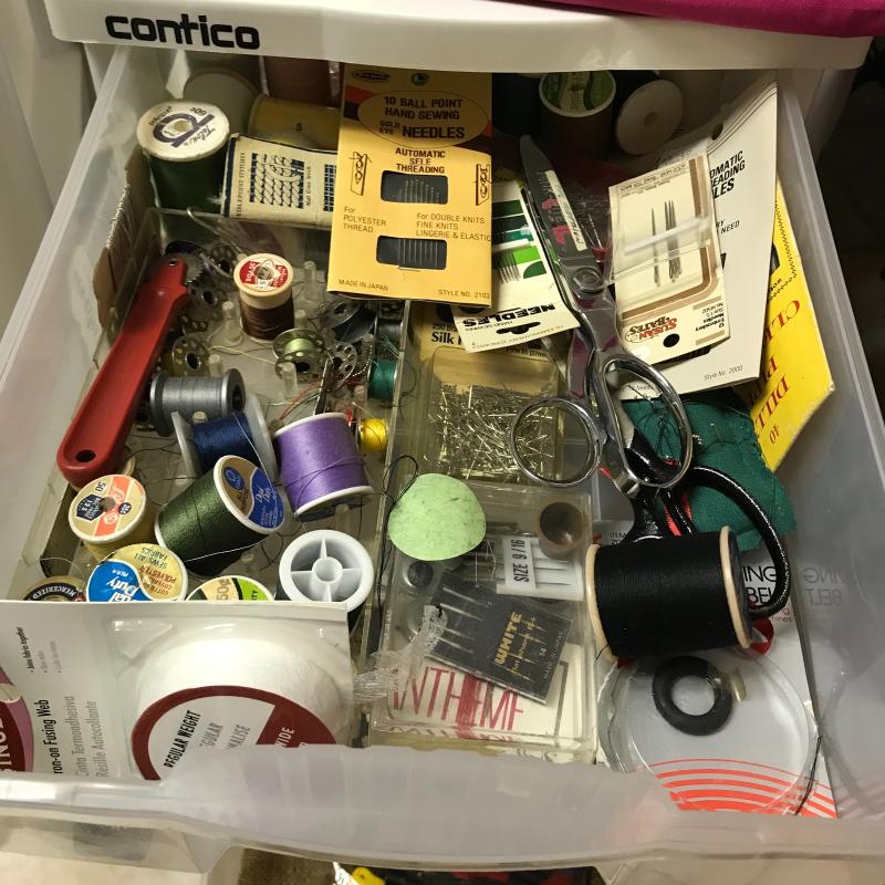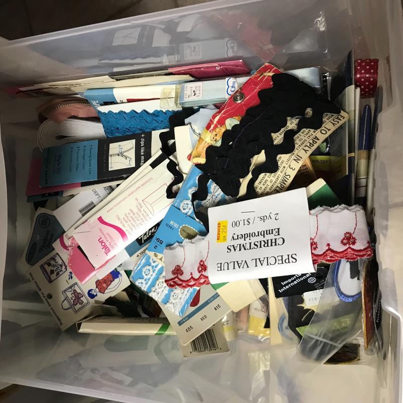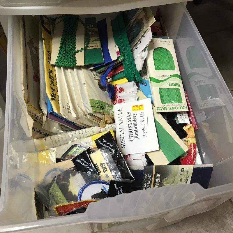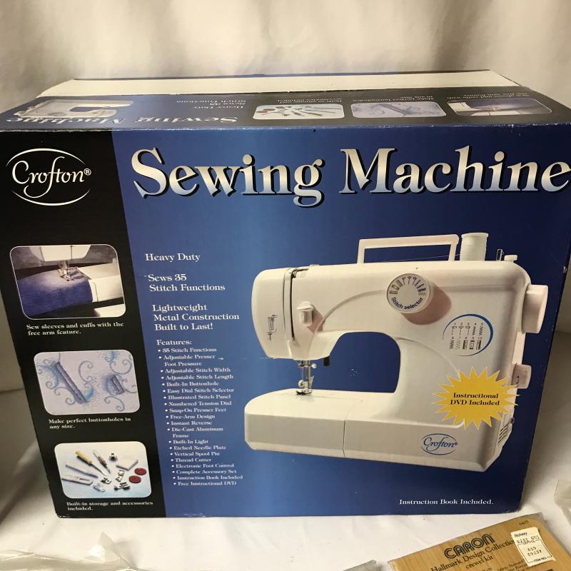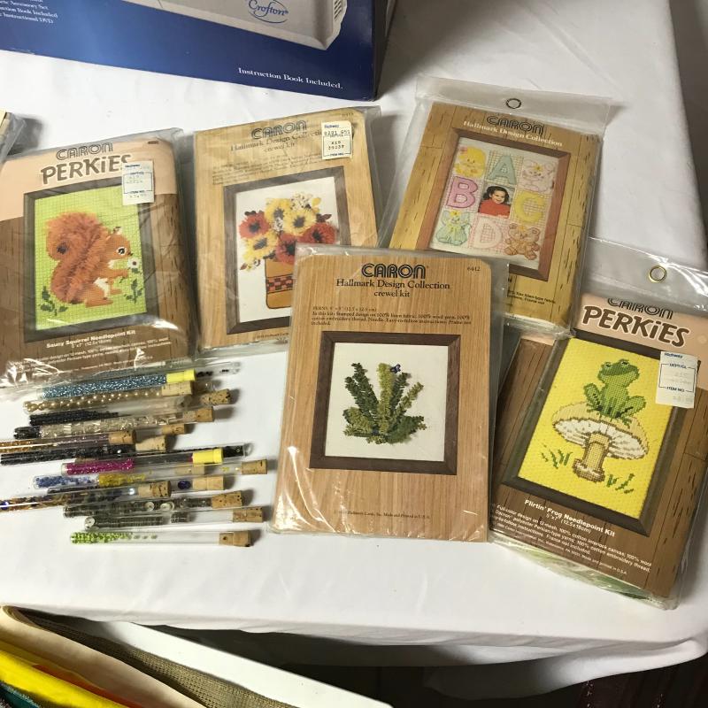 Lot contains craft and sewing supplies galore! Crofton sewing machine is new and never opened. Also included are vintage needlepoint kits, batik fabrics, two plactic craft supply carts on casters, drawers full of sewing notions, and a box of fabric. See pics. Local pickup only.