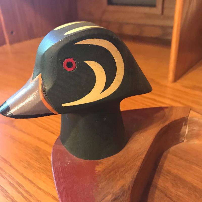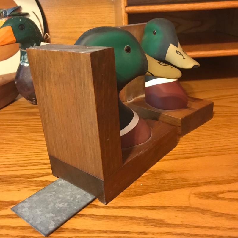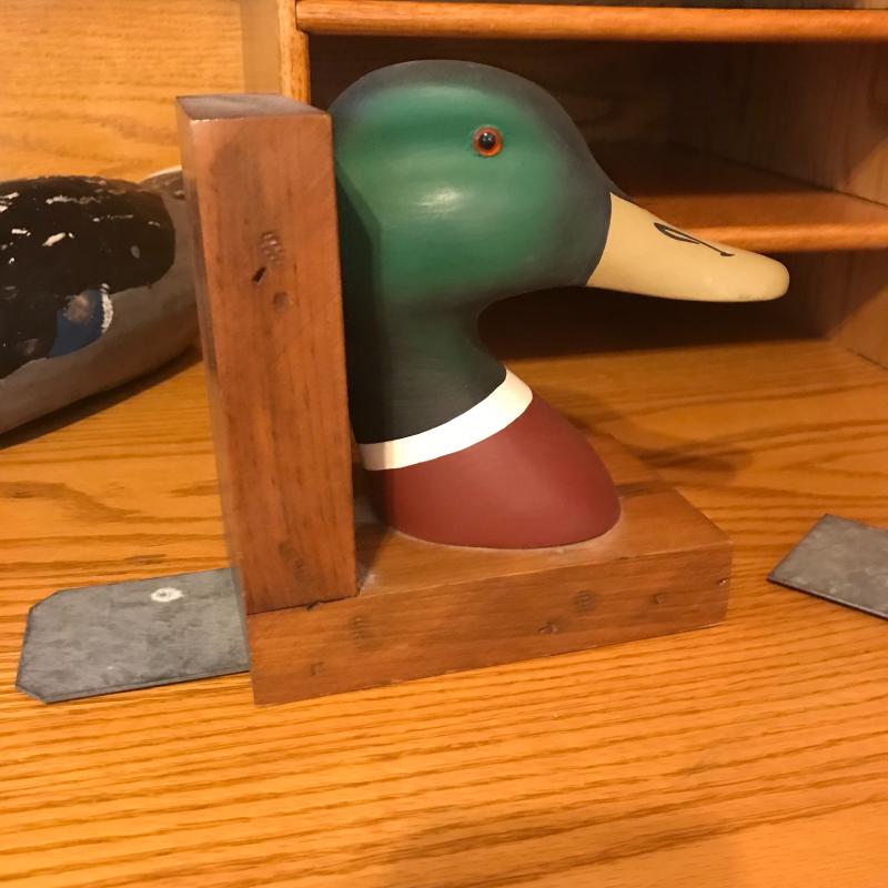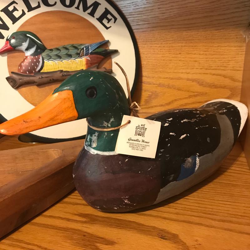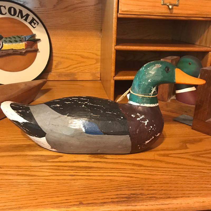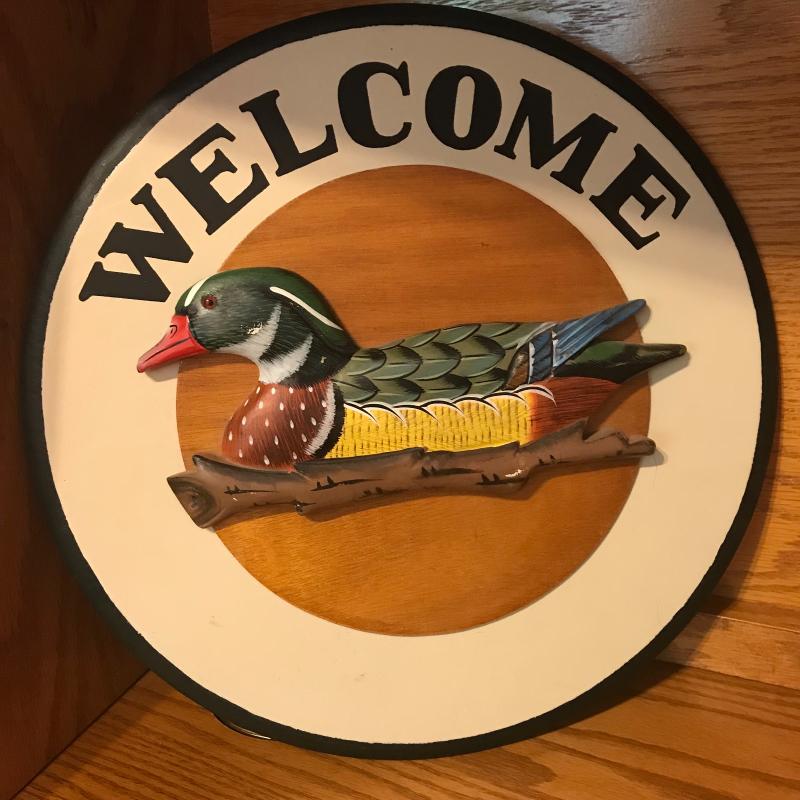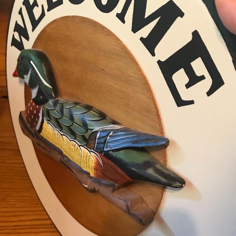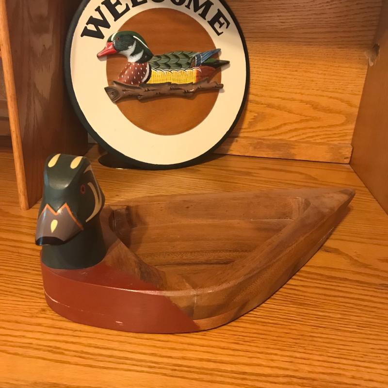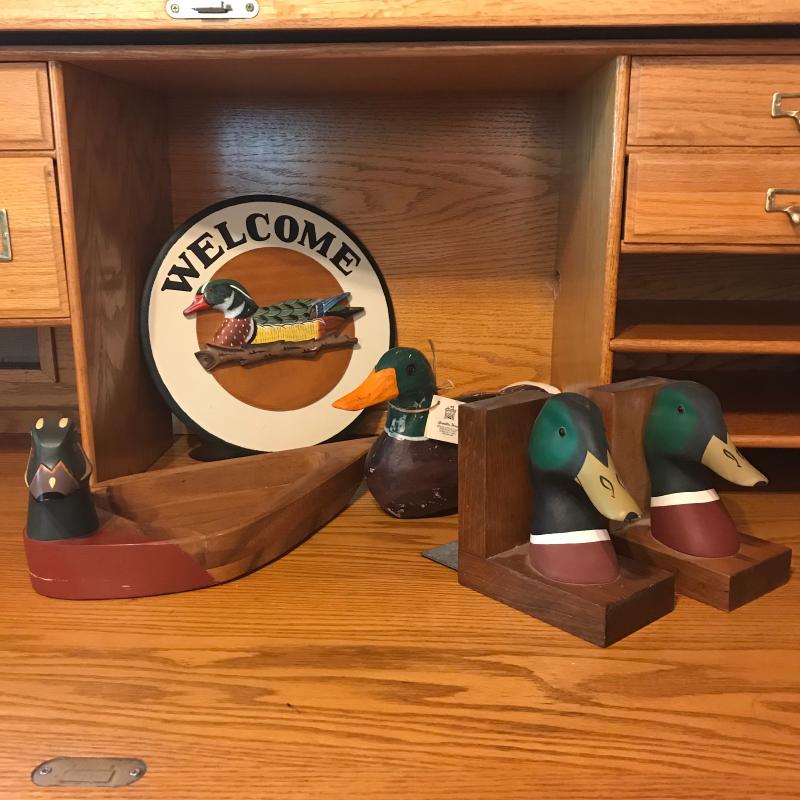 Mallard head book ends, welcome sign, decoy and wood container decor. Decoy measures 17”, sign is 13.5” dia. And container is 17” long. Lot is available for local pick up in Horseshoe, NC only.