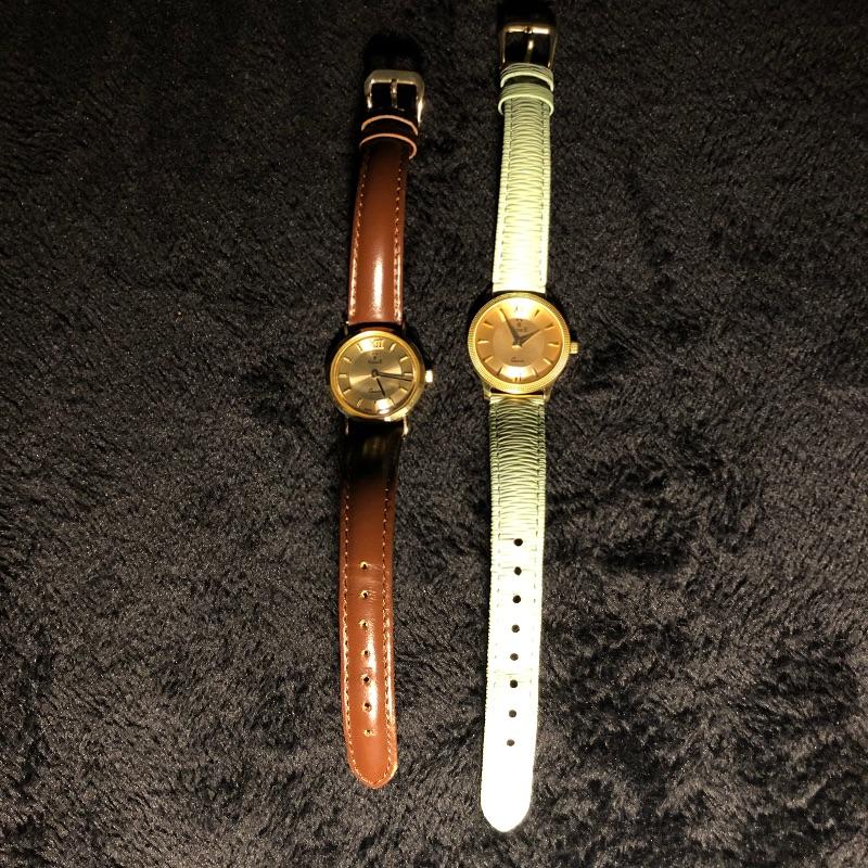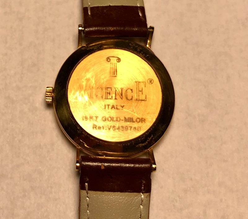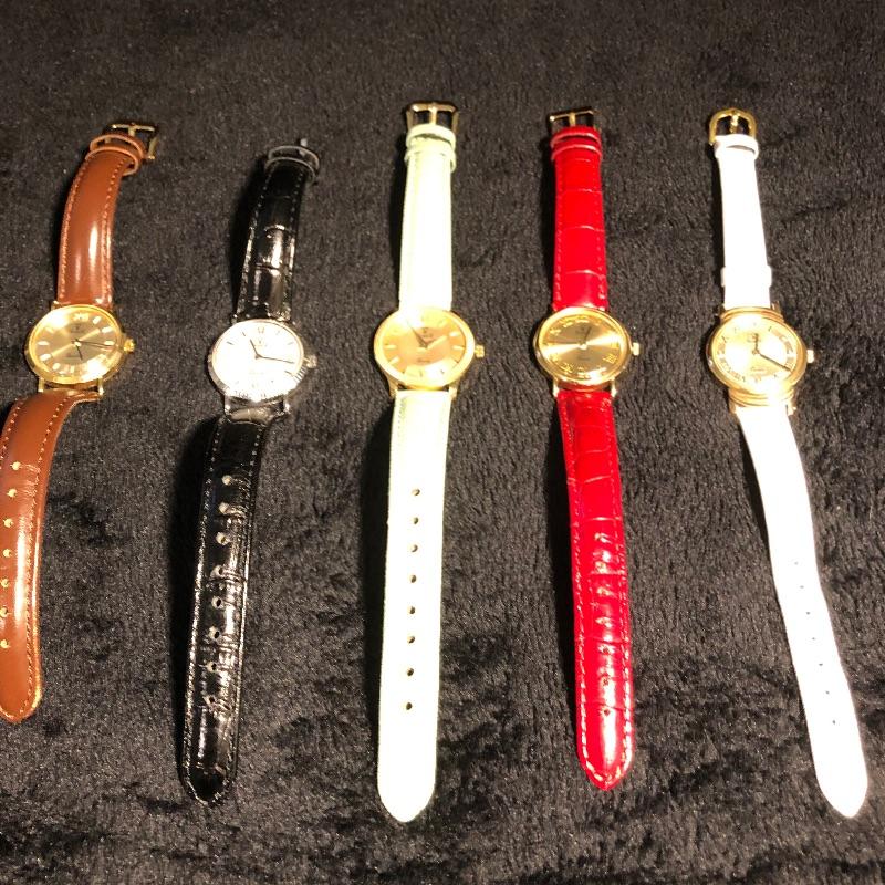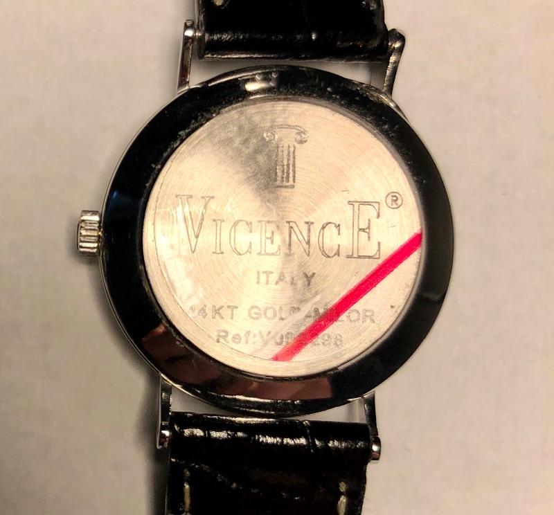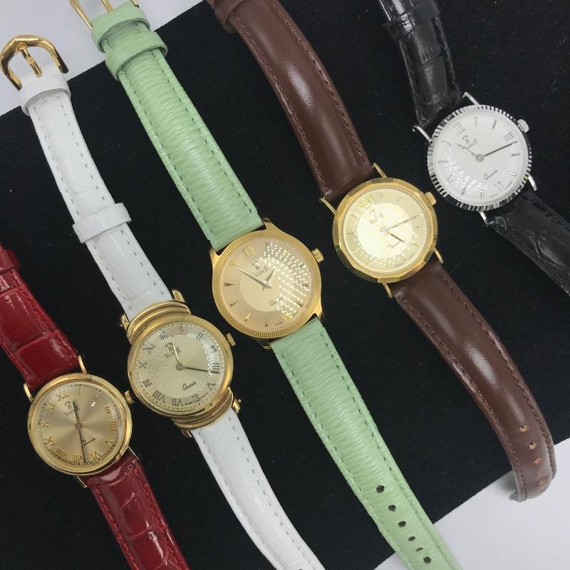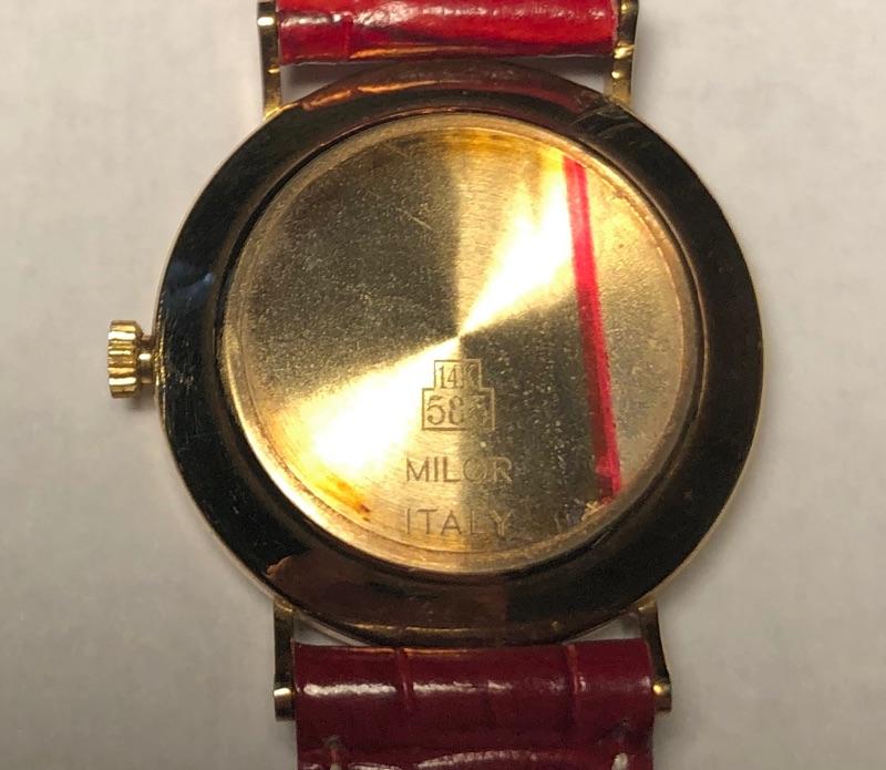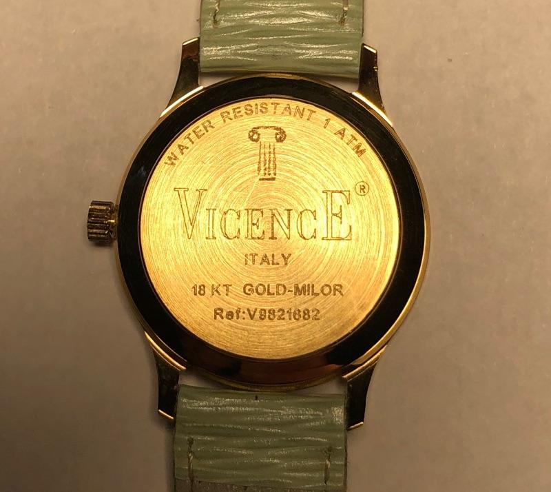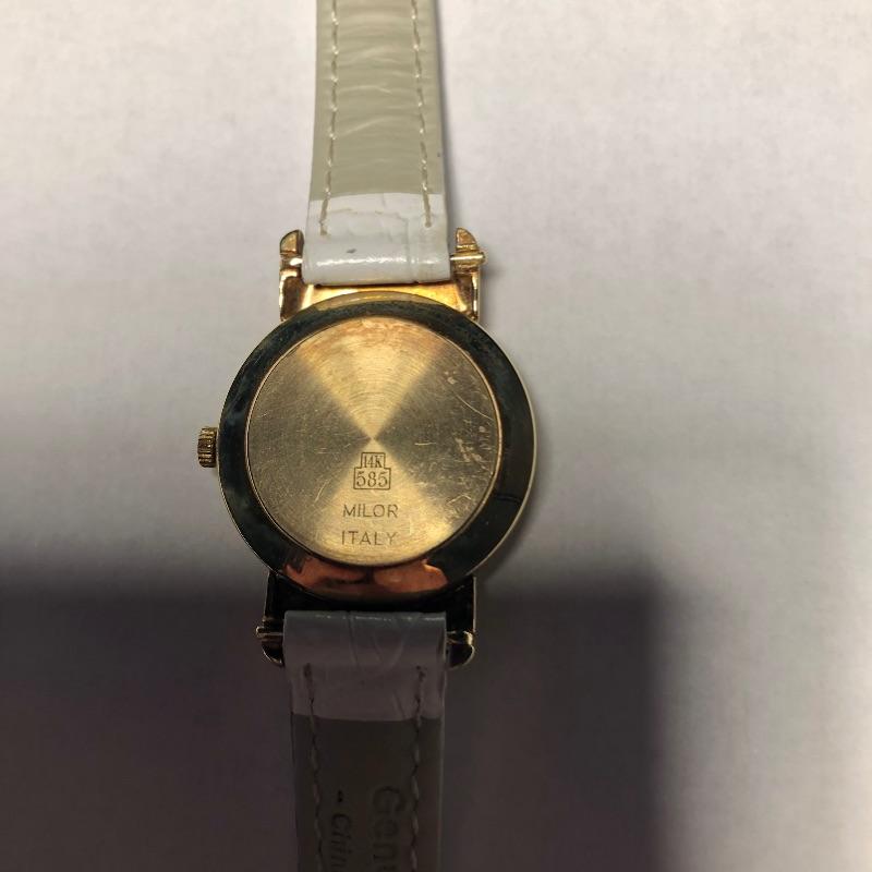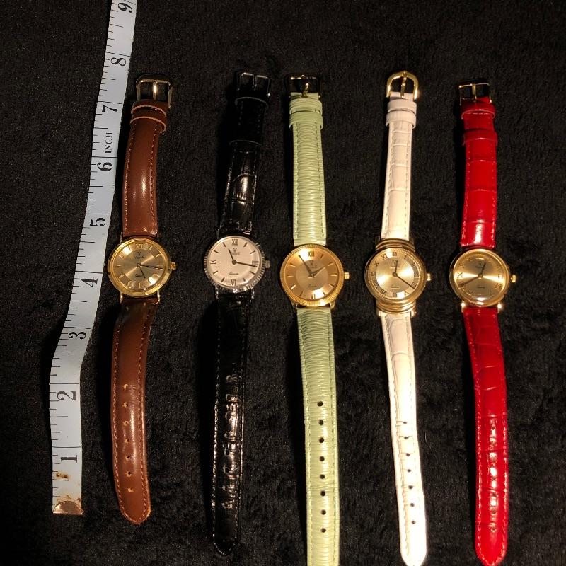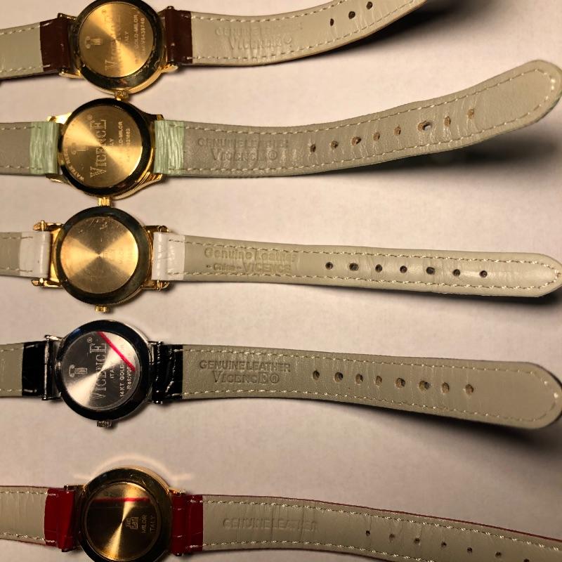 Beautiful collection of gold watches with genuine leather straps. See images as all markings are shown on the backs and on the straps. The brown and mint green strapped watches are marked 18K, the other three marked 14K. The black strapped watch appears to be white gold. All are marked Milor, Italy and all but two are also marked Vicence on the watch back. The white strapped watch has Vicence on its strap. No apparent scratches on faces and cannot verify running as batteries must be dead. These were well kept in a jewelry box for watches.