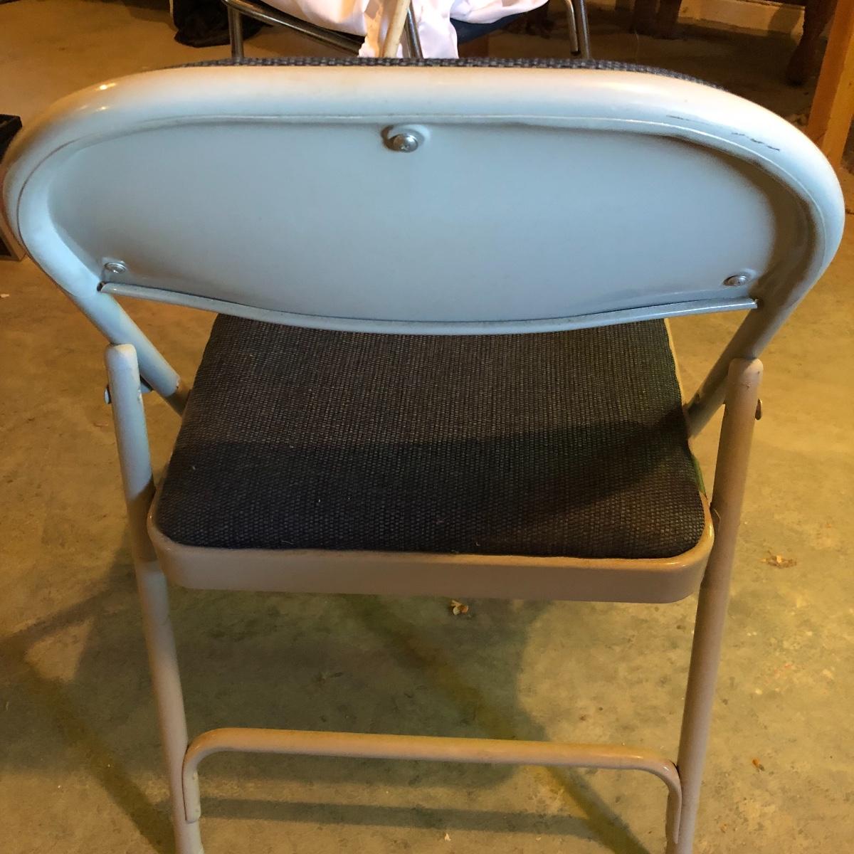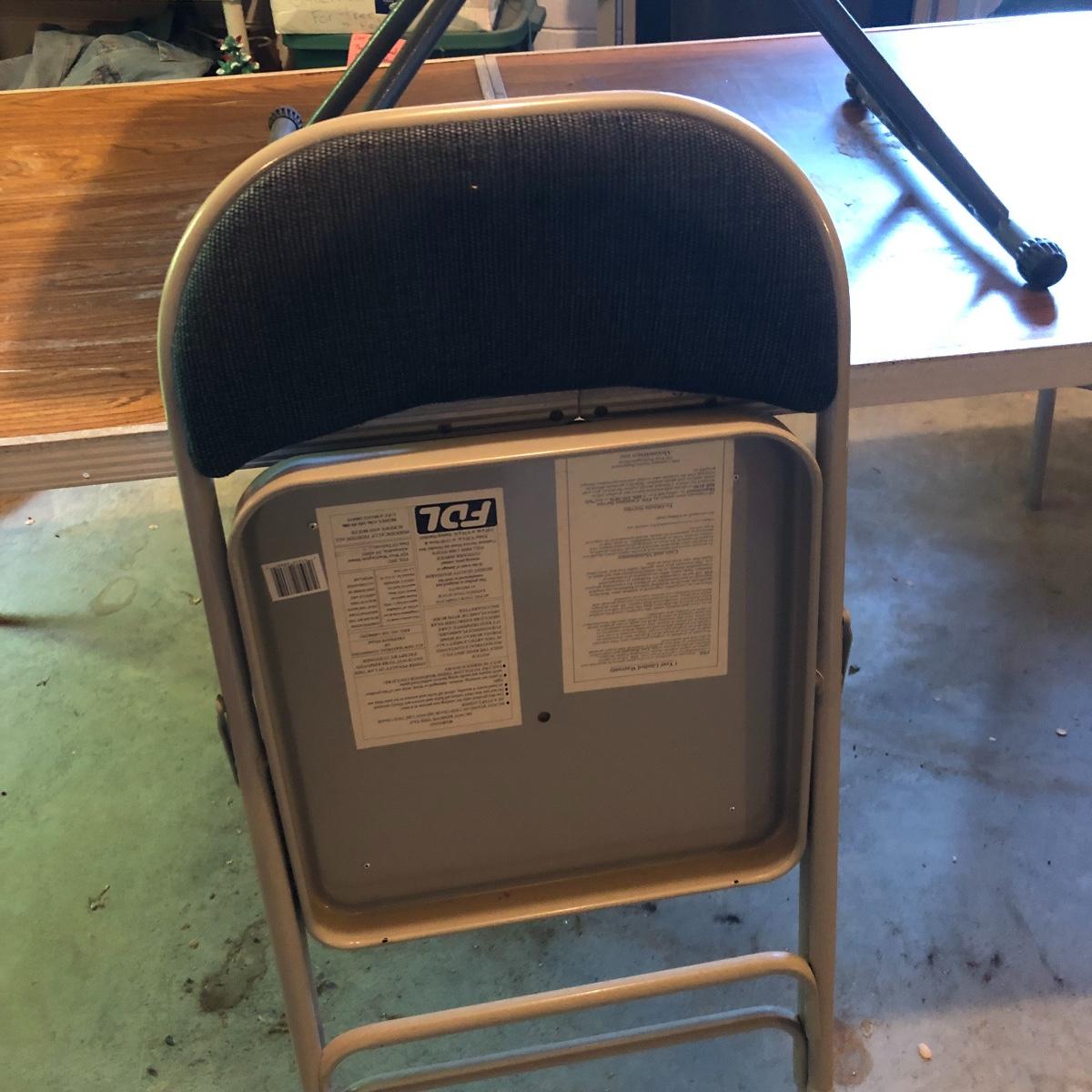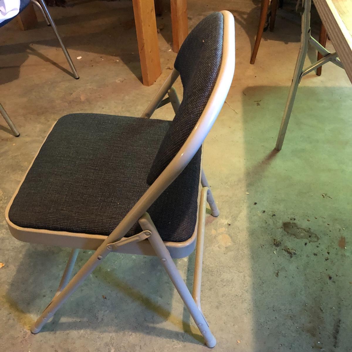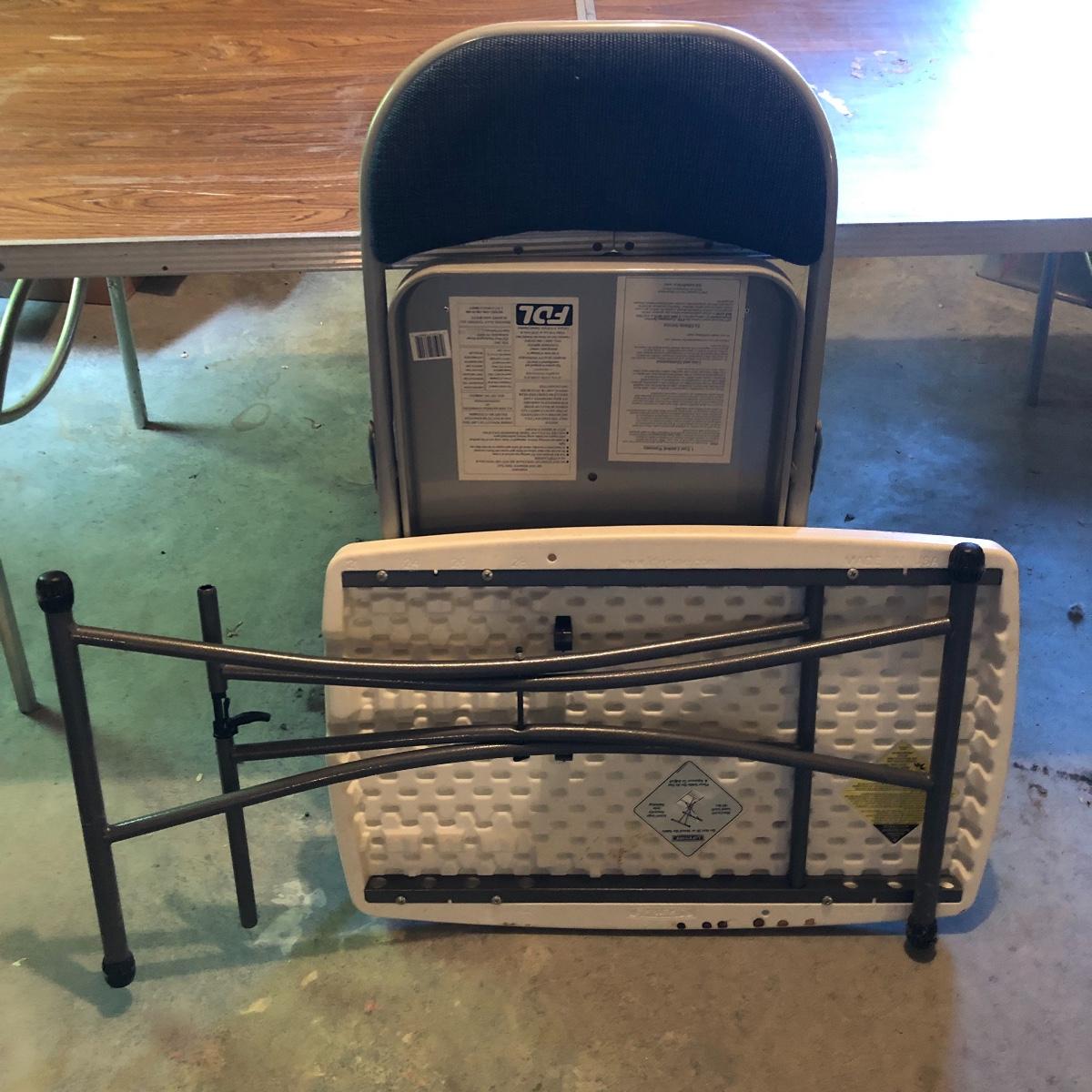 This lot consists of three items: an upholstered folding chair, a small plastic white table and a larger brown folding table.