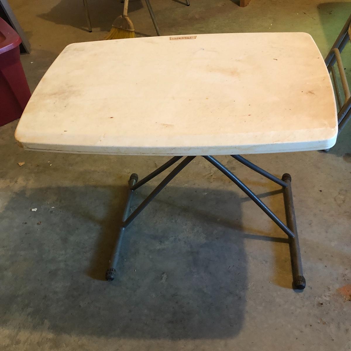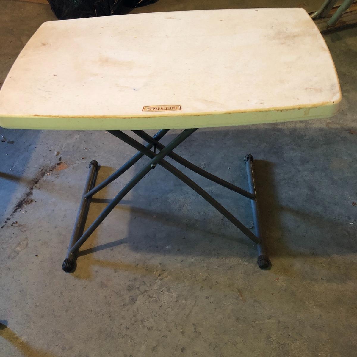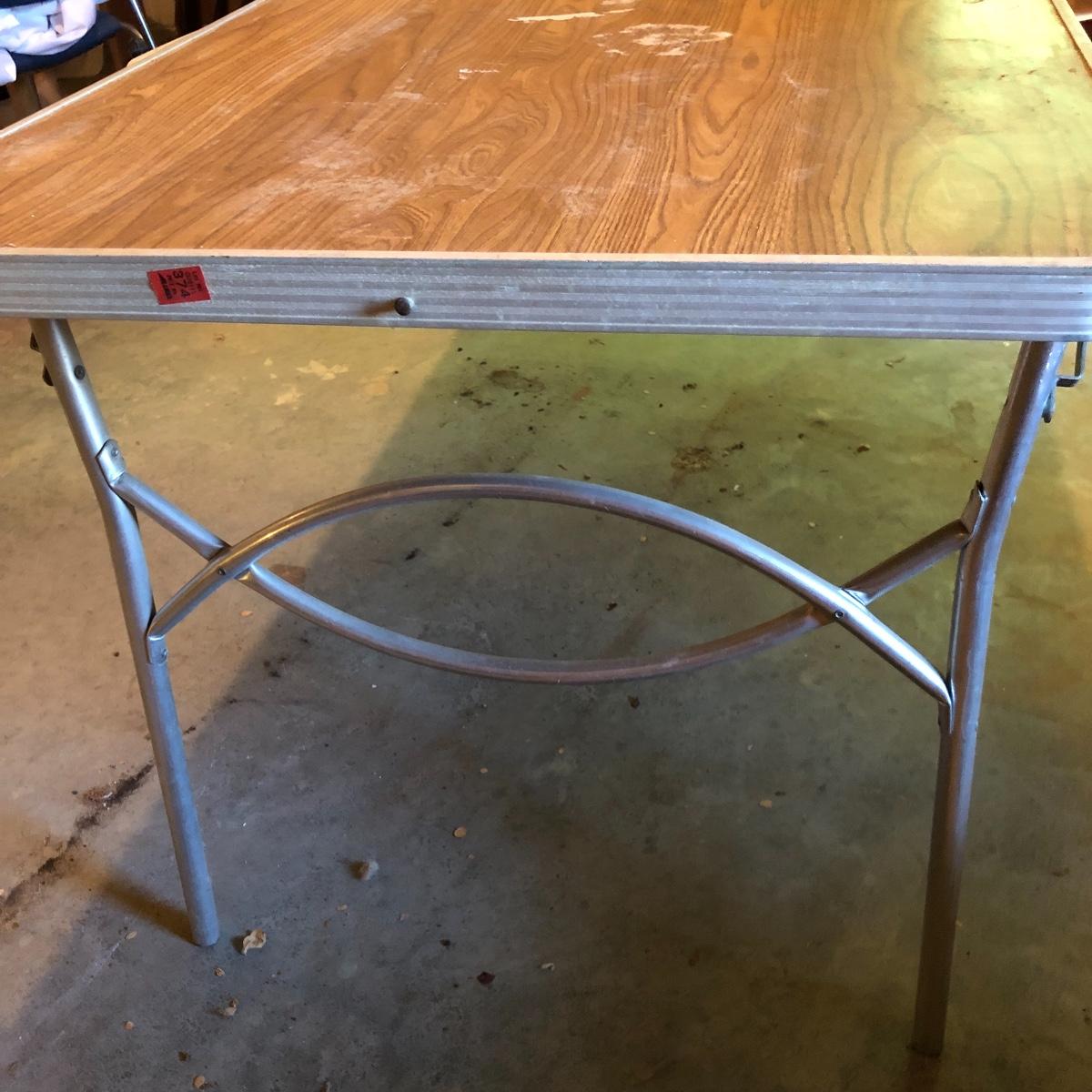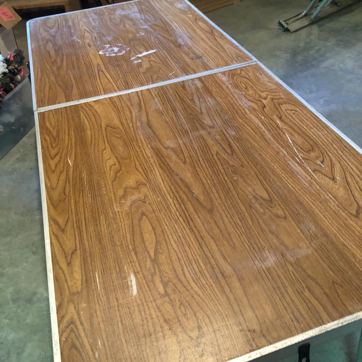 The white table measures 30” x 19 1/2”. The height is also adjustable. The brown folding table measures 72” x 30”. Please note the marks on the top of the brown table which may come off with some cleaning. Local Pickup Only.