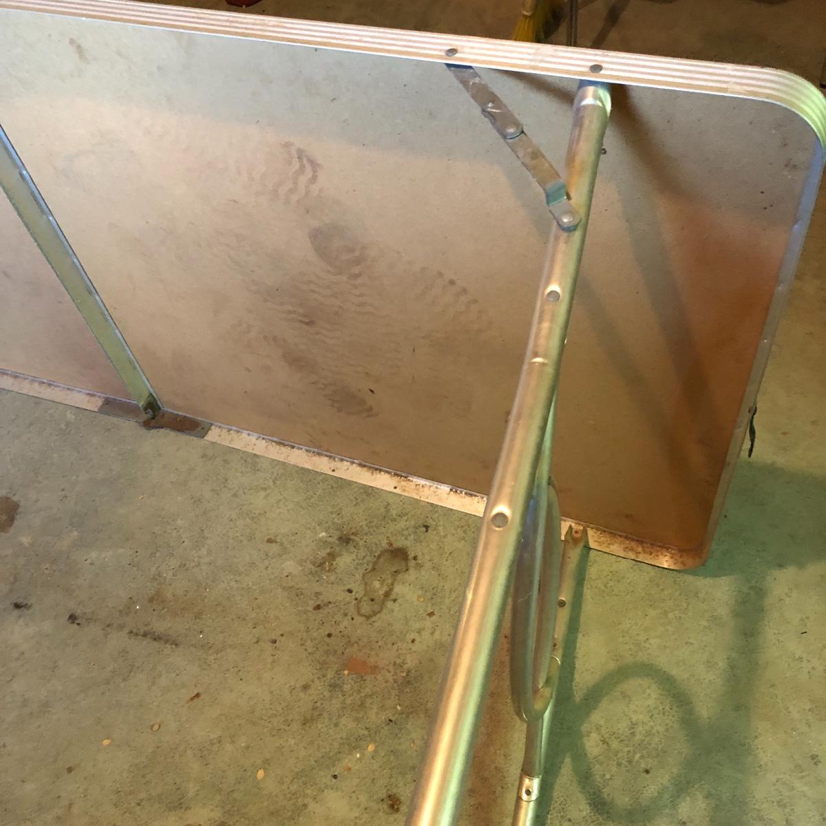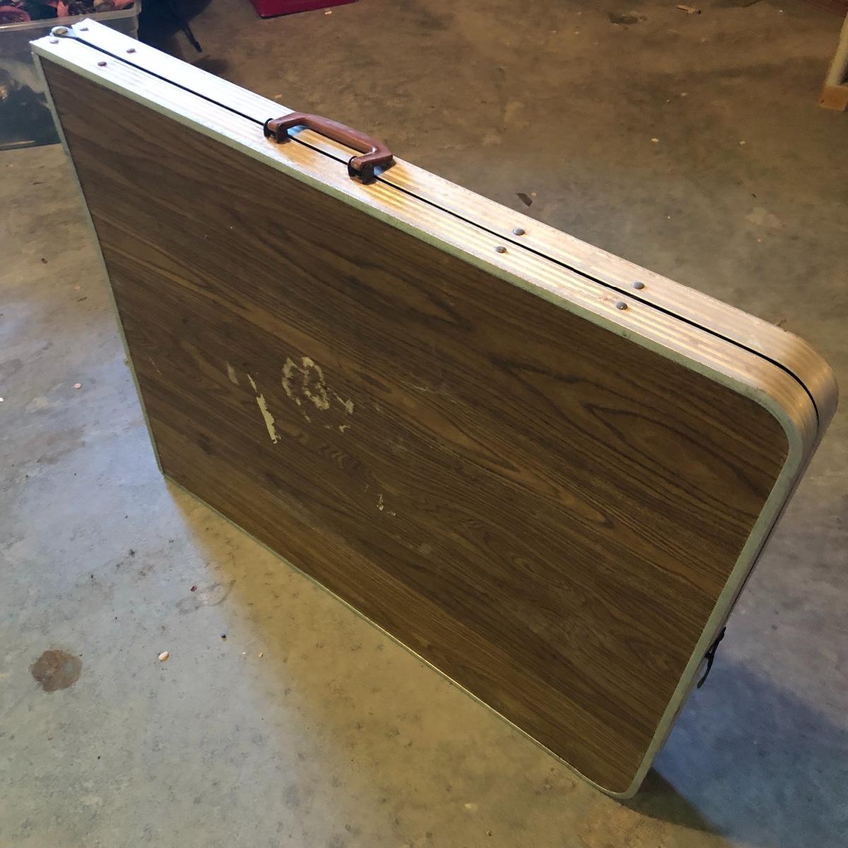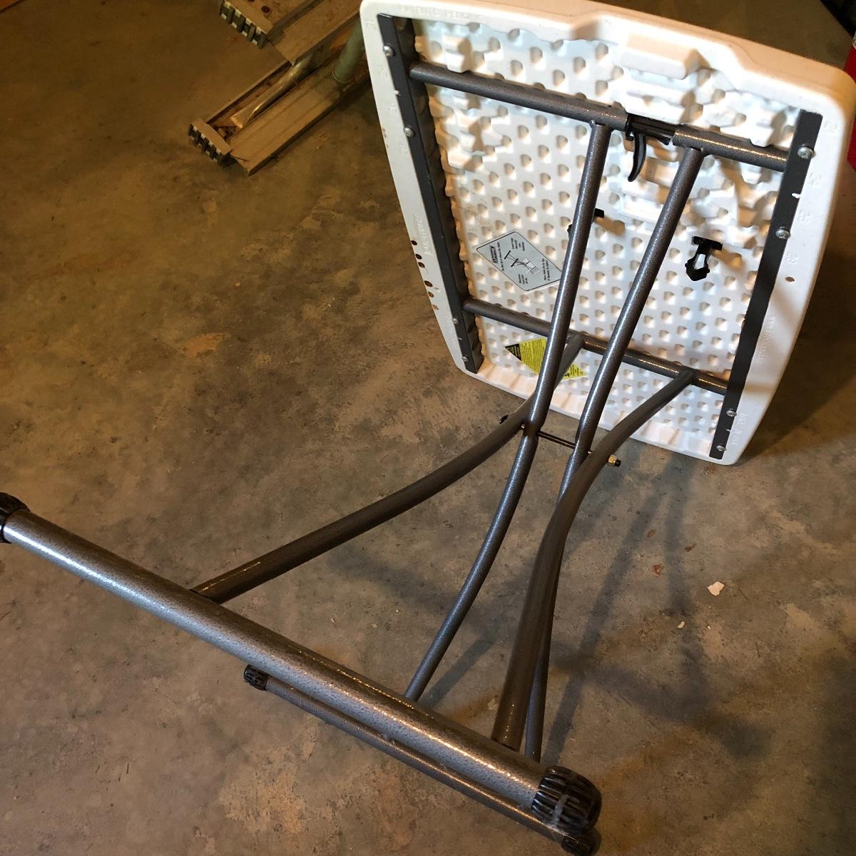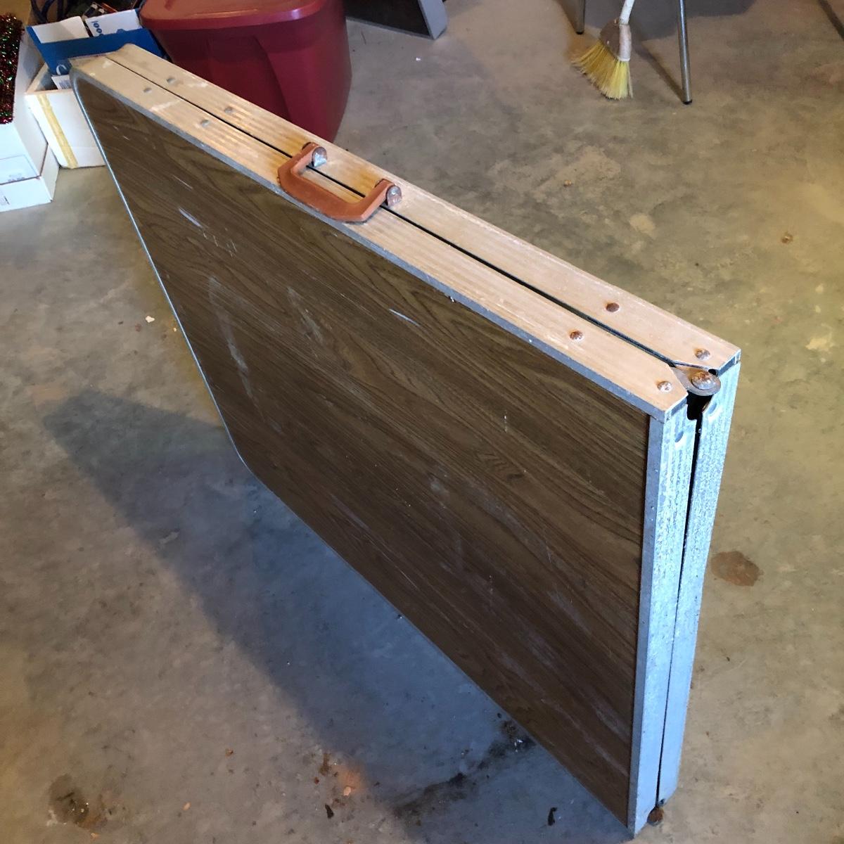 The white table measures 30” x 19 1/2”. The height is also adjustable. The brown folding table measures 72” x 30”. Please note the marks on the top of the brown table which may come off with some cleaning. Local Pickup Only.