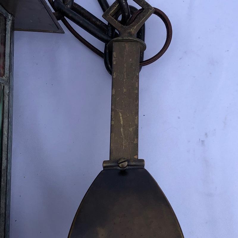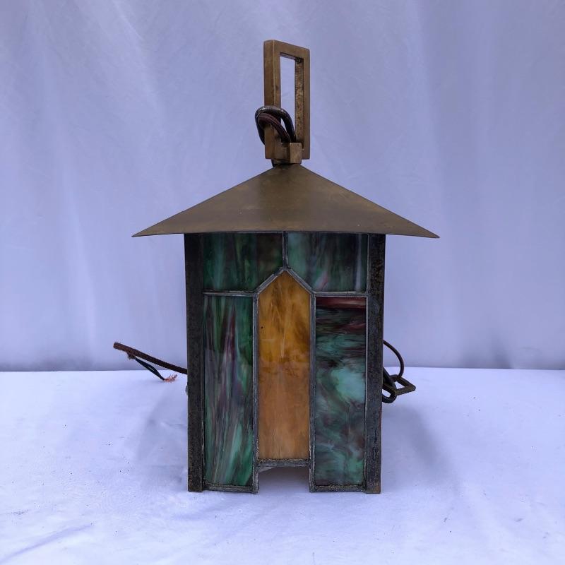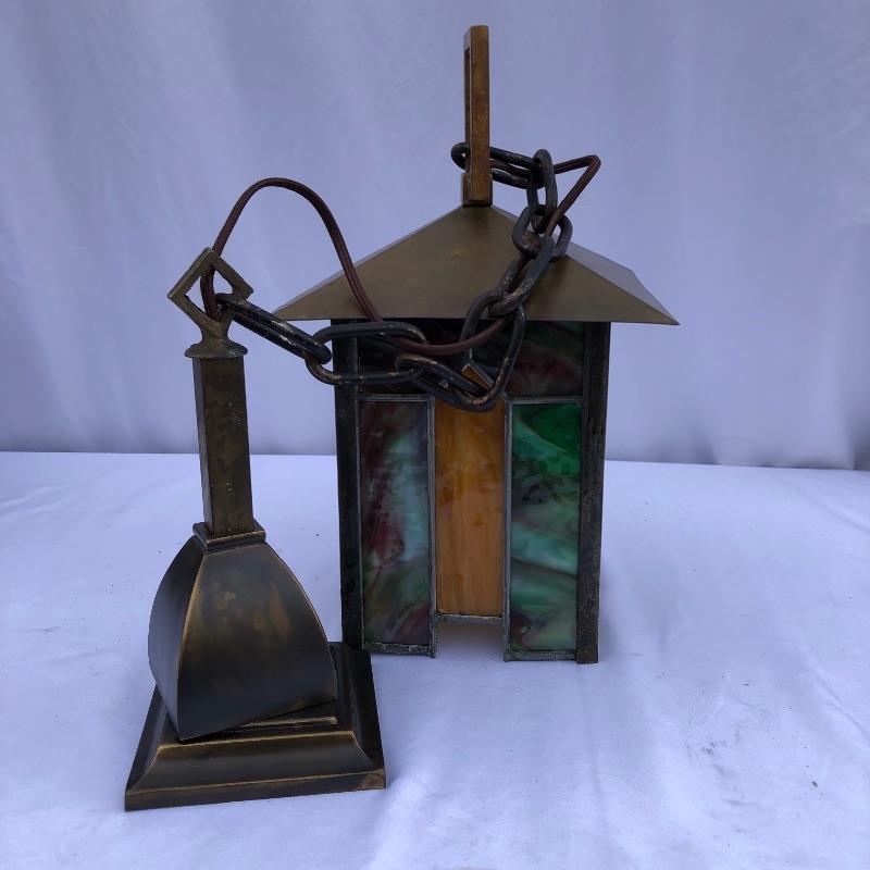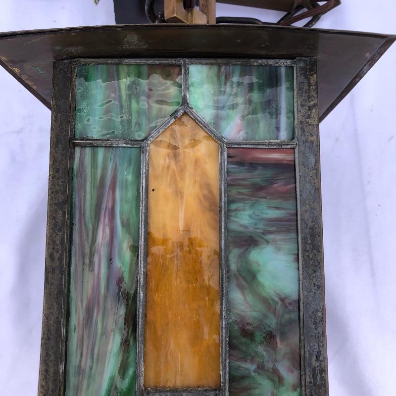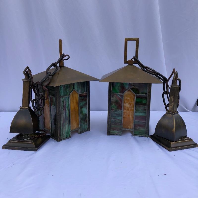 These matching pendant lamps with stained glass in rich yet muted colors of purple, green, blue and gold are a nice addition to any collection and can also stand on their own with charm and elegance.