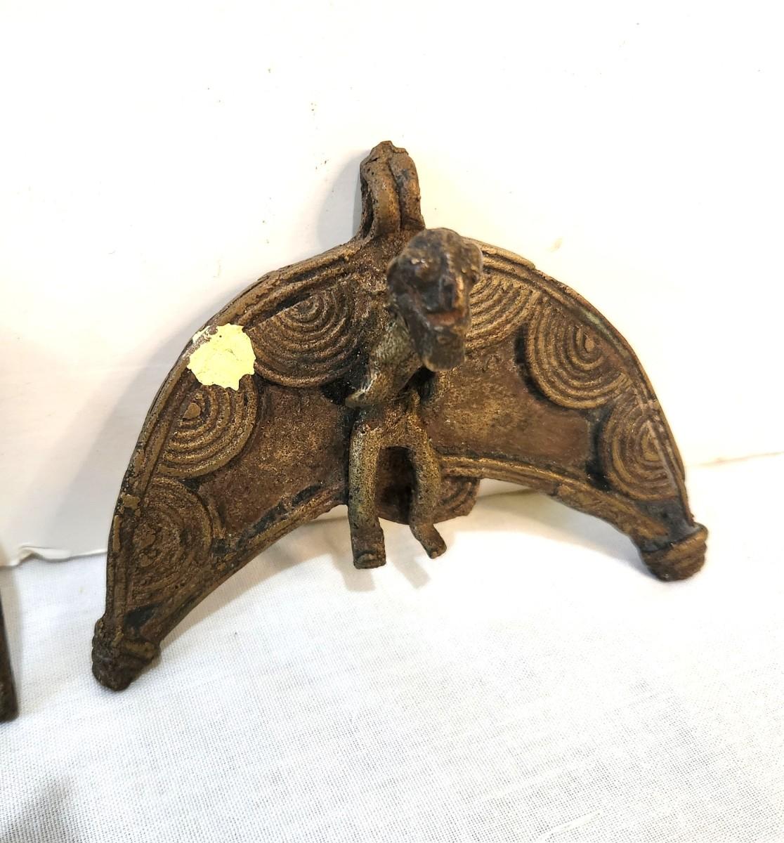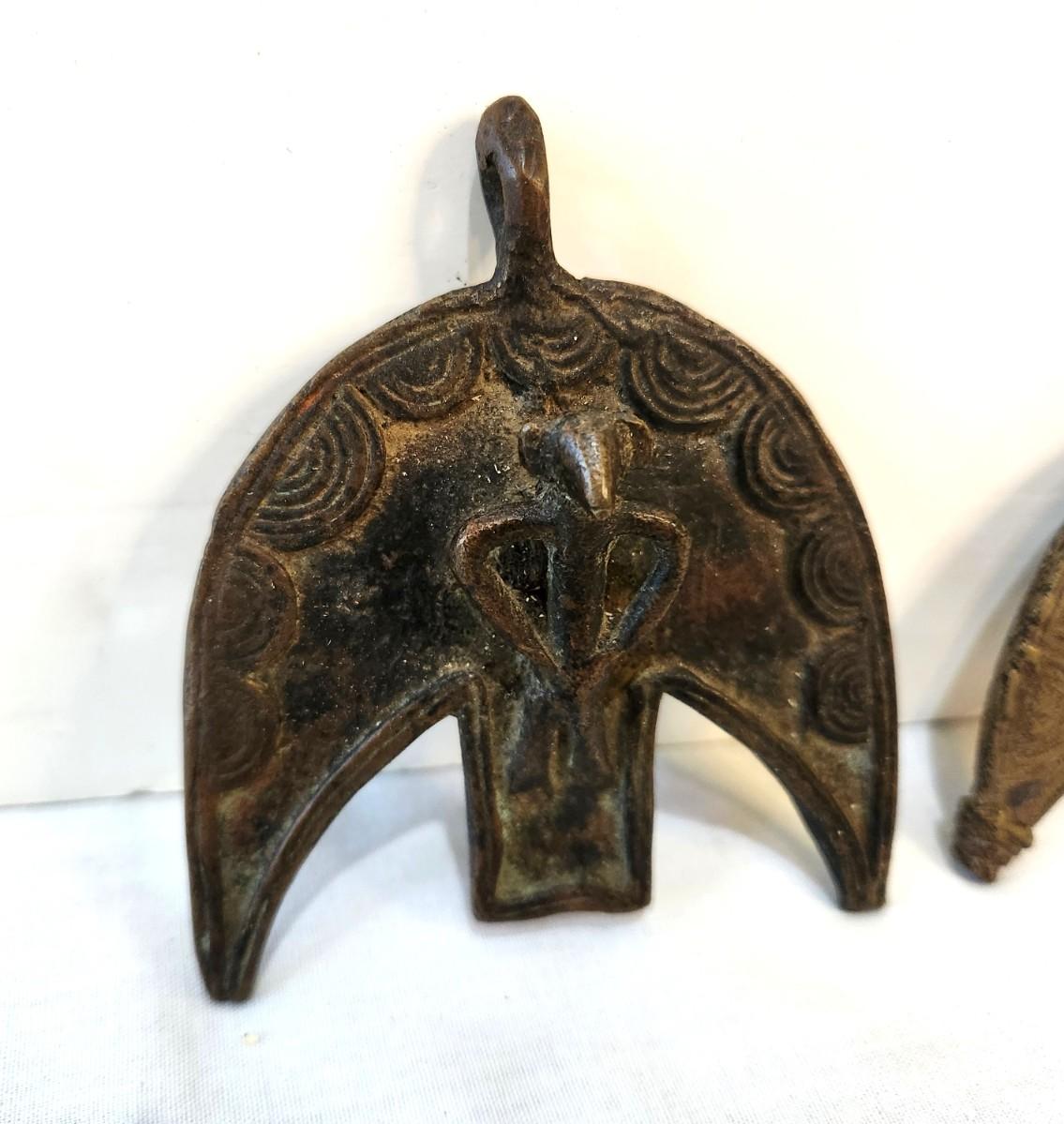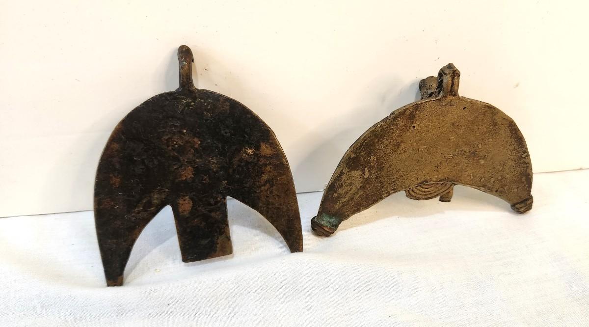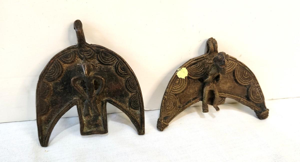 Lot of 2 Mossi Tribe (Western Africa) bronze pendants. Largest is 5" across, the one on the left is 4" tall. Piece on right has a drop of paint on one wing - easily removed. These are from the first half of the 20th century.