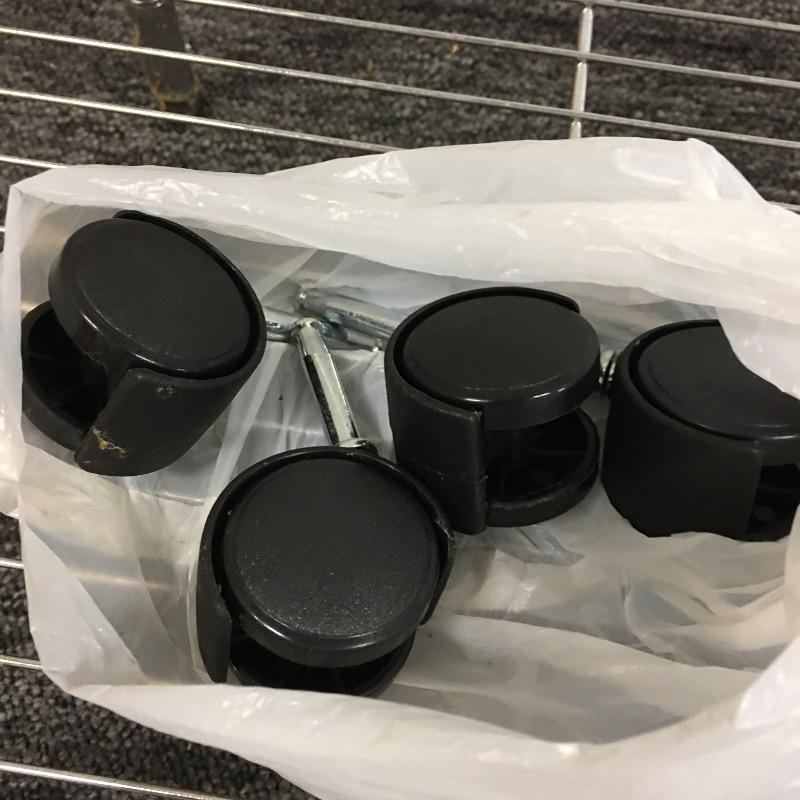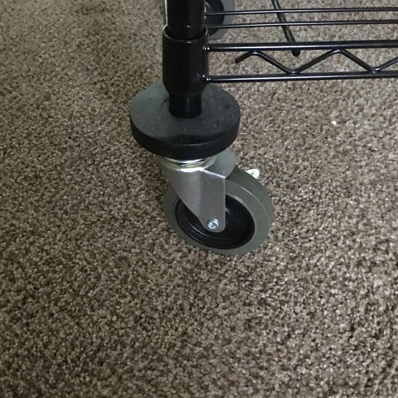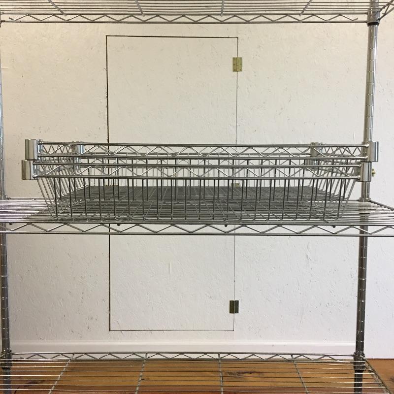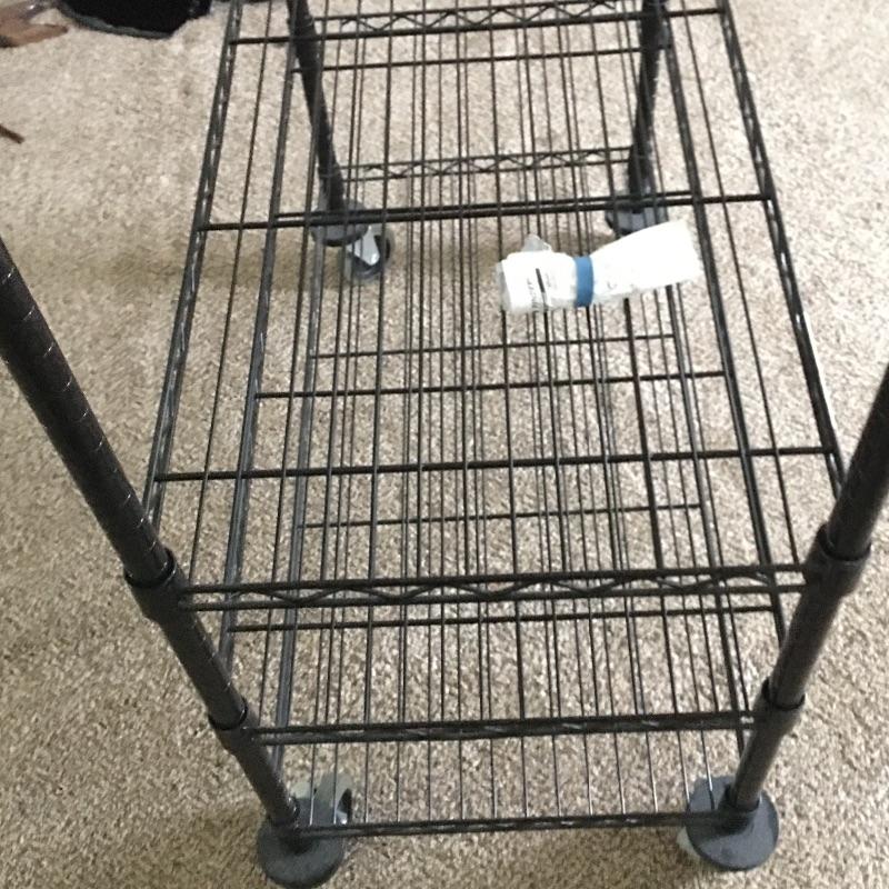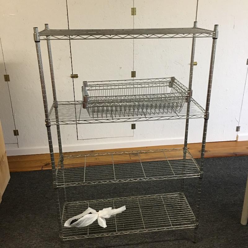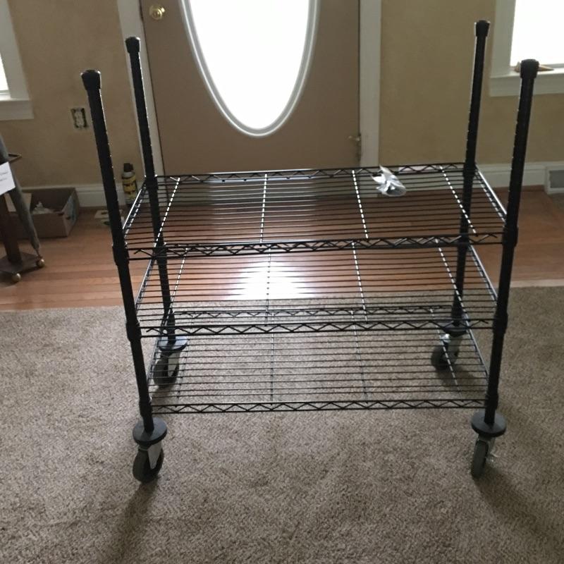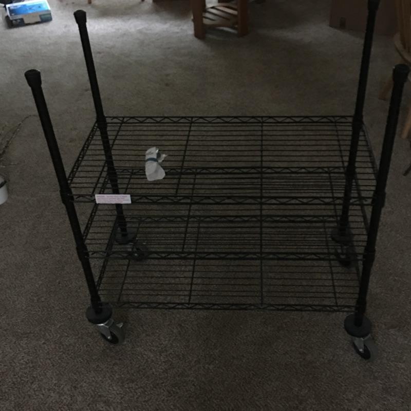 Pair of Heavy duty metal shelves. Lot includes black metal shelf with wheels and three small auxiliary shelves that measure 18” x 36” x 41”. A second silver shelf with separated wheels in bag and four shelves that measures 13.25” x 35” x 53.25”. The two baskets shown with silver shelves do not appear to fit on shelving unit. Both units have adjustable shelves.