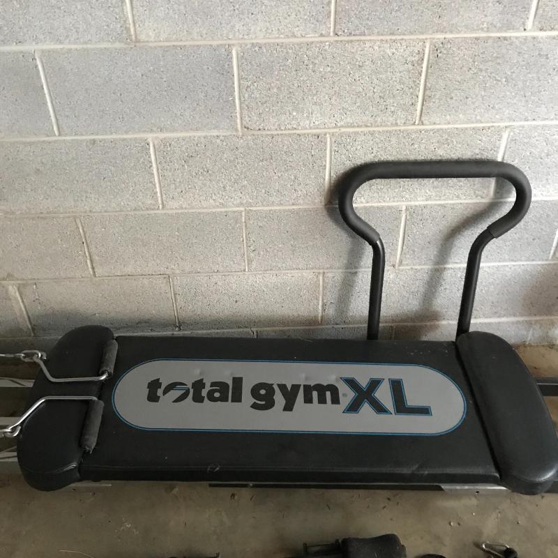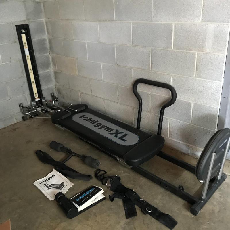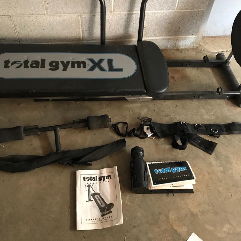 Total Gym for your home exercise routine. Lot includes all parts pictured including owner’s manual and exercise flip chart. Equipment was stored in garage and needs cleaning. No shipping.